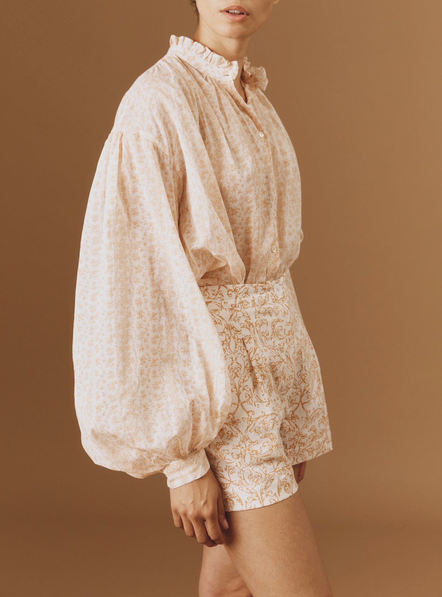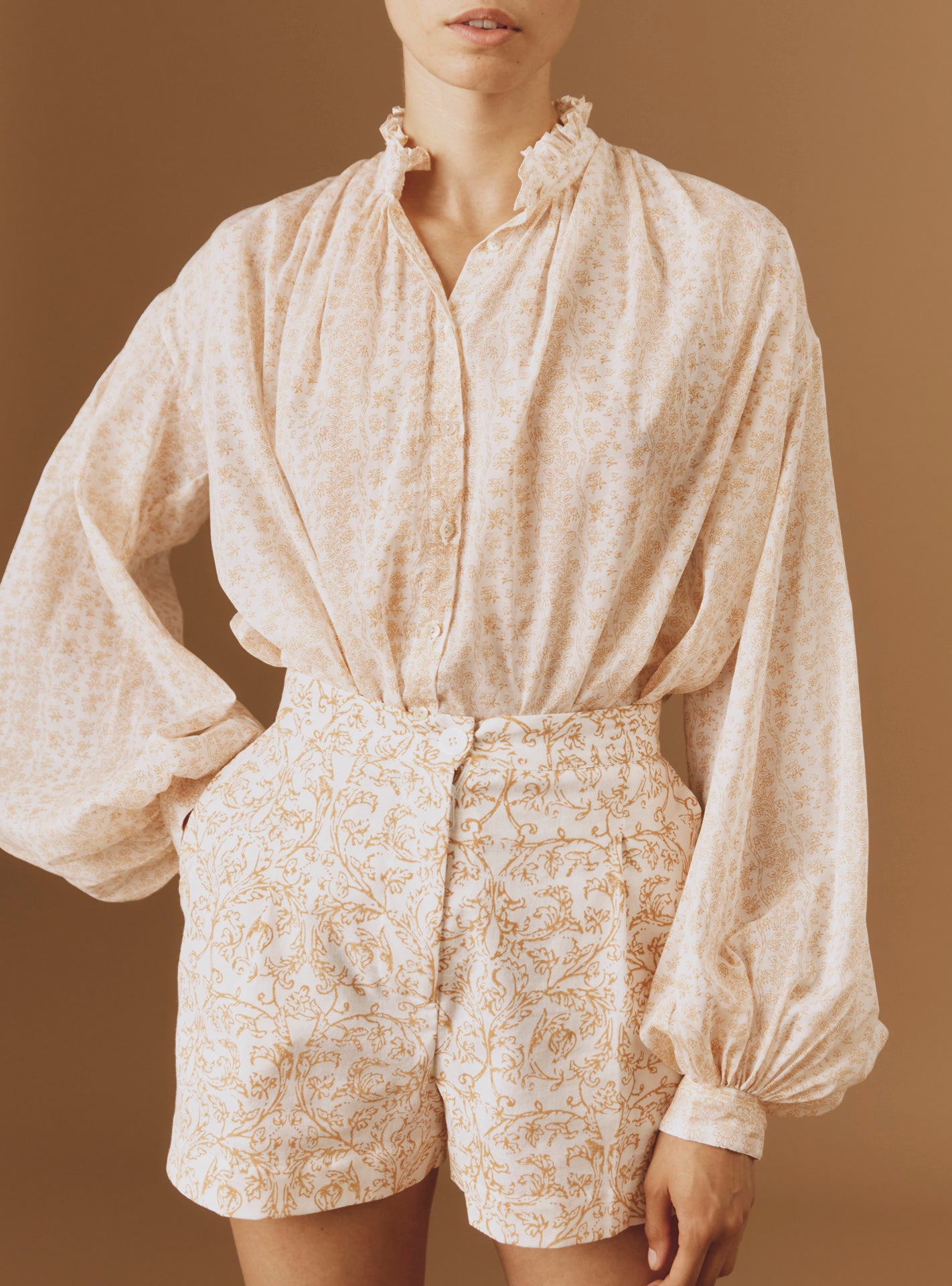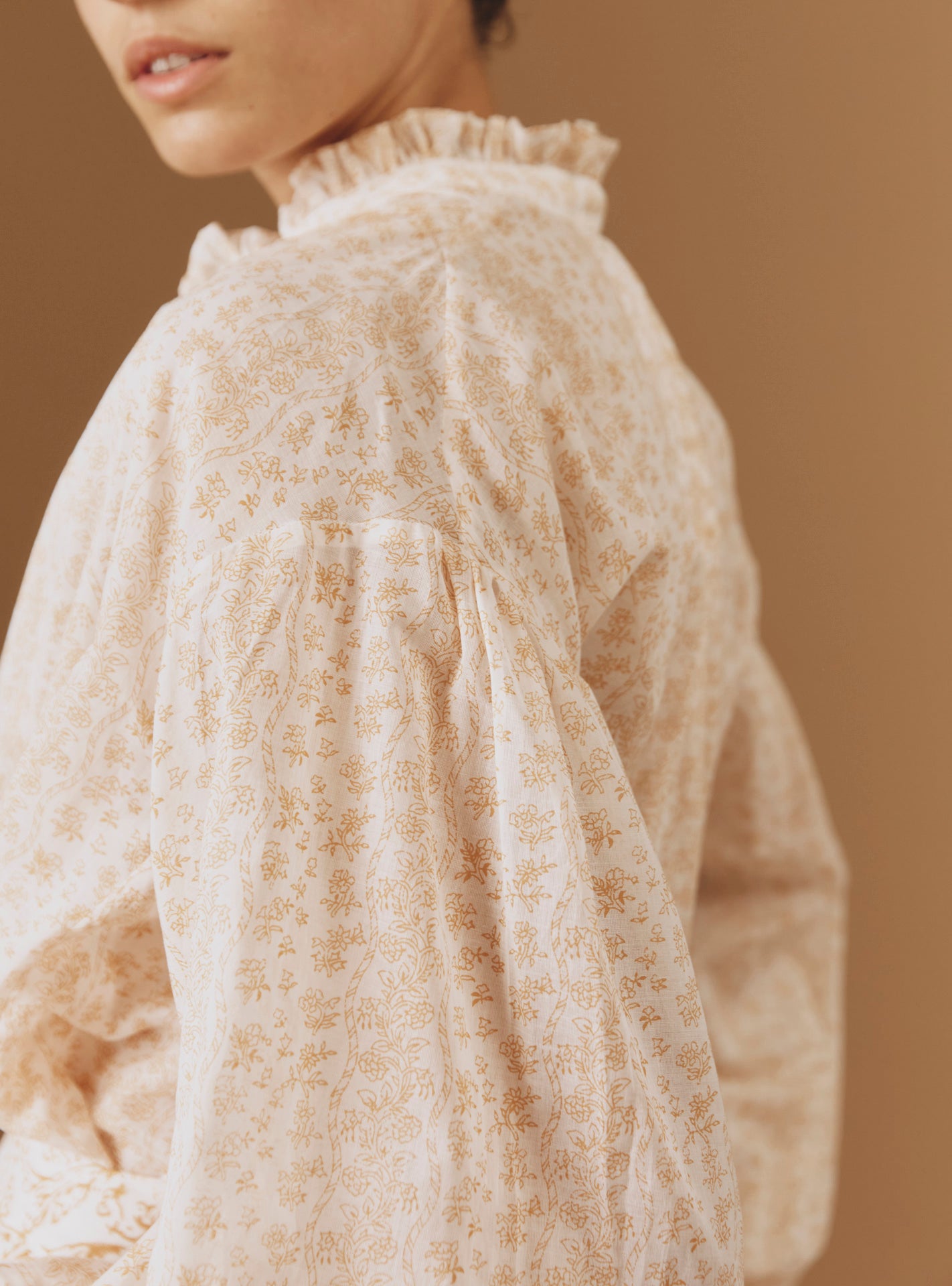 The Spring-Summer 23 version of the SLAVA blouse is hand-block printed on a soft cotton voile in a shade of Brandy new color of the season.