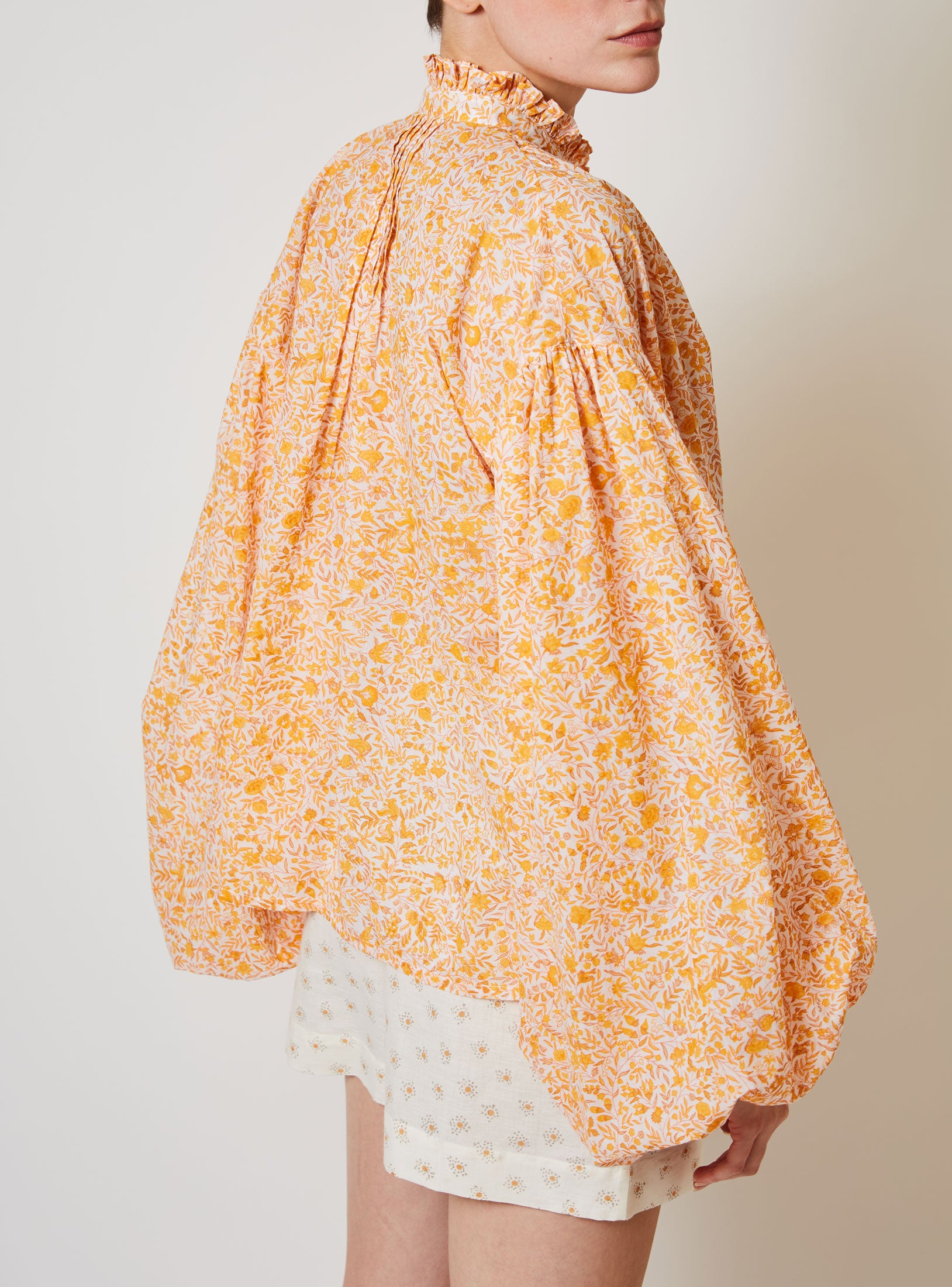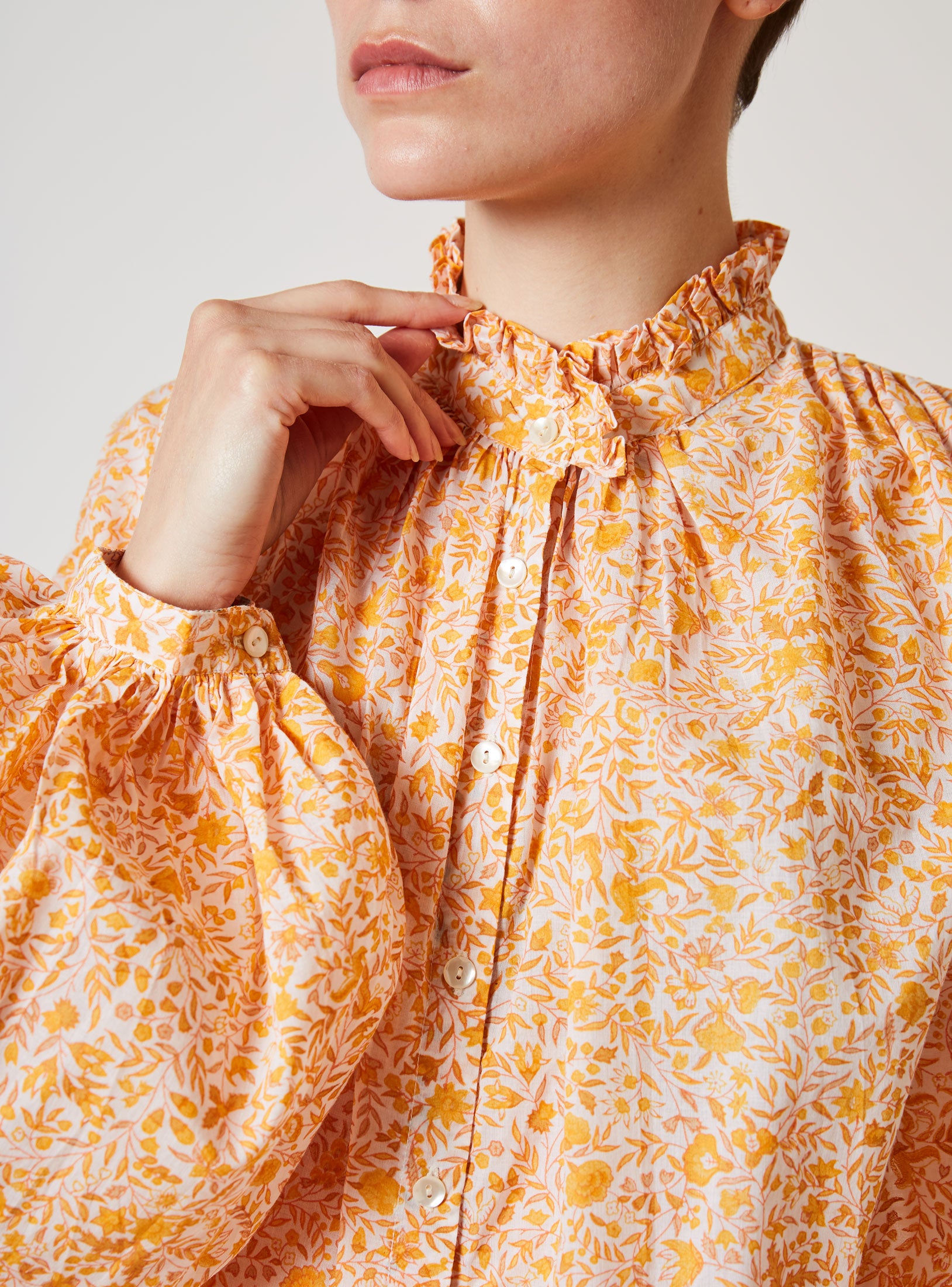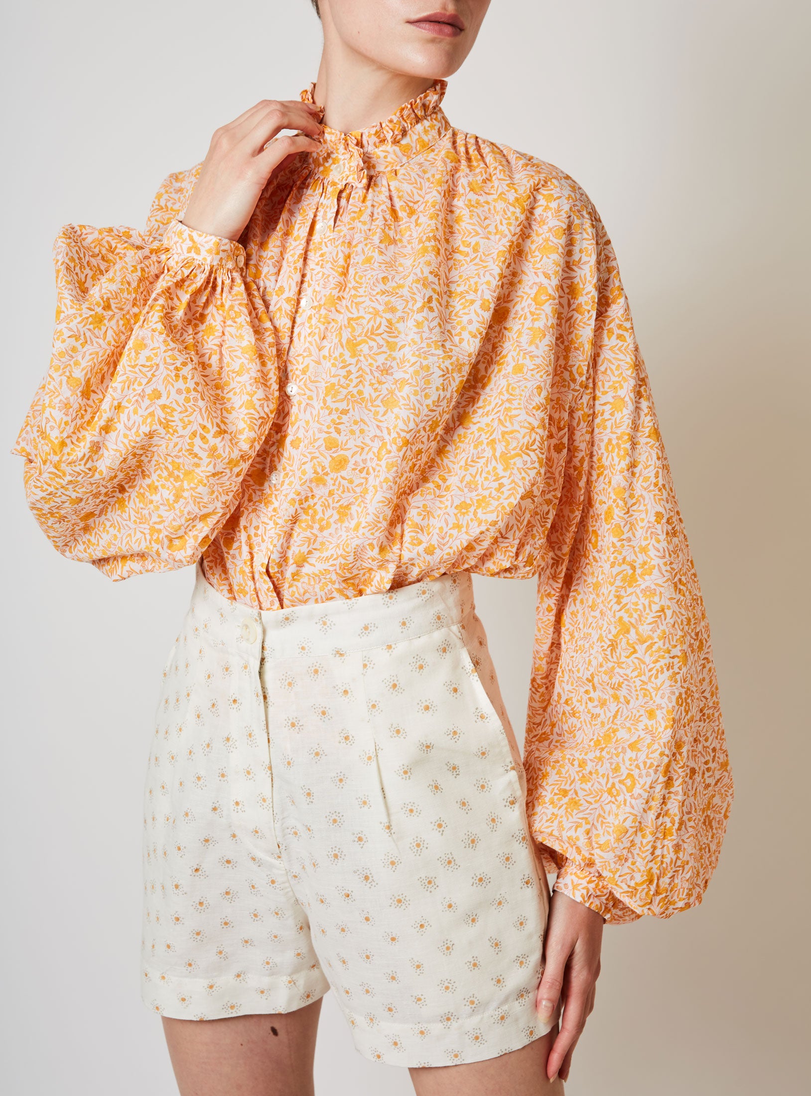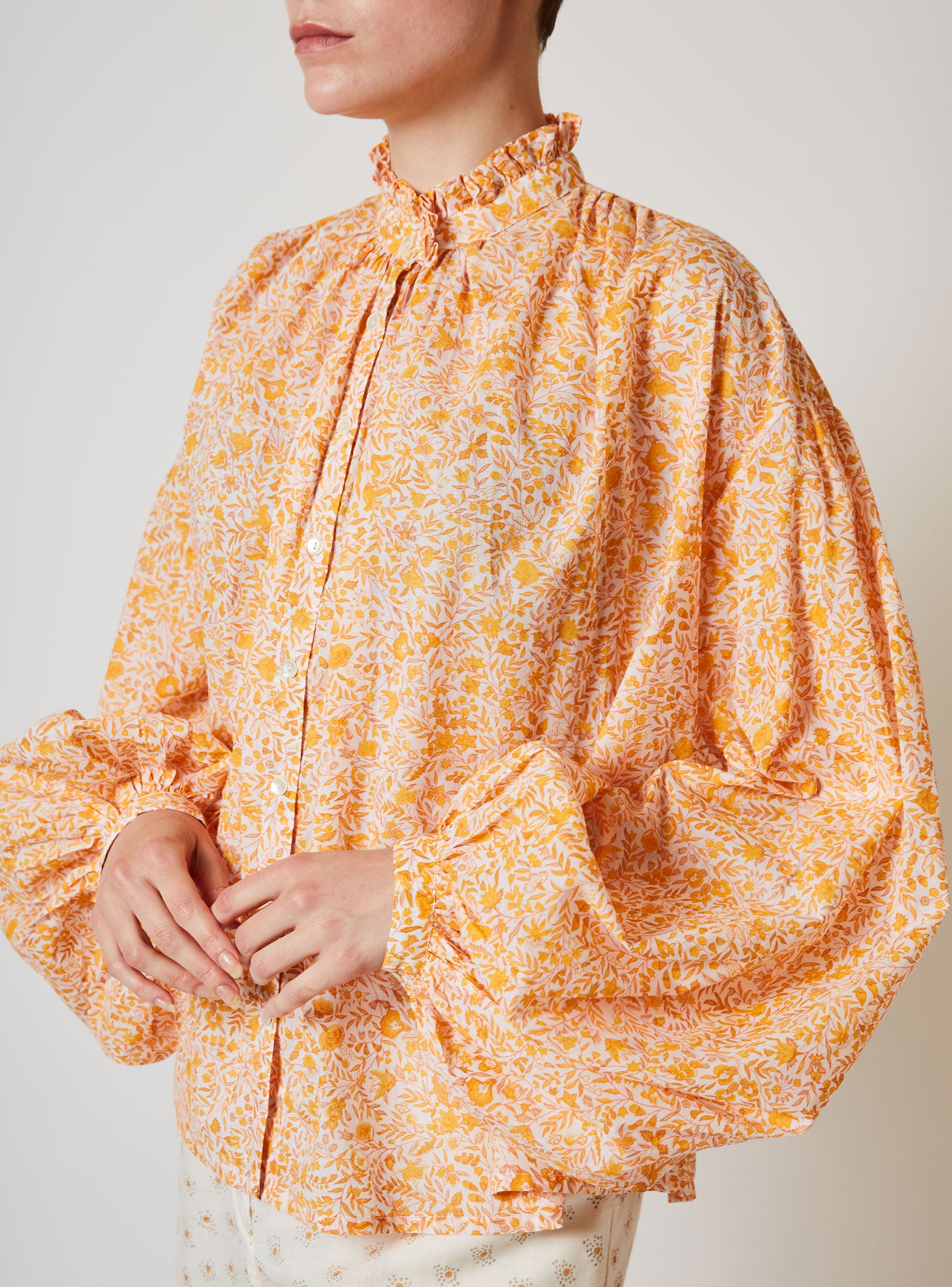 The SLAVA blouse with its wide bell sleeves and simple collar band, is a wink to Eastern Europe folk peasant blouses and is also referring to romantic mid Victorian ladies fashions.