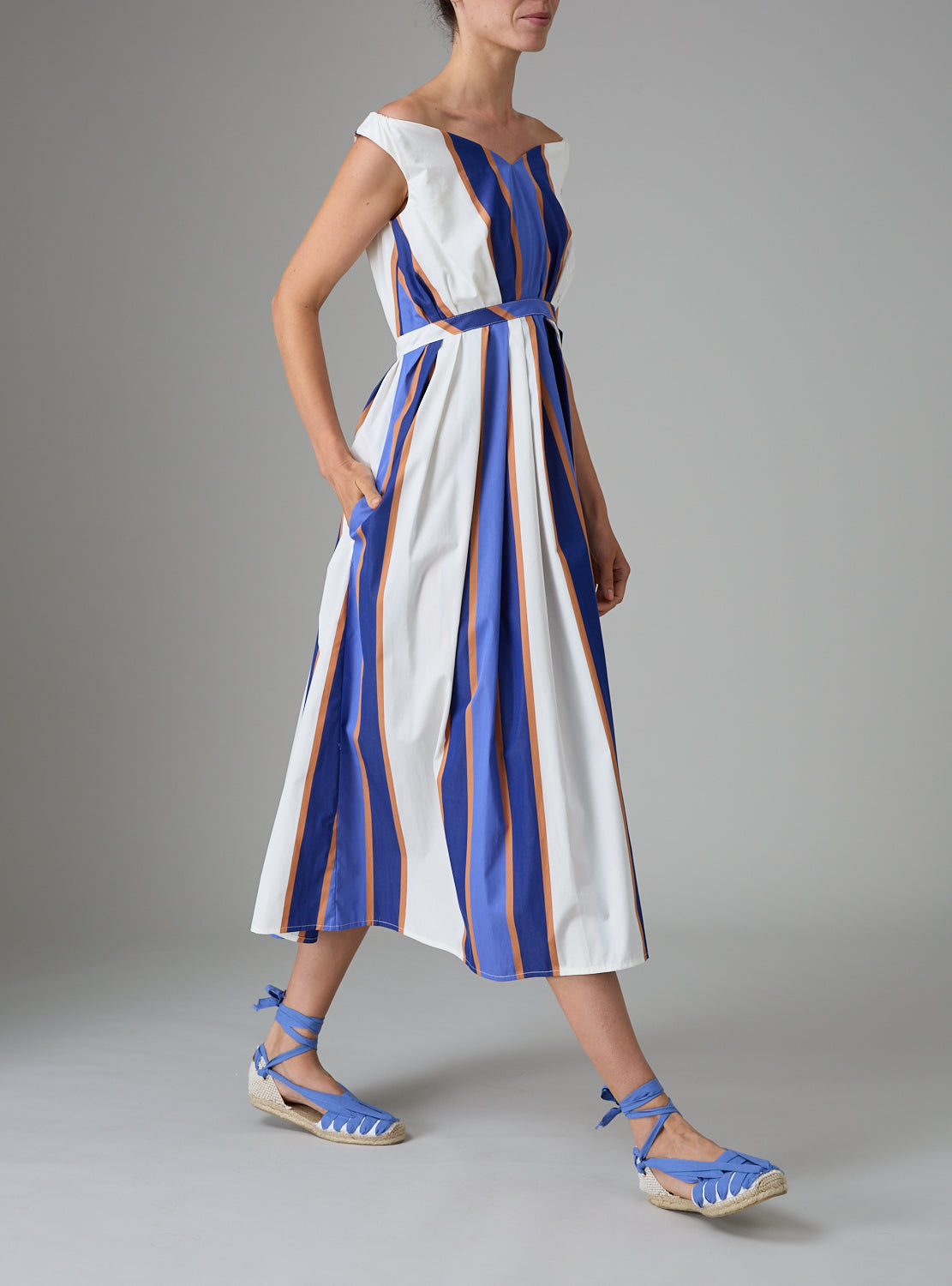 The Apolonia kaftan has a wonderful drape due to his subtle volume and the High quality of the poplin. All stripes are cut in an engineered way for a special placement.