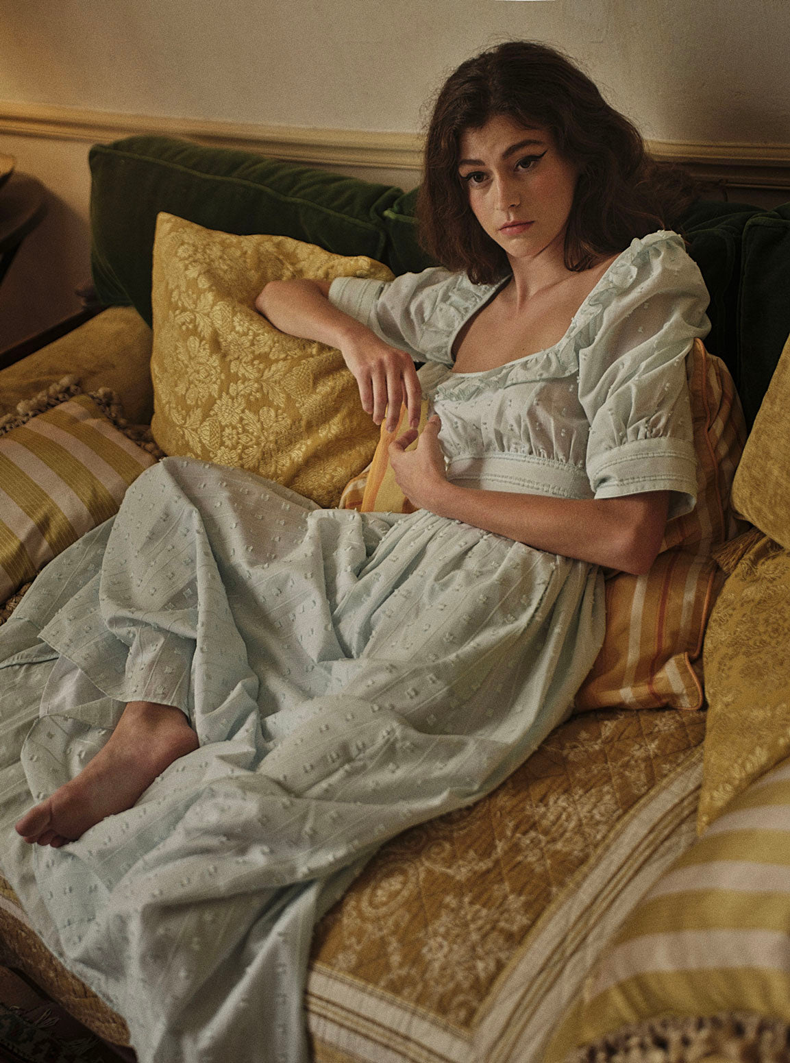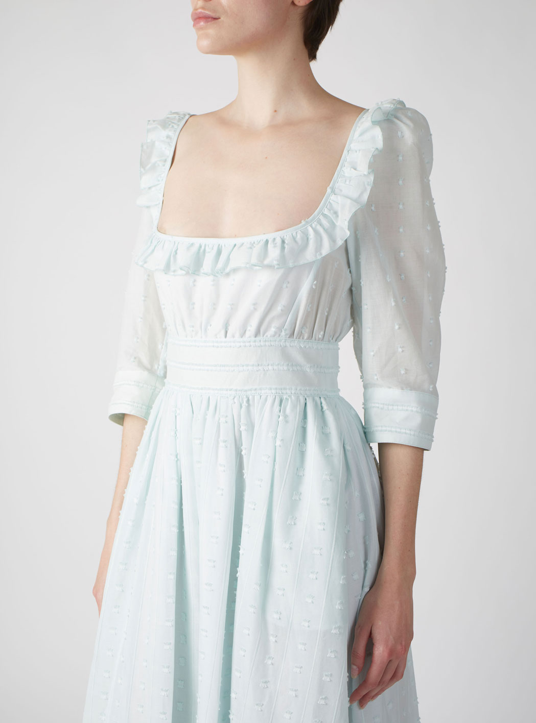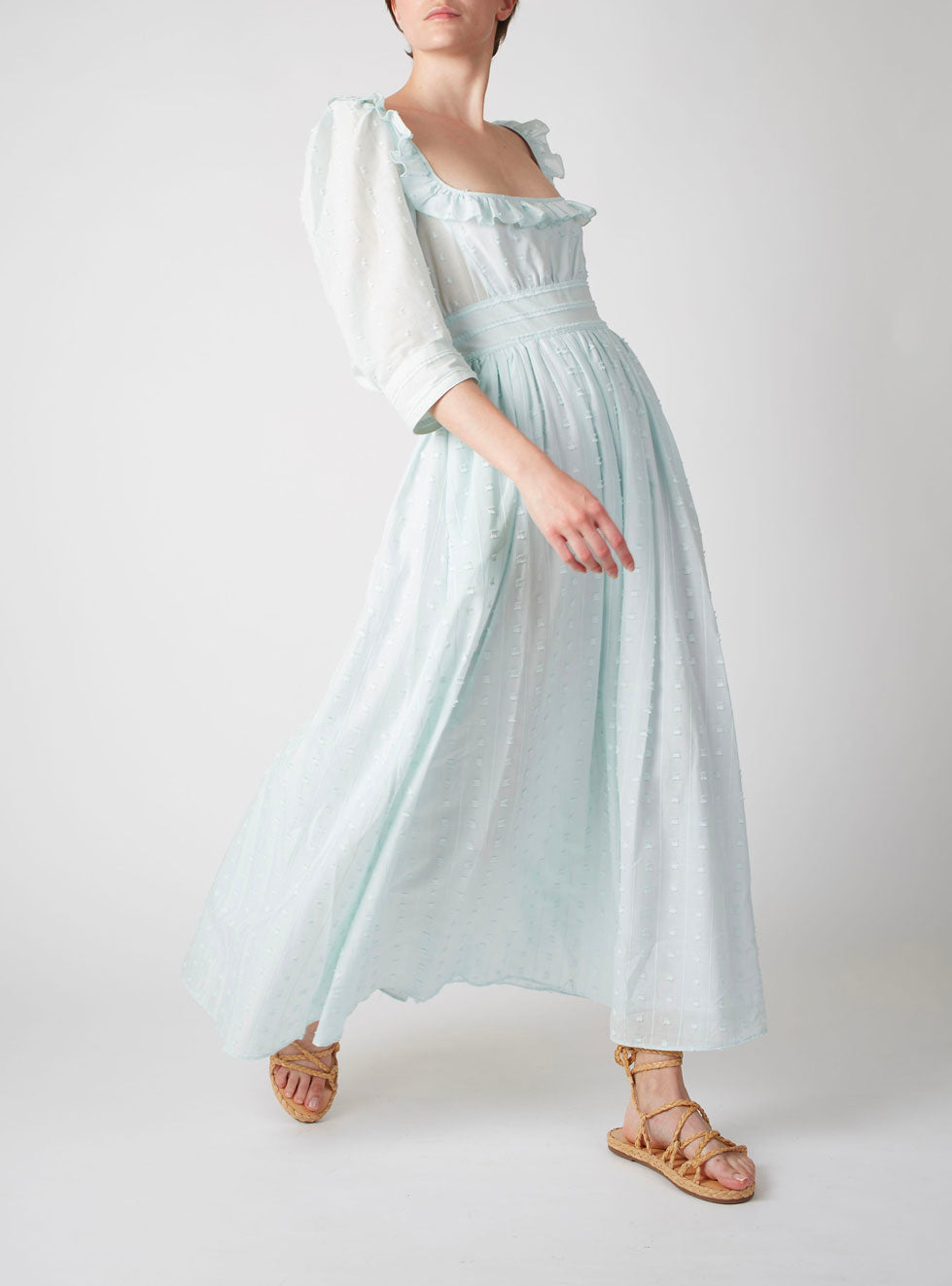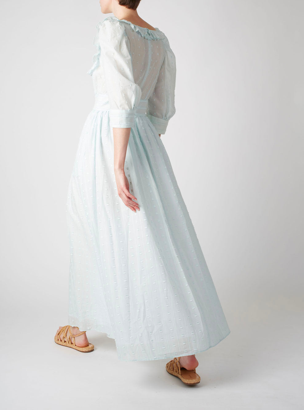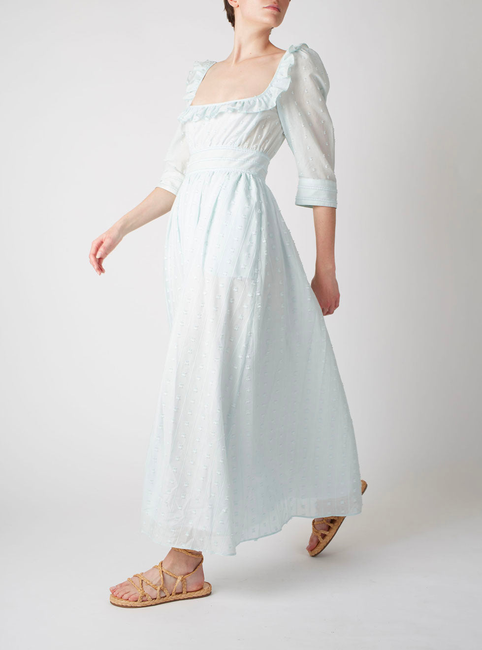 Crafted in a light veil swiss cotton fabric called “plumetis“ in French, it will recall the court portraitist Madame Vigée-Lebrun & the turn of 18 th century “Anglomania”.