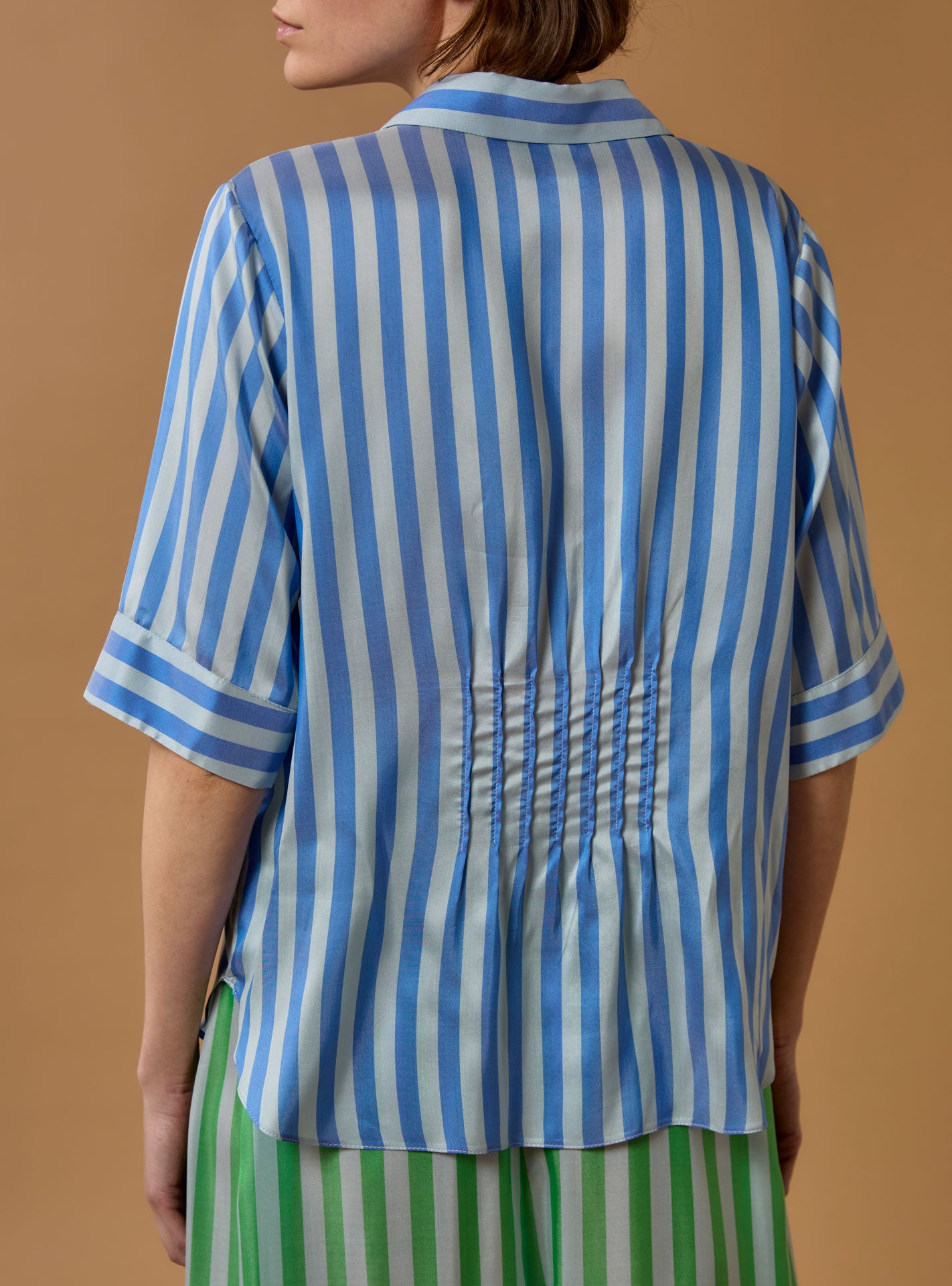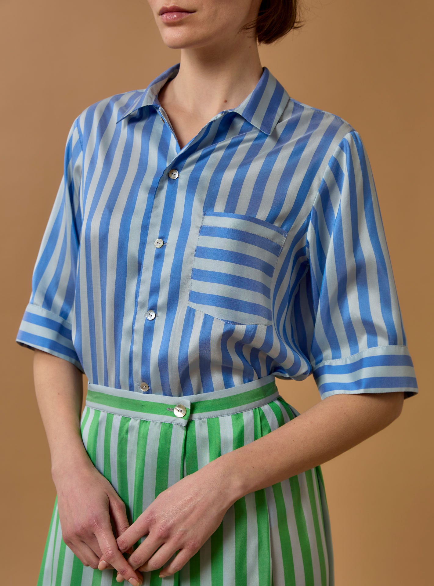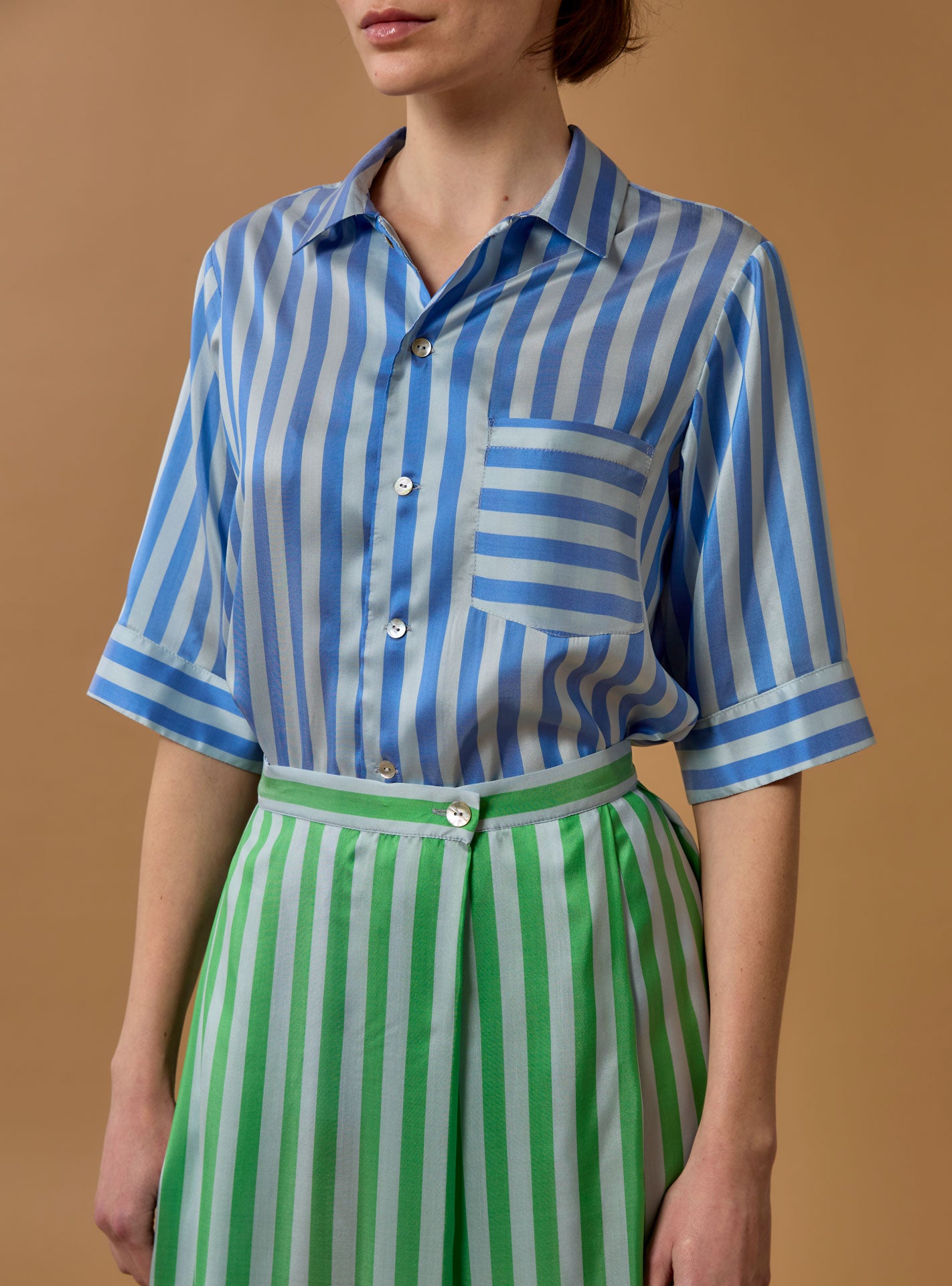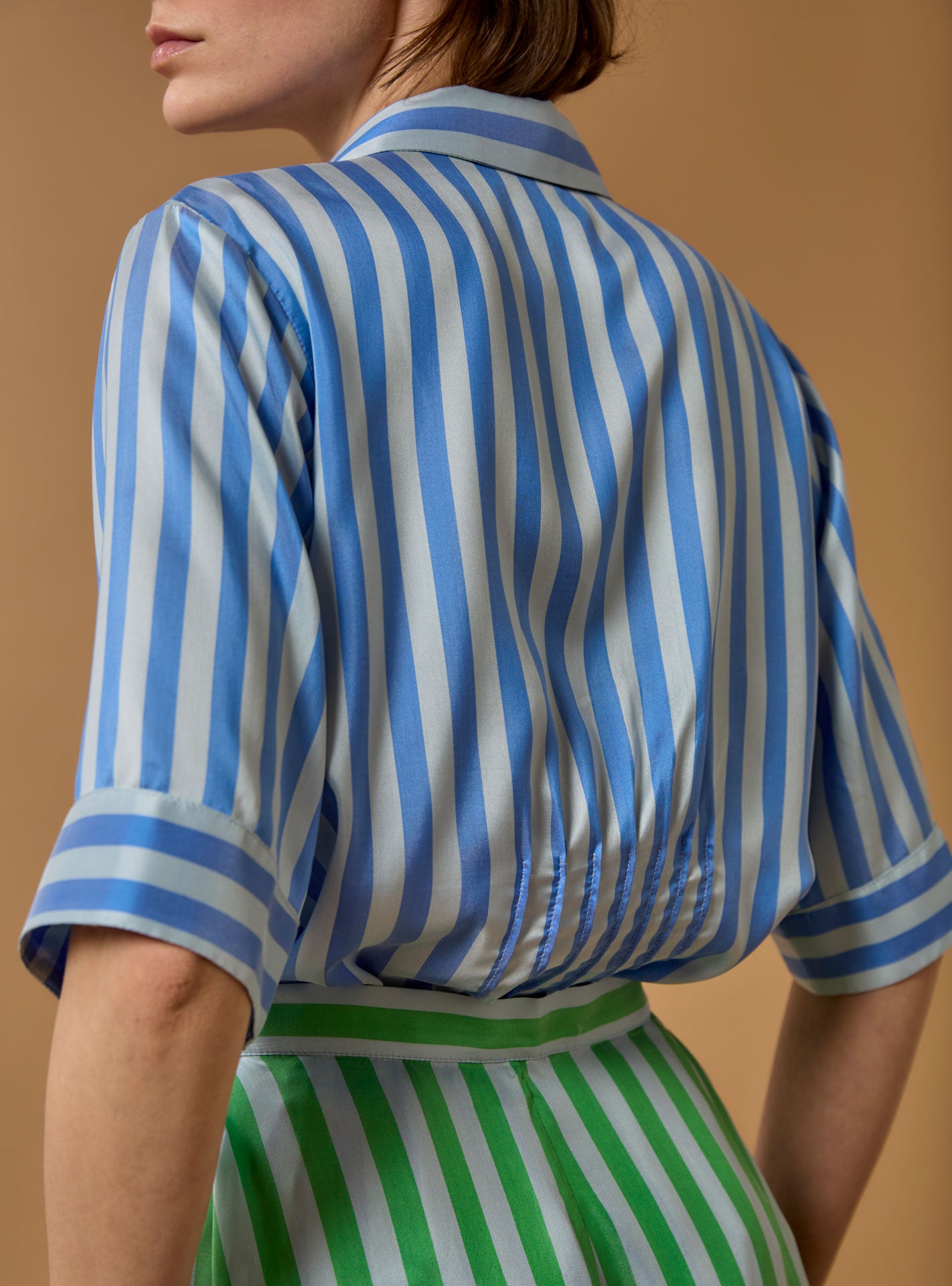 Crafted in a luxurious, woven striped silk from Como, Italy. A refined mix of the Middle Eastern traditional kaftan and a romantic Western style. The perfect pick for summery “dressed-up situations”, at the same time preserving a nonchalant, modern look.