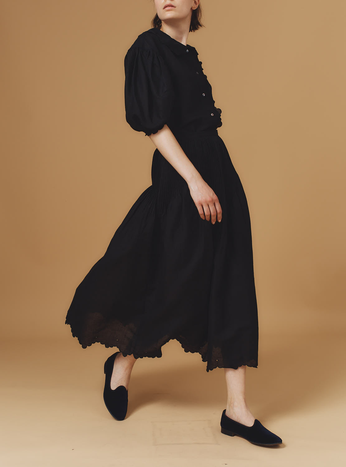 Crafted in a light linen cotton fabric that evokes antique bed linens, it will bring freshness during warm days and will also be pretty during winter with a jumper, leaving the dramatic scalloped collar peak through