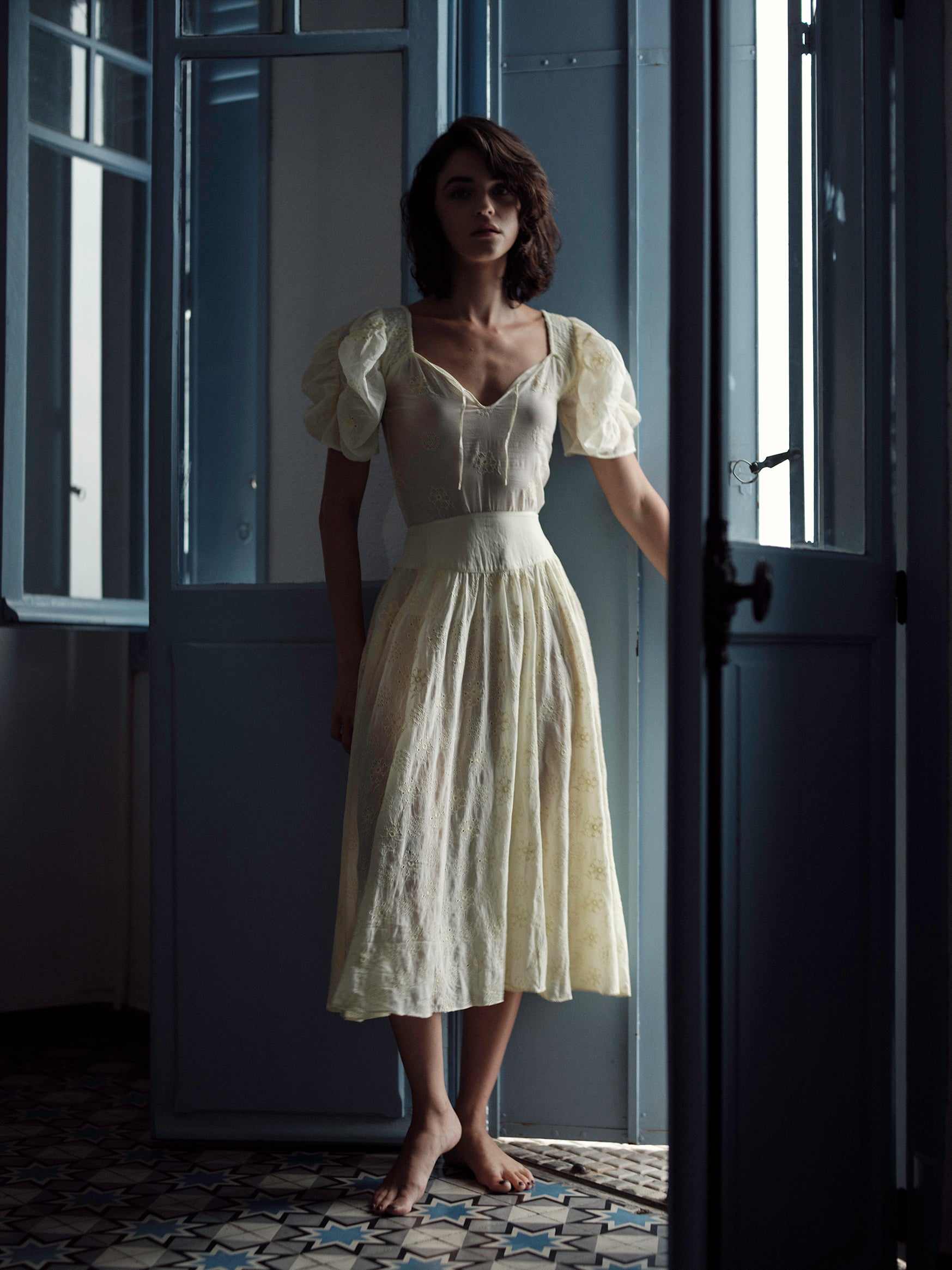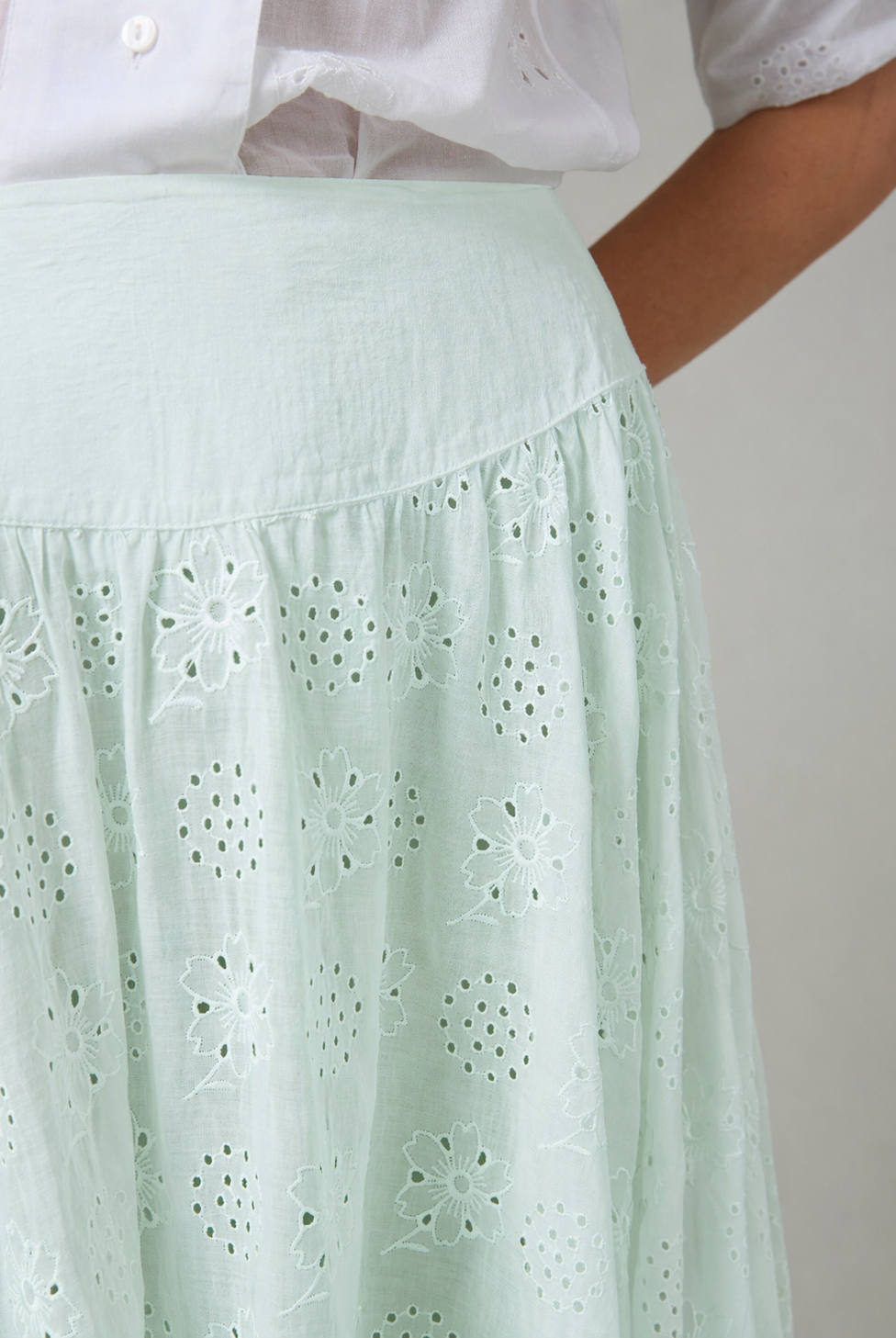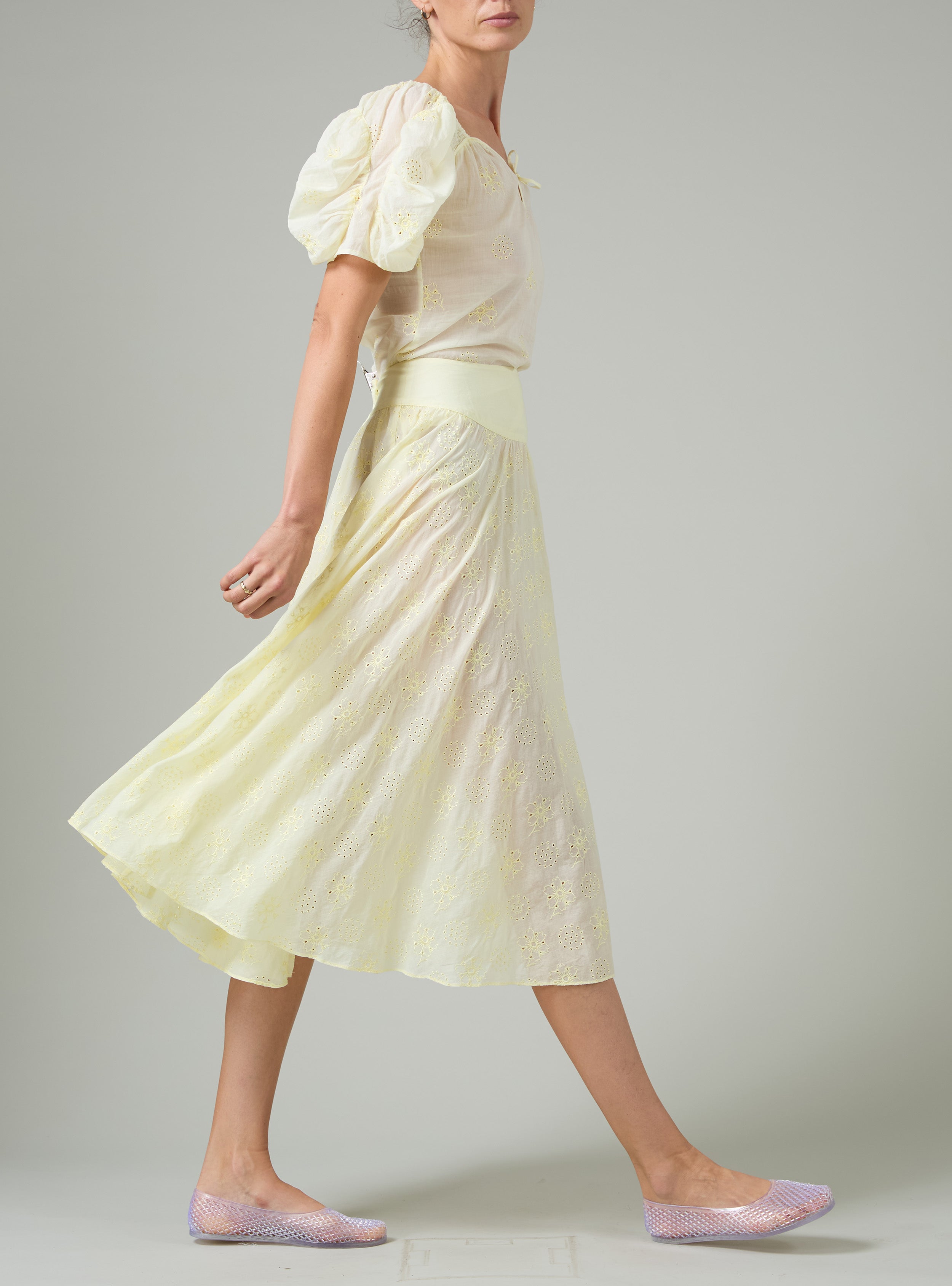 The Pamela skirt draws inspiration from the legendary socialite Pamela Churchill, capturing the glamorous essence of 1950s elegance. Crafted from lightweight cotton voile, this season's design features a delicate floral eyelet pattern that creates a busy, intricate texture—almost lace-like in its visual richness. The soft, tender yellow hue adds a cheerful warmth to this timeless silhouette, making it an effortlessly sophisticated piece for warm-weather dressing.