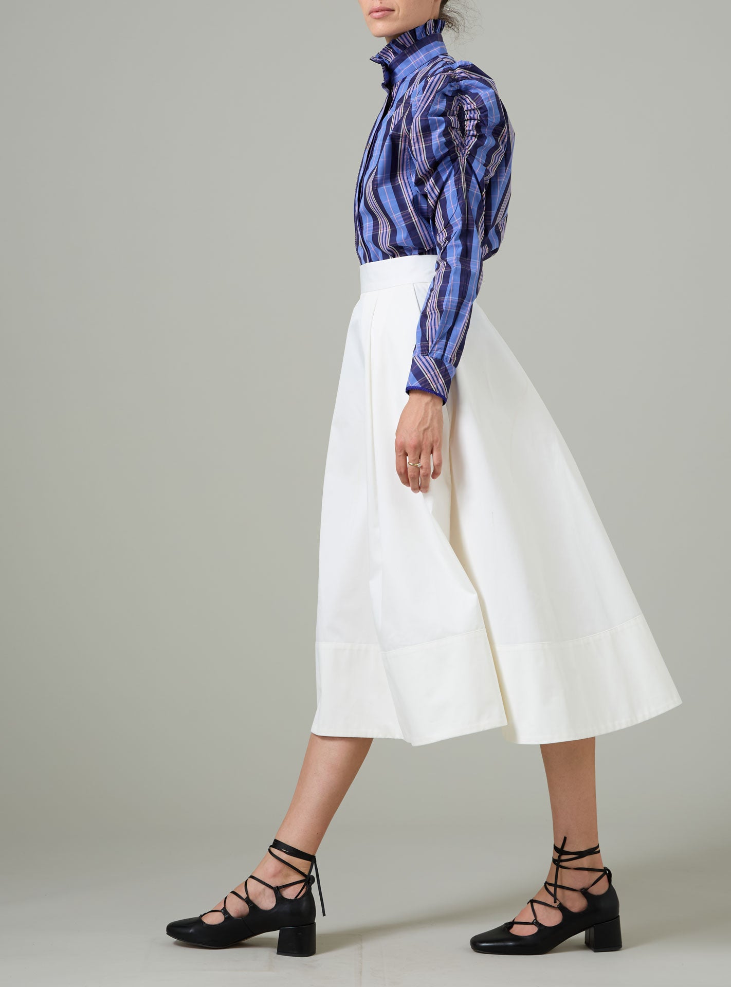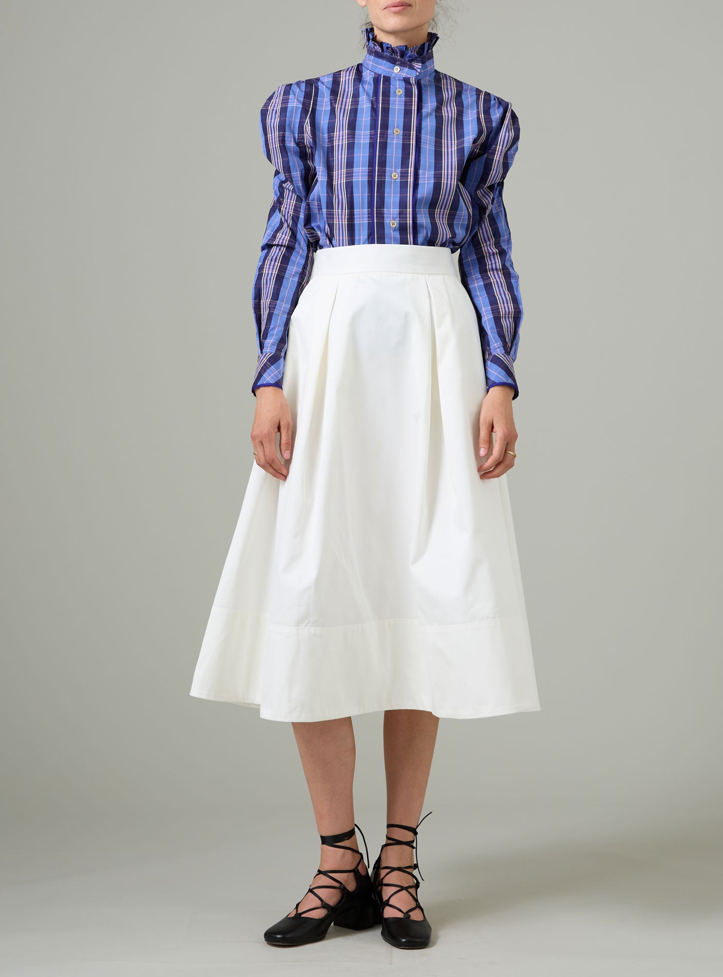 This striking blouse showcases balloon sleeves and a distinctive ruffled stand collar that command attention. Rendered in a crisp poplin weave featuring a Victorian check pattern in green and pink, it embodies a distinctly British aesthetic for Spring 2026. The design proves remarkably versatile—pair it casually with denim for understated elegance, or coordinate it with the coordinating Ikat A-line skirt for a cohesive ensemble. The color palette celebrates refined eccentricity, making this piece an essential