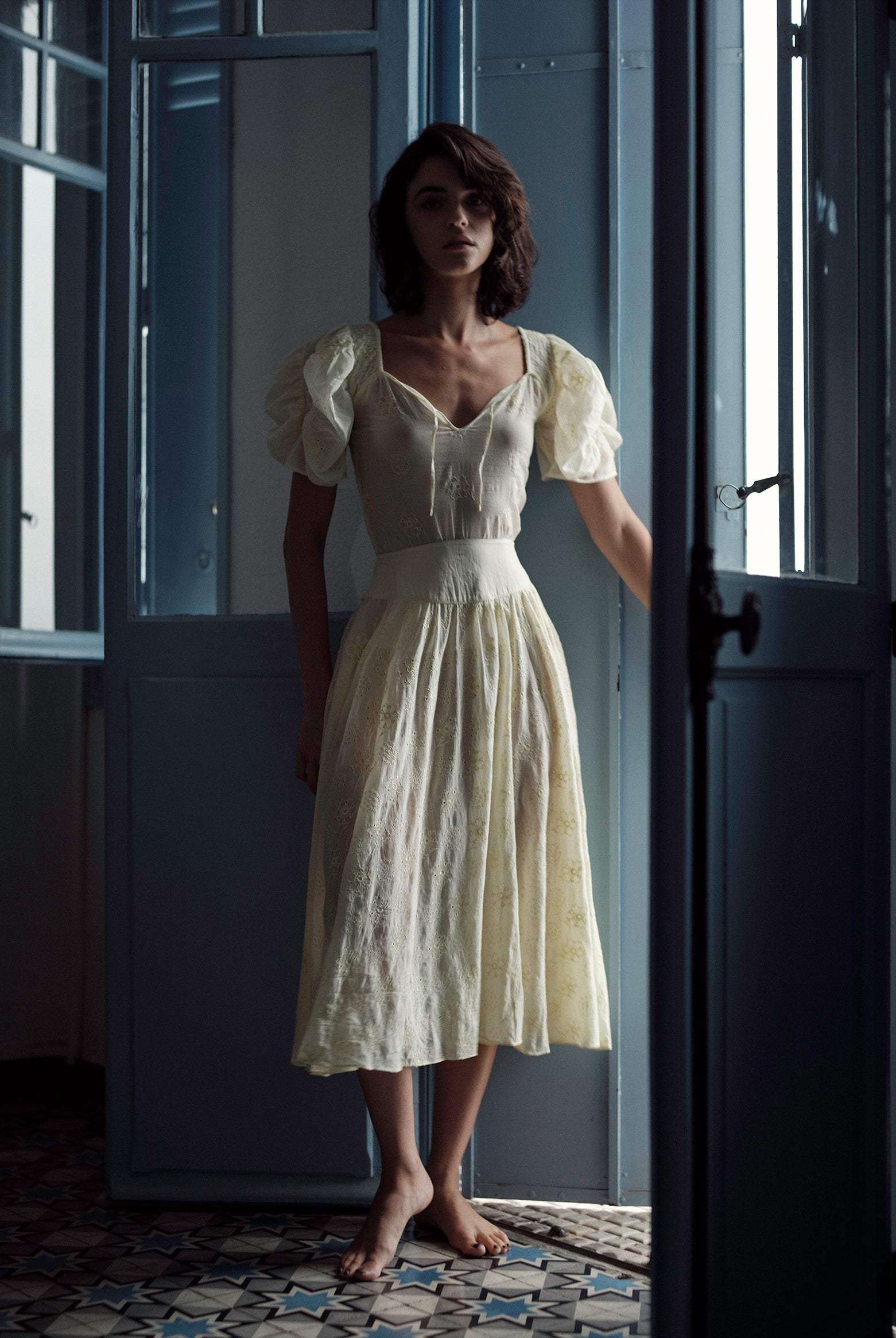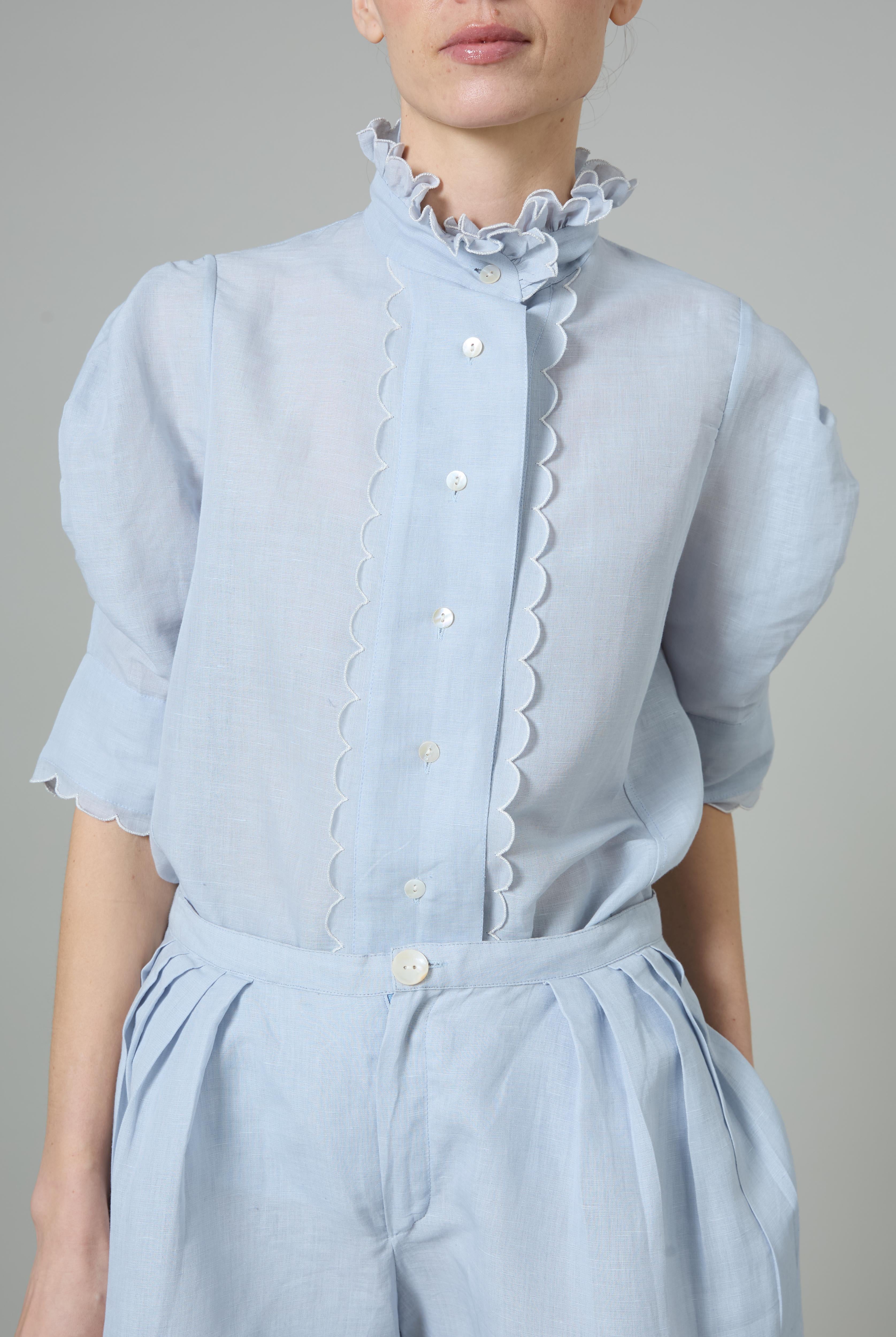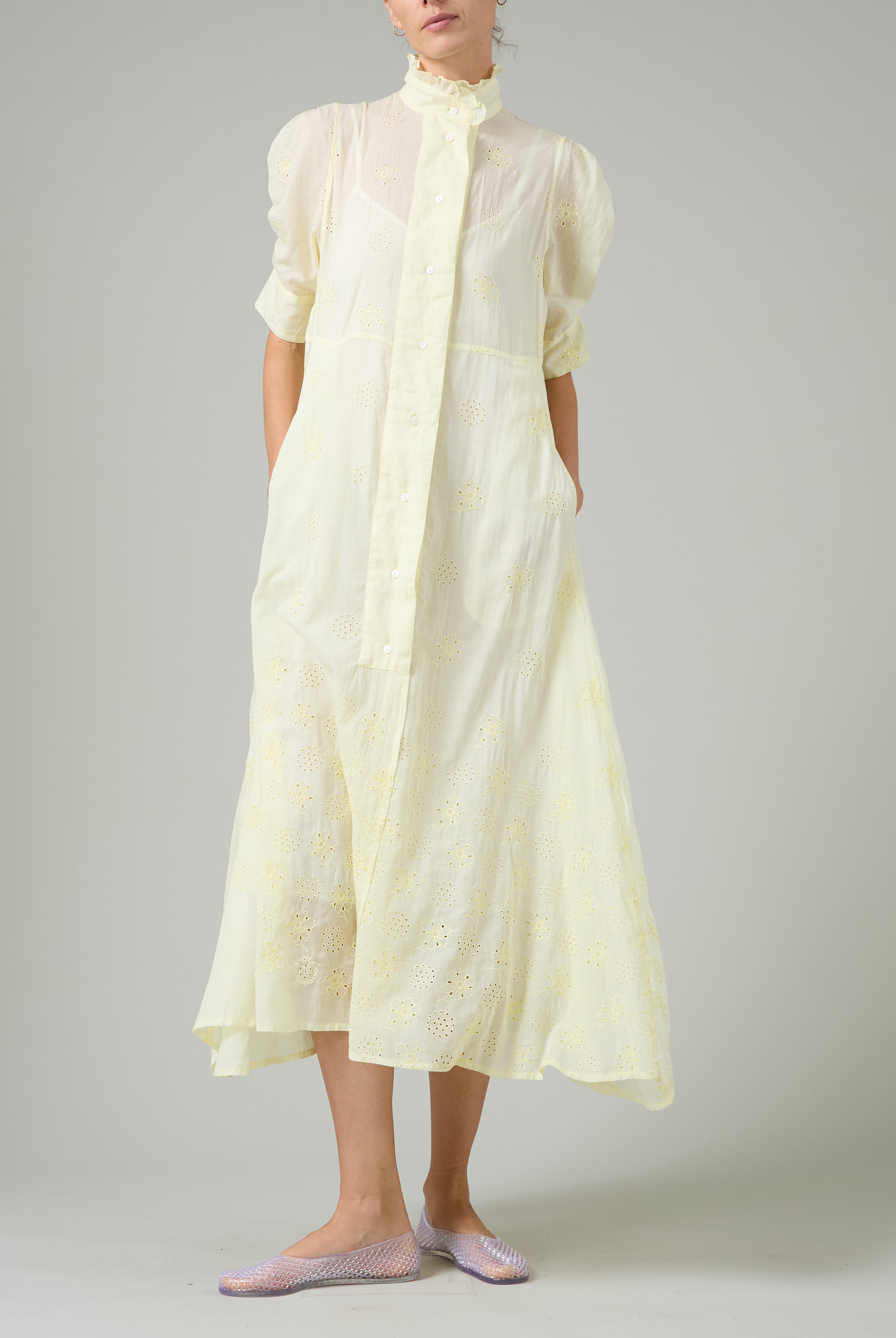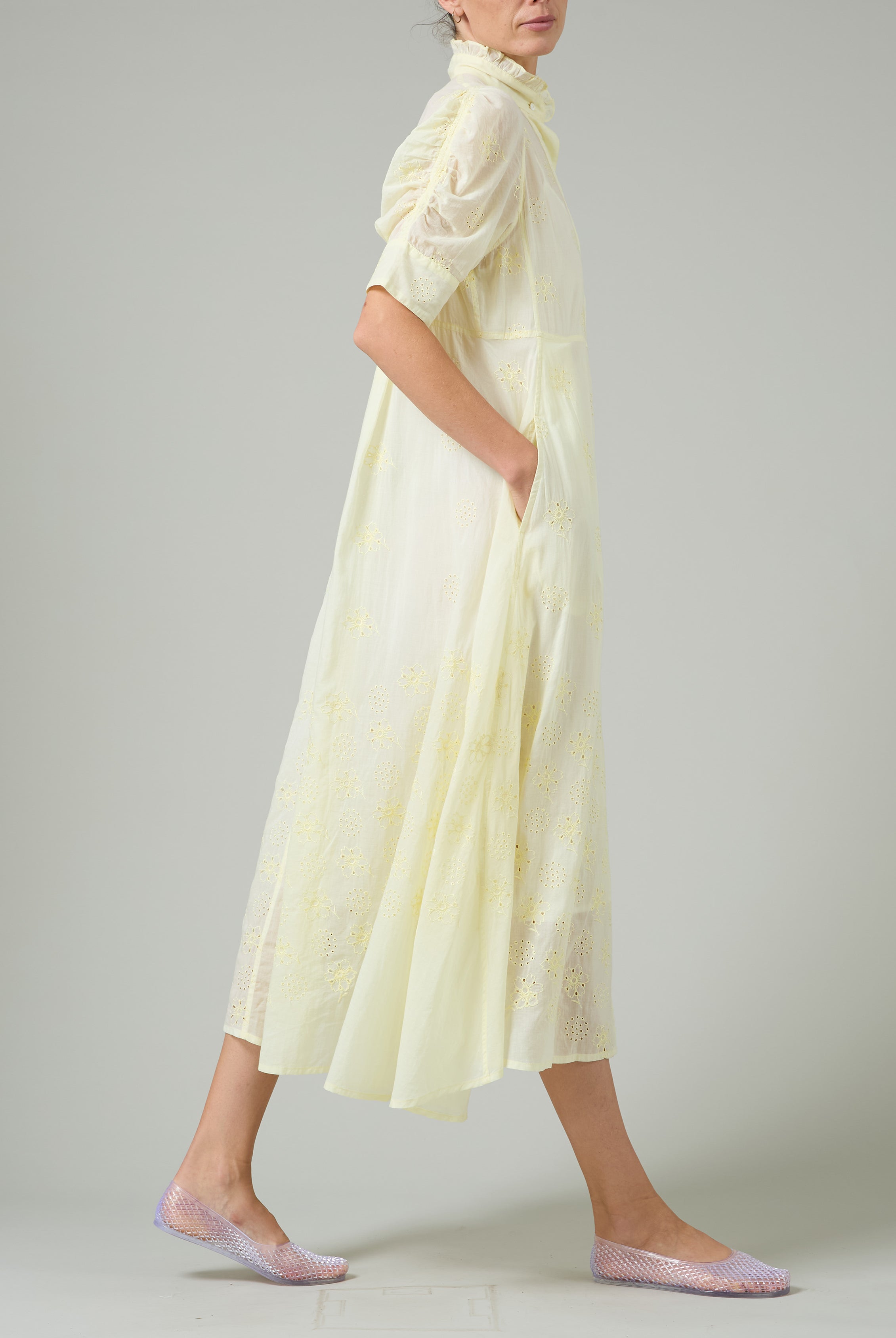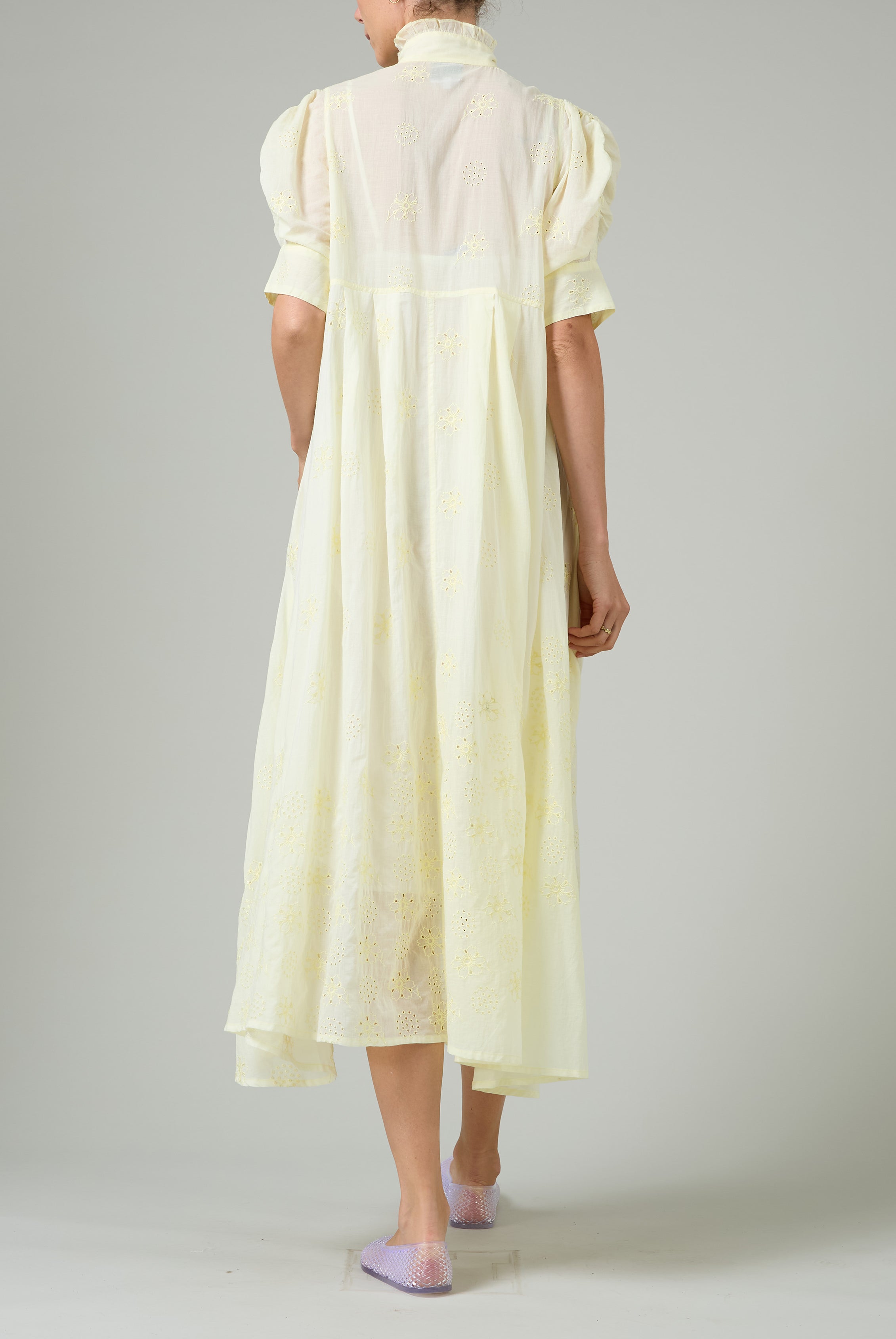 This sophisticated VITA blouse channels Edwardian elegance with its dramatic Gigot sleeves and delicate ruffle collar. Crafted in lightweight cotton voile, it features an intricate floral eyelet pattern that catches the light beautifully. The soft, tender yellow hue brings warmth and joy to any wardrobe. Style it with our Pamela full circle skirt for a complete, romantic look.