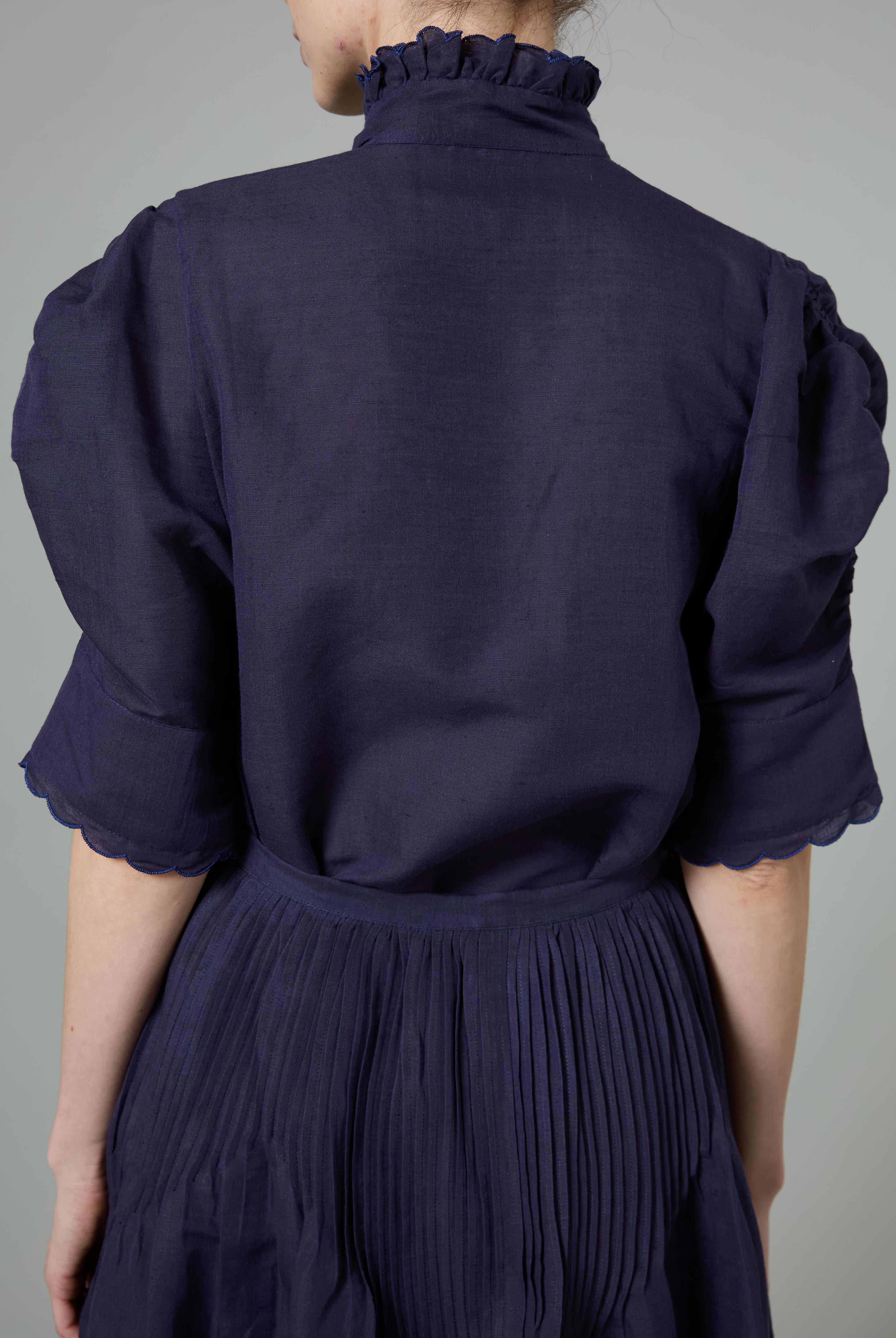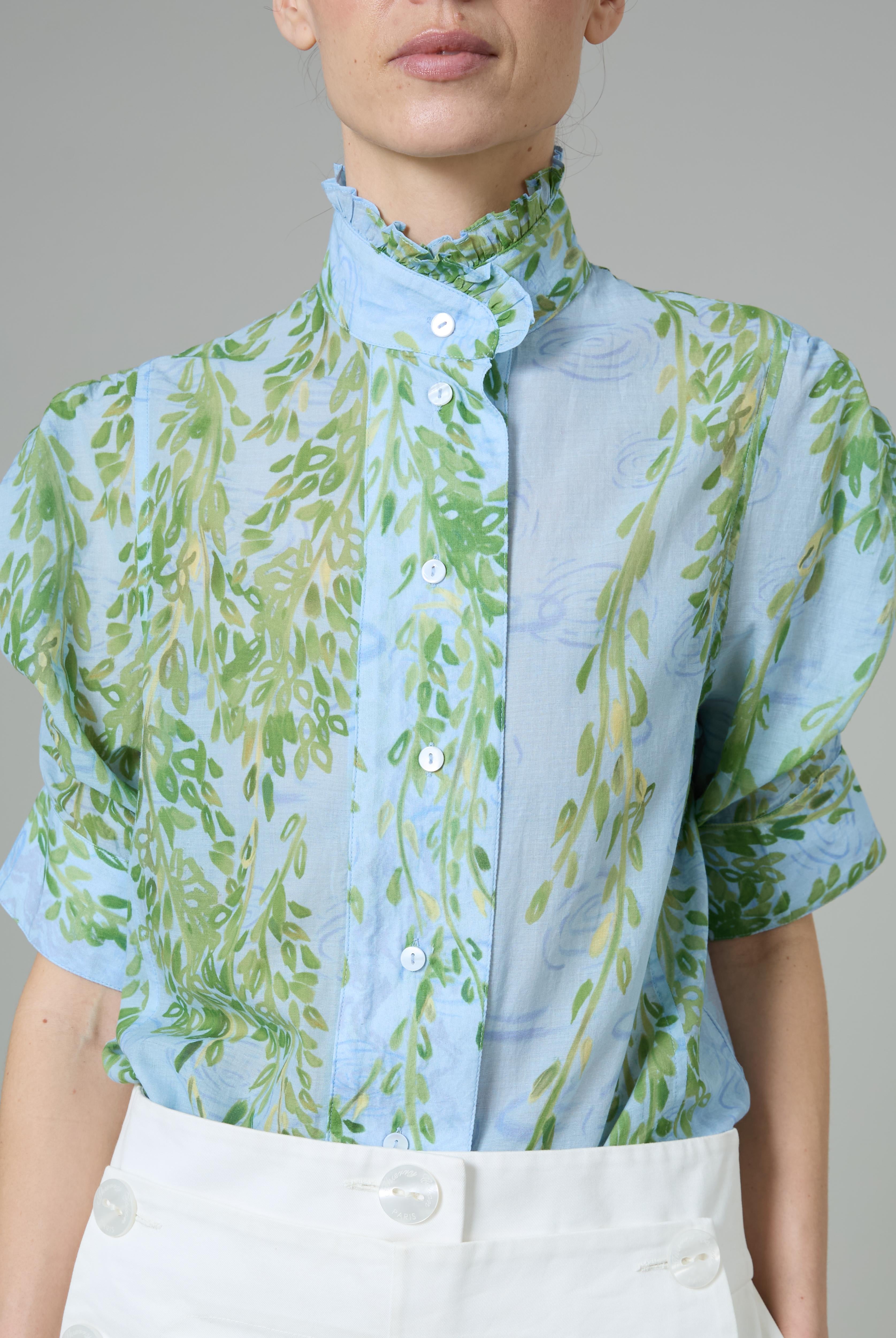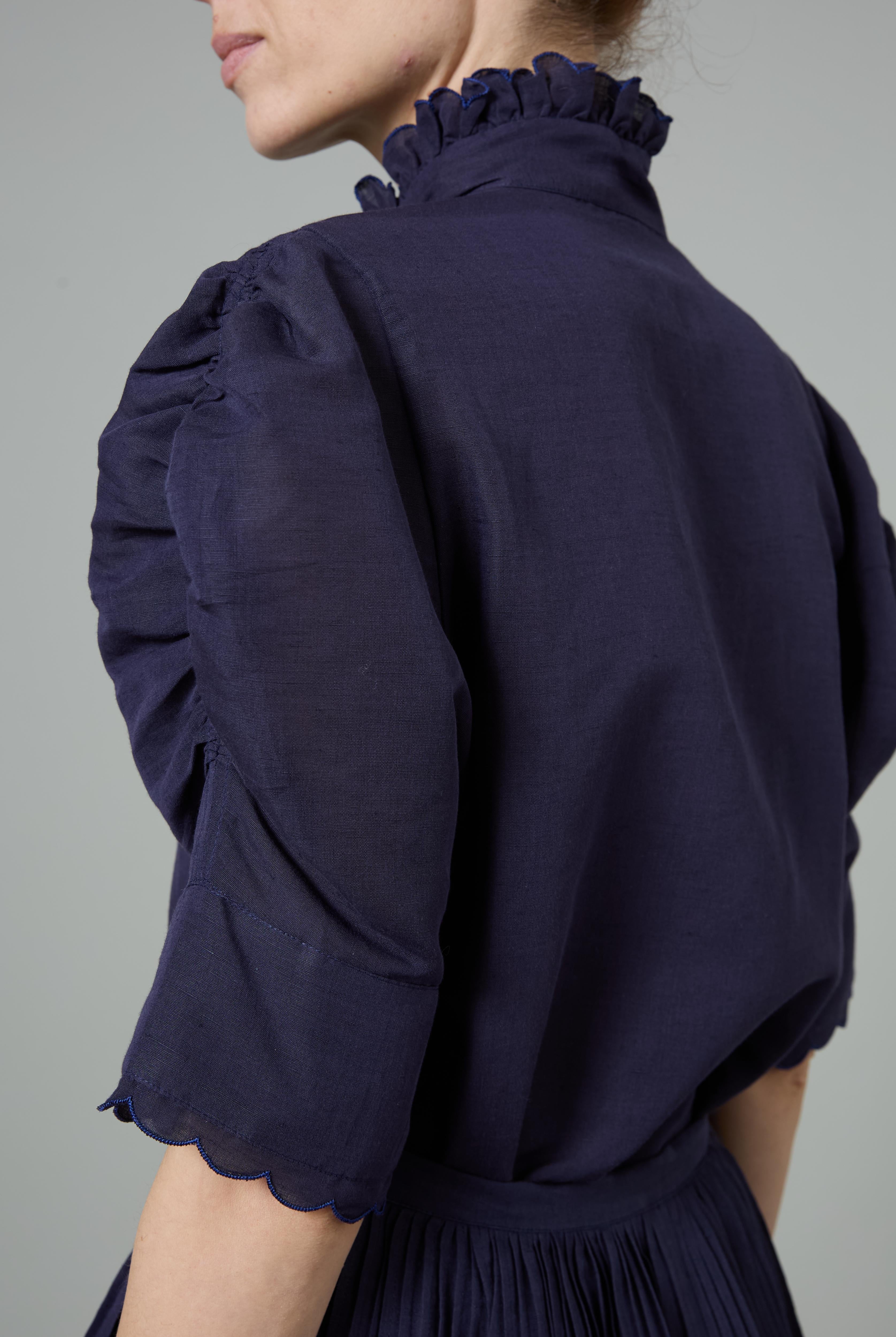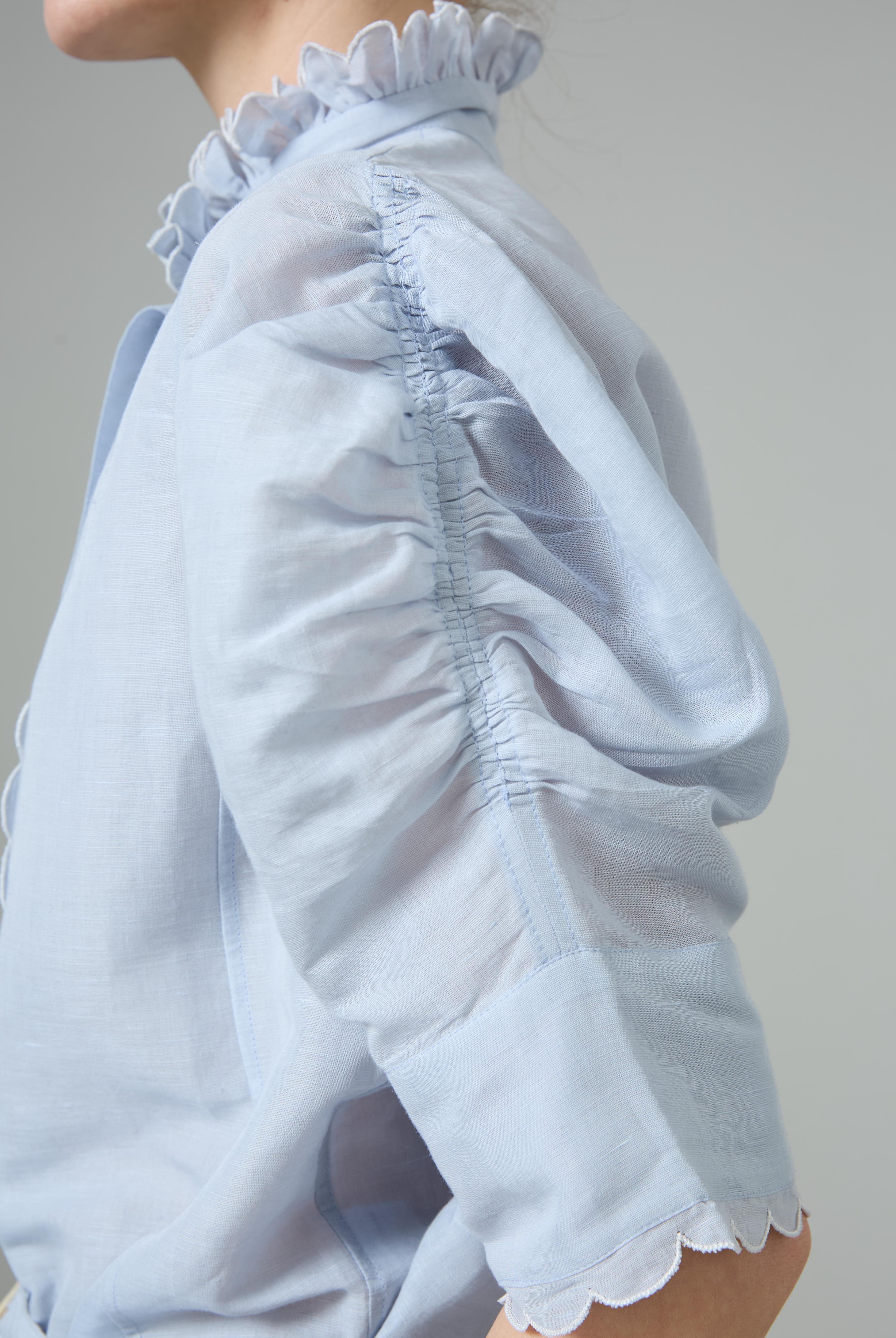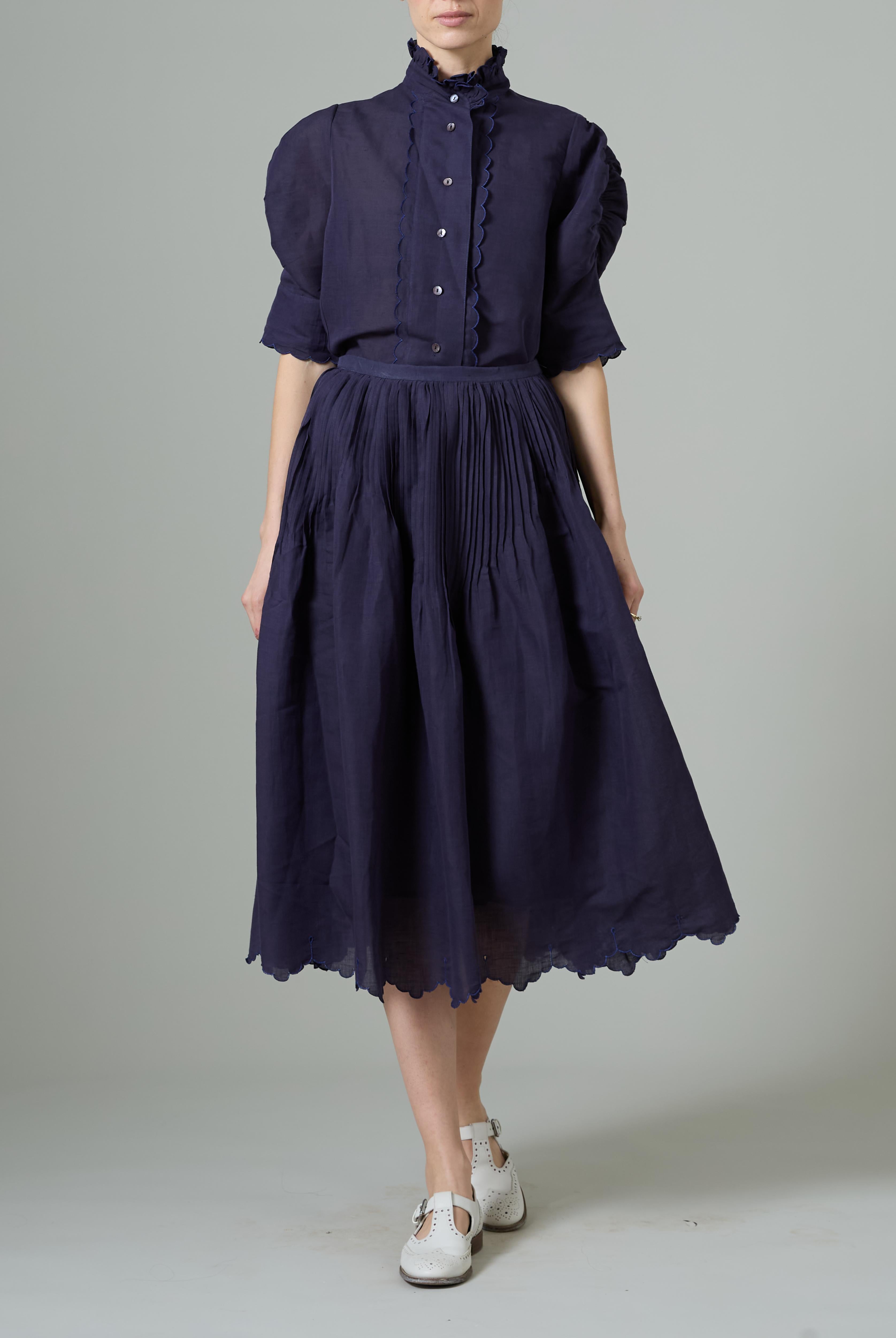 This sophisticated VITA blouse channels Edwardian elegance with its dramatic Gigot sleeves and delicate ruffle collar. Crafted in lightweight cotton voile, it features an intricate floral eyelet pattern that catches the light beautifully. The soft, tender yellow hue brings warmth and joy to any wardrobe. Style it with our Pamela full circle skirt for a complete, romantic look.