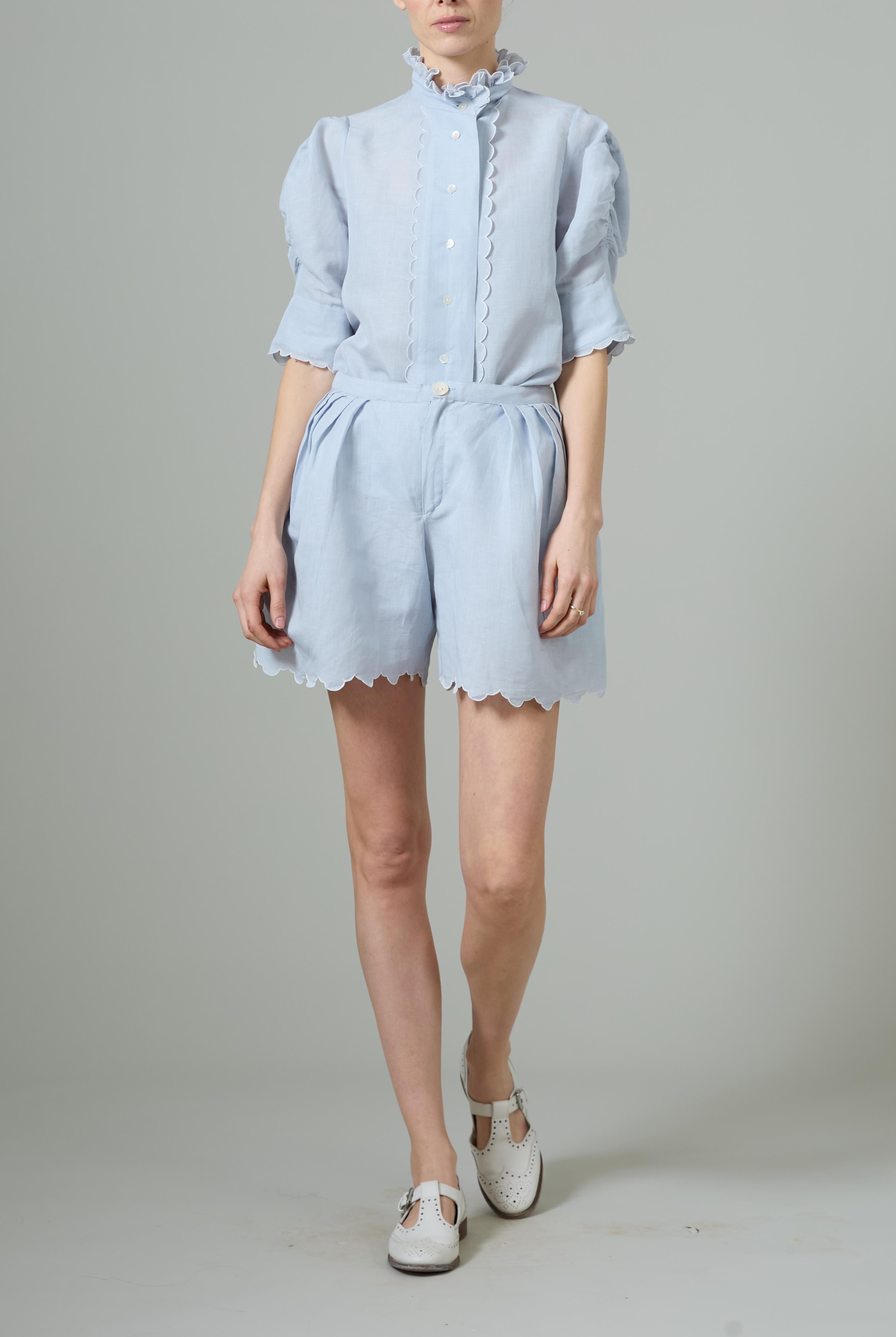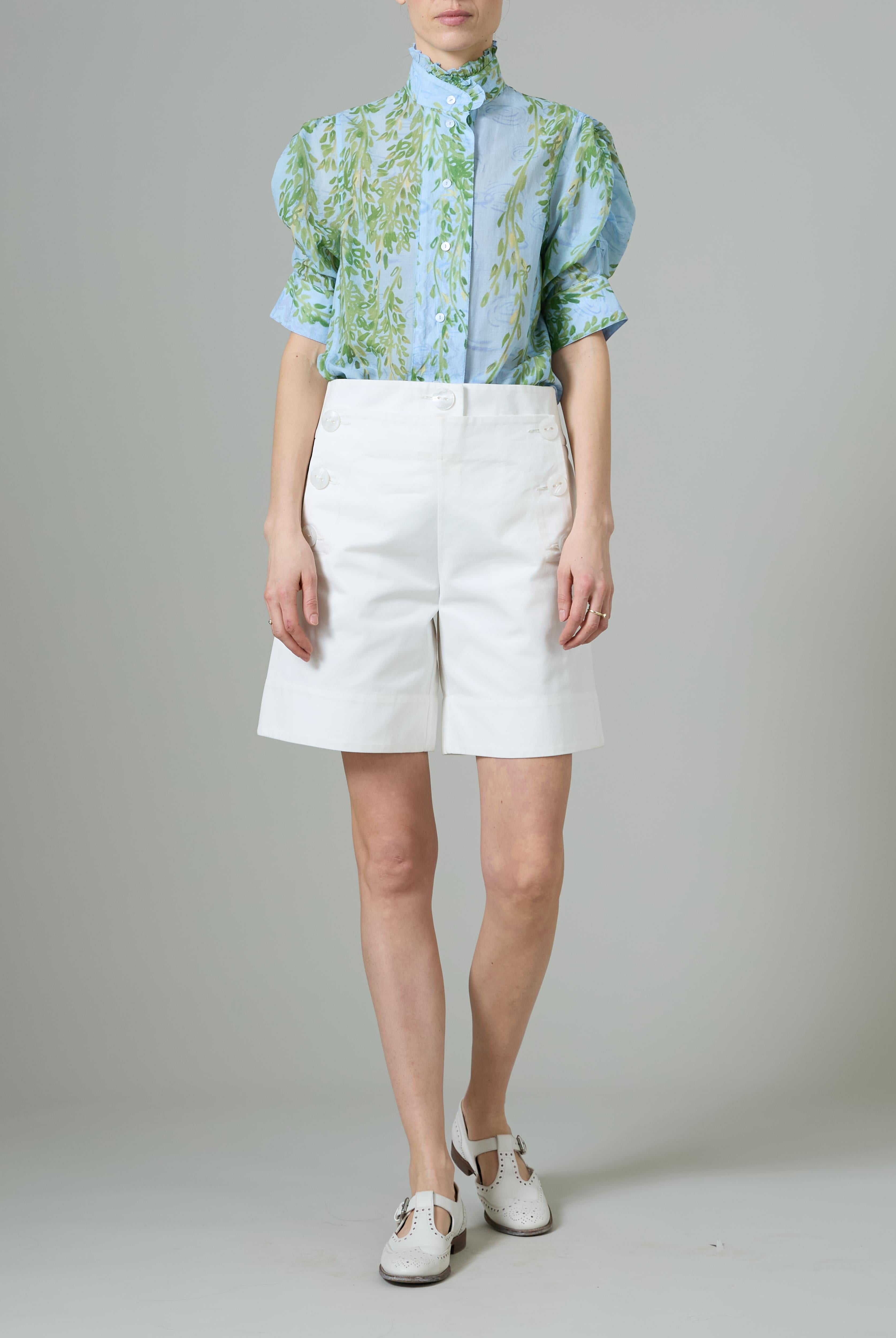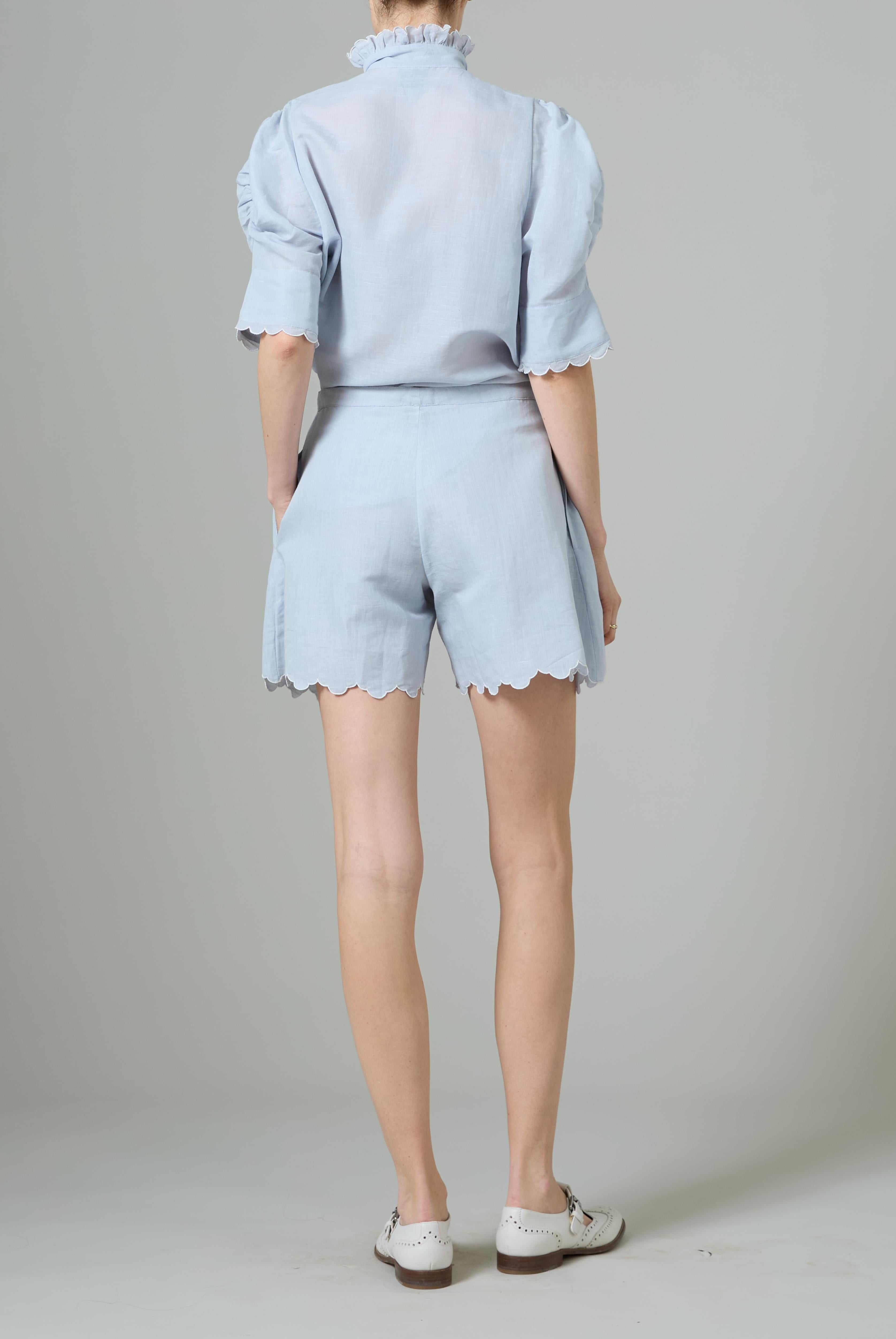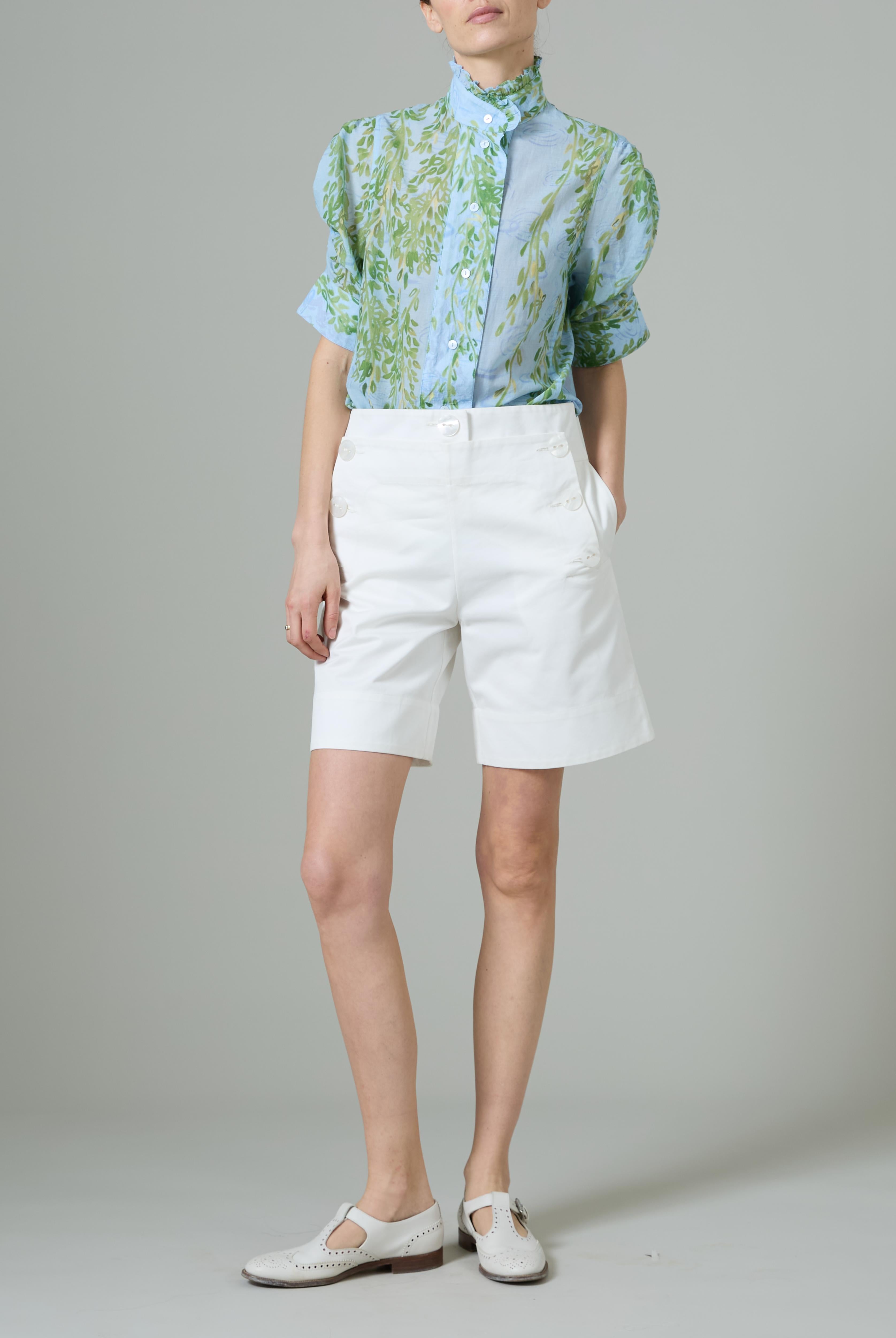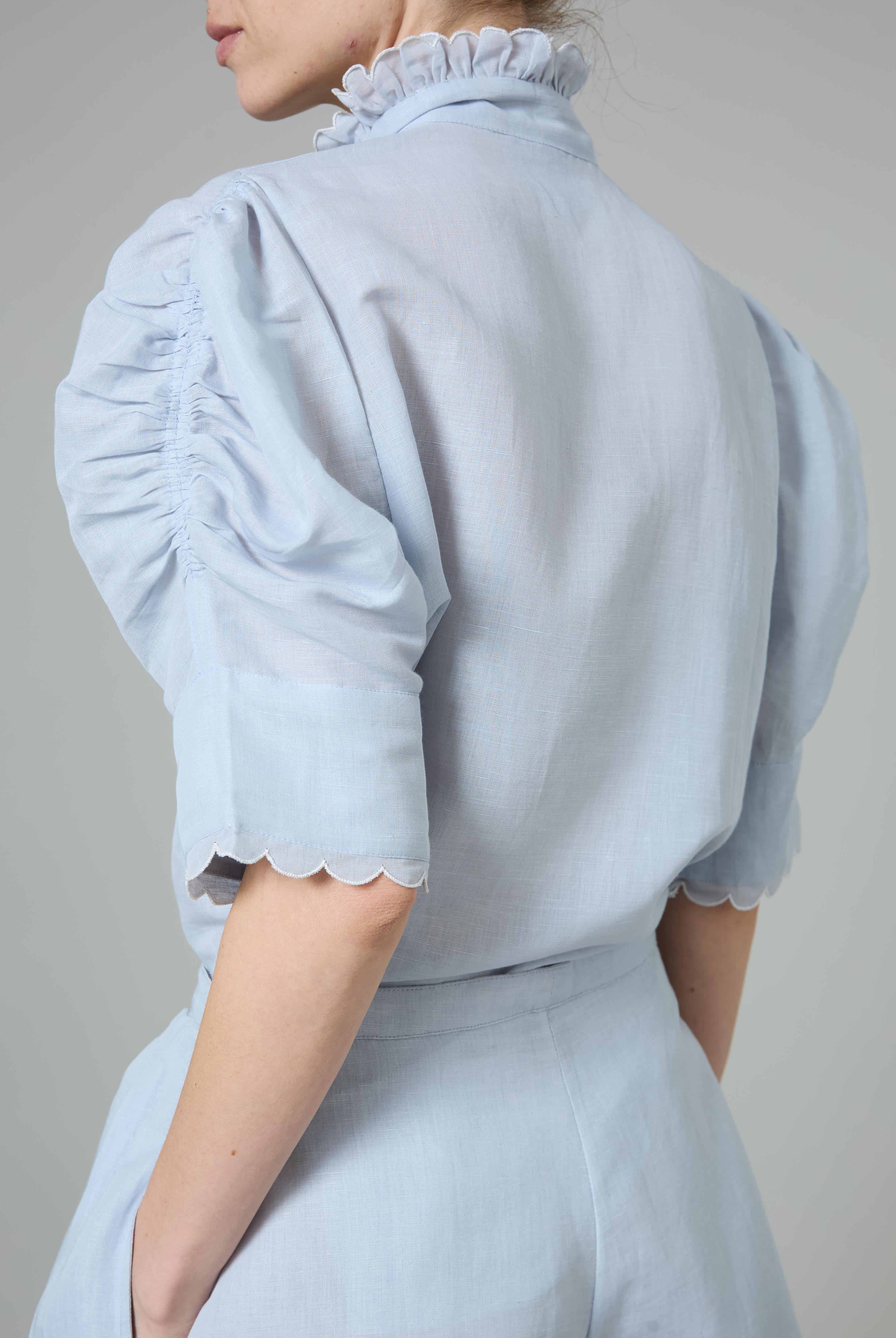 This sophisticated VITA blouse channels Edwardian elegance with its dramatic Gigot sleeves and delicate ruffle collar. Crafted in lightweight cotton voile, it features an intricate floral eyelet pattern that catches the light beautifully. The soft, tender yellow hue brings warmth and joy to any wardrobe. Style it with our Pamela full circle skirt for a complete, romantic look.