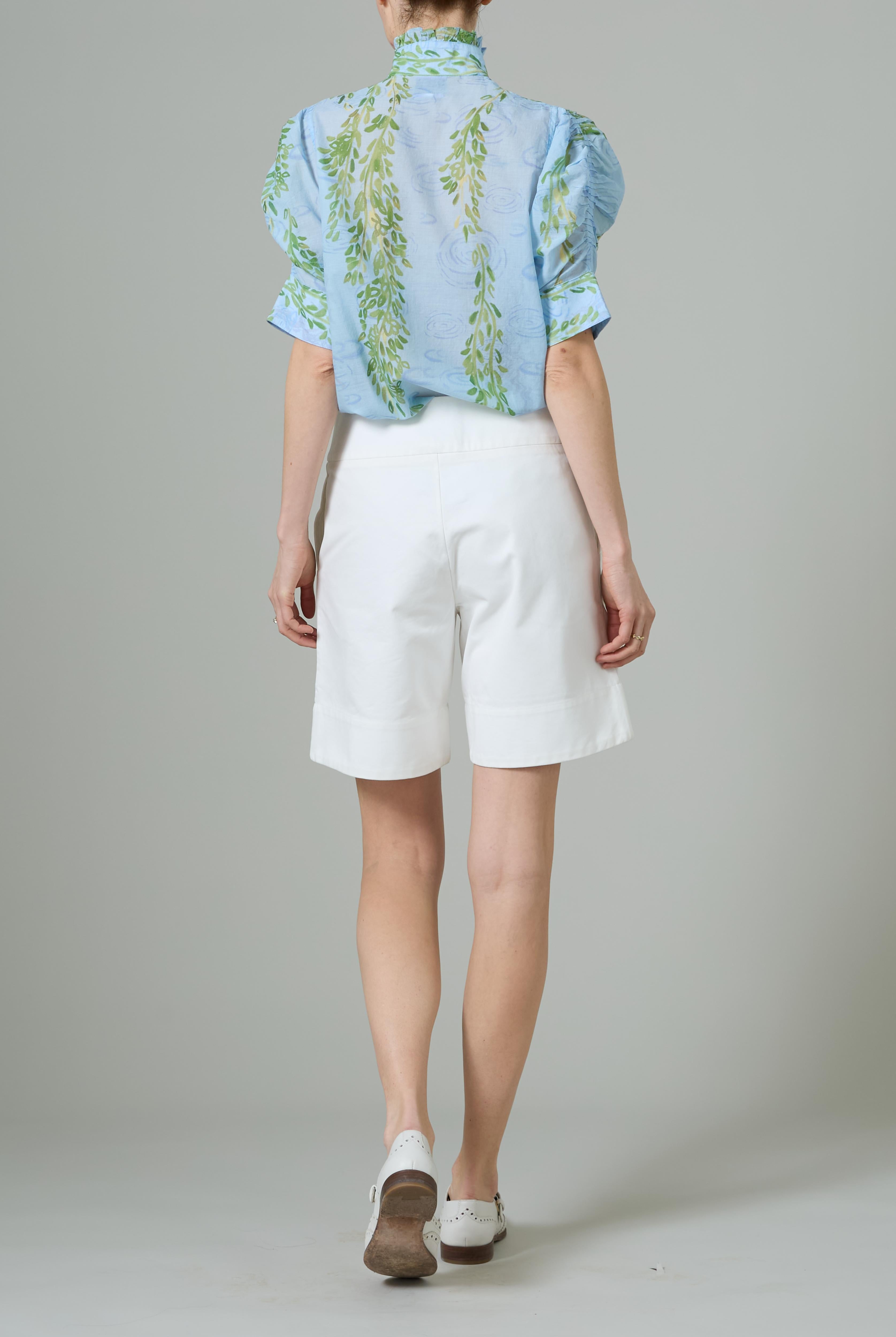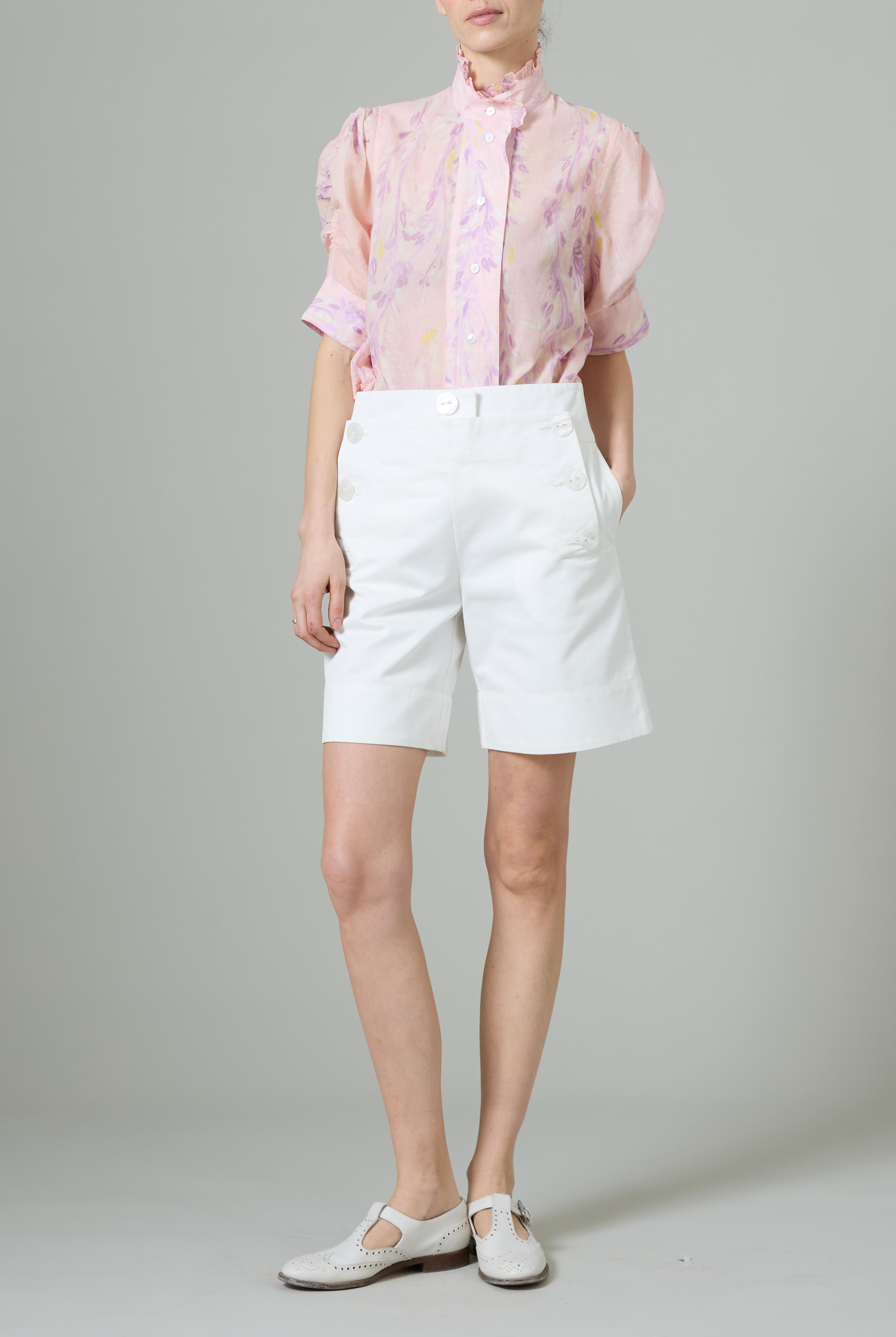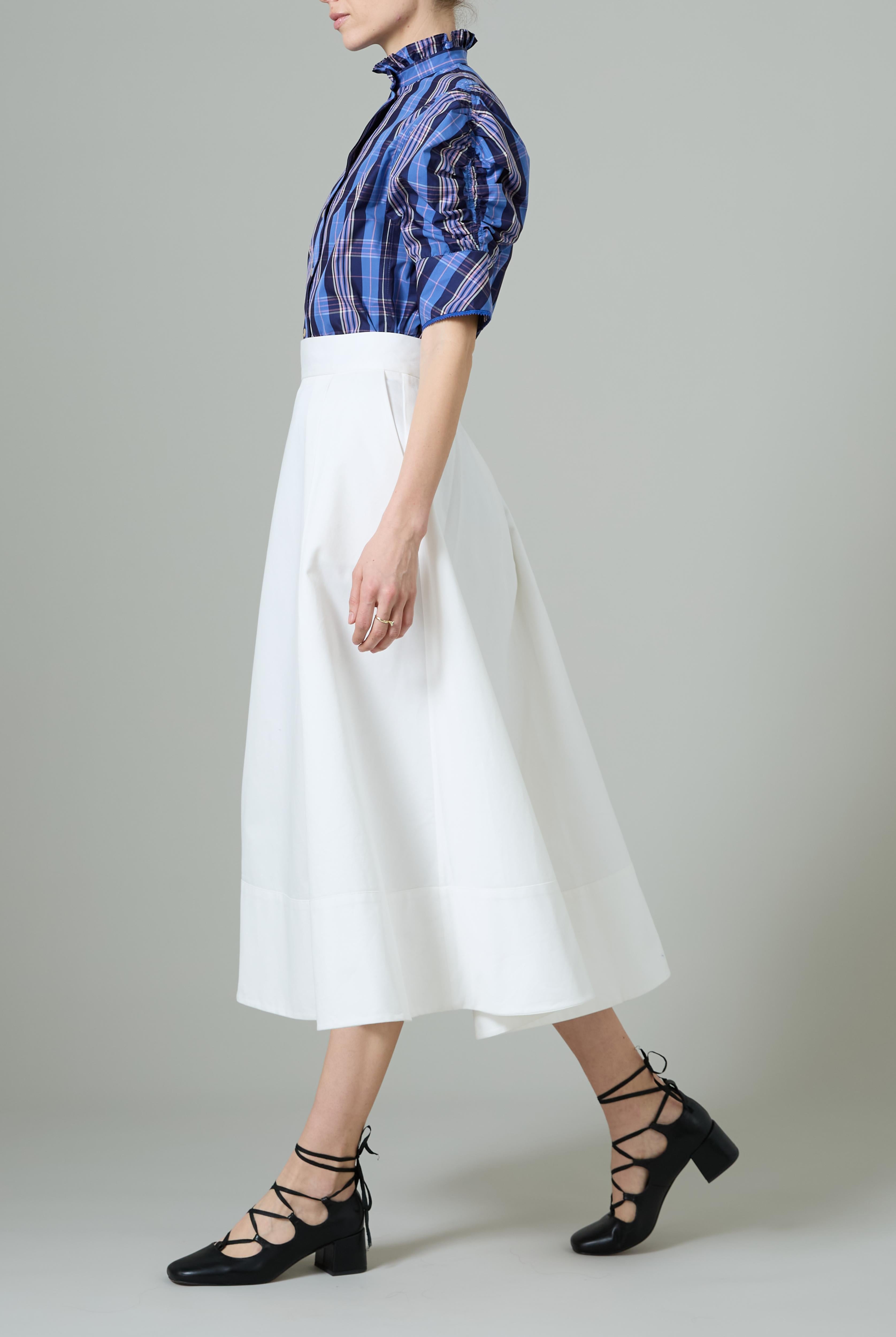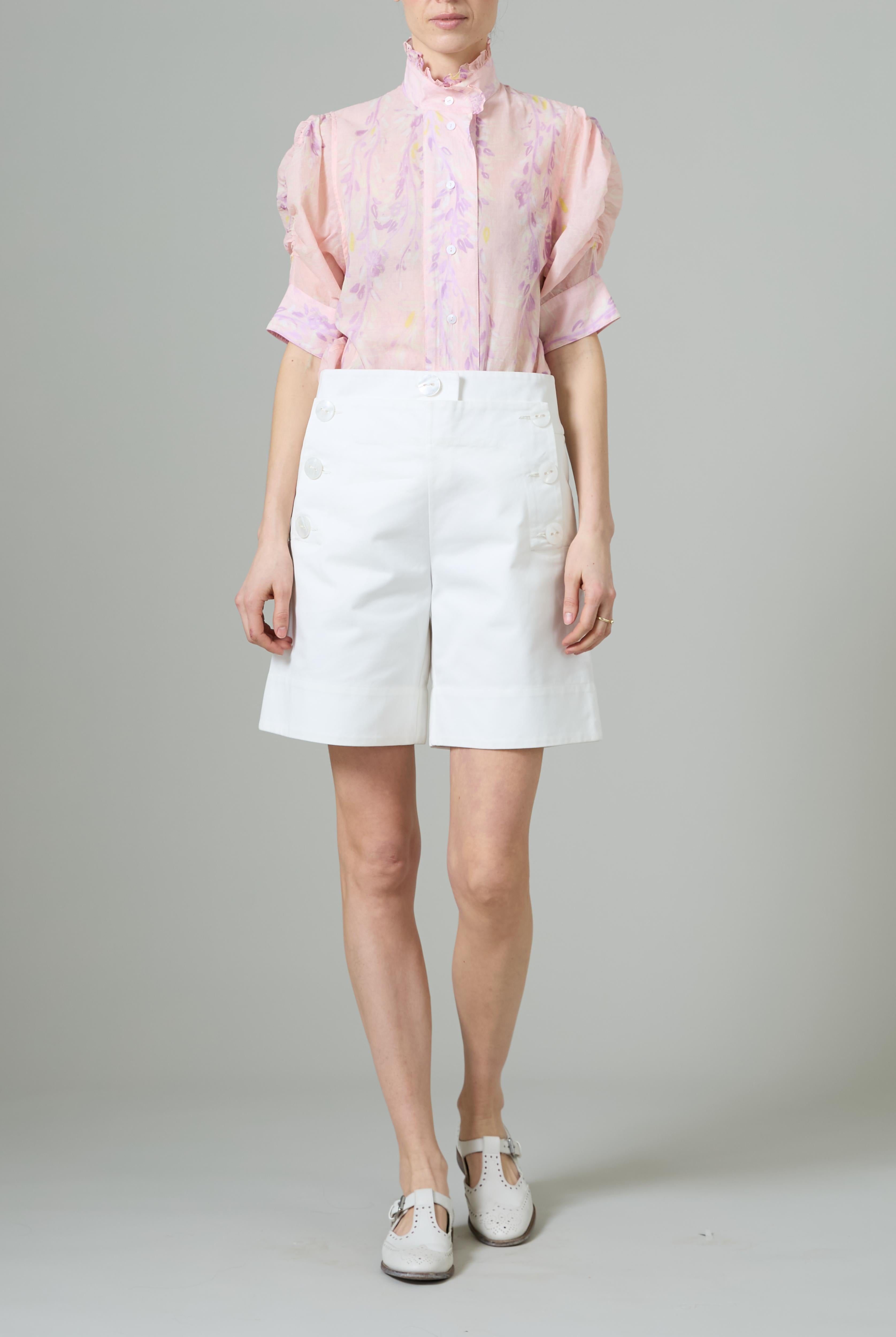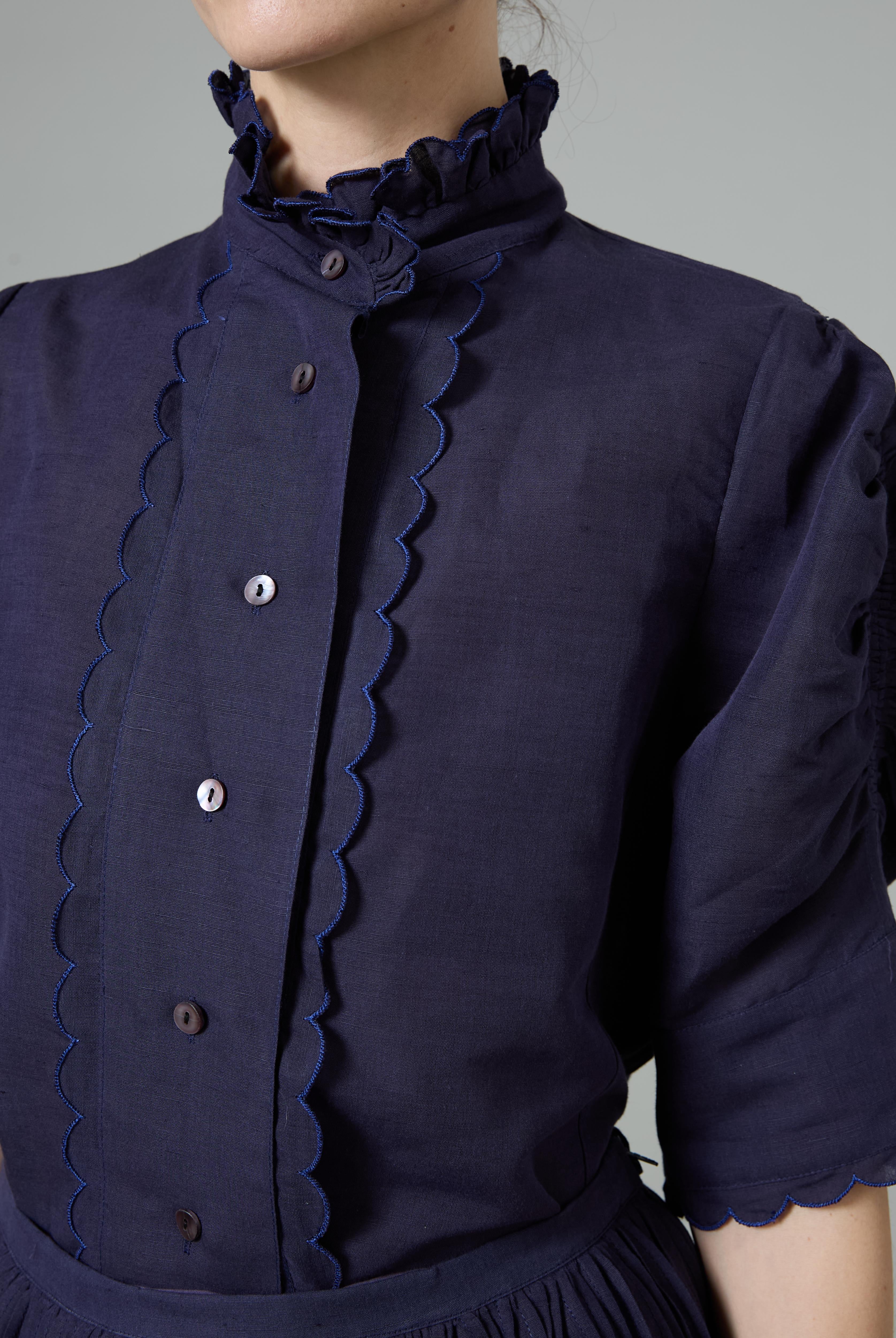 This sophisticated VITA blouse channels Edwardian elegance with its dramatic Gigot sleeves and delicate ruffle collar. Crafted in lightweight cotton voile, it features an intricate floral eyelet pattern that catches the light beautifully. The soft, tender yellow hue brings warmth and joy to any wardrobe. Style it with our Pamela full circle skirt for a complete, romantic look.