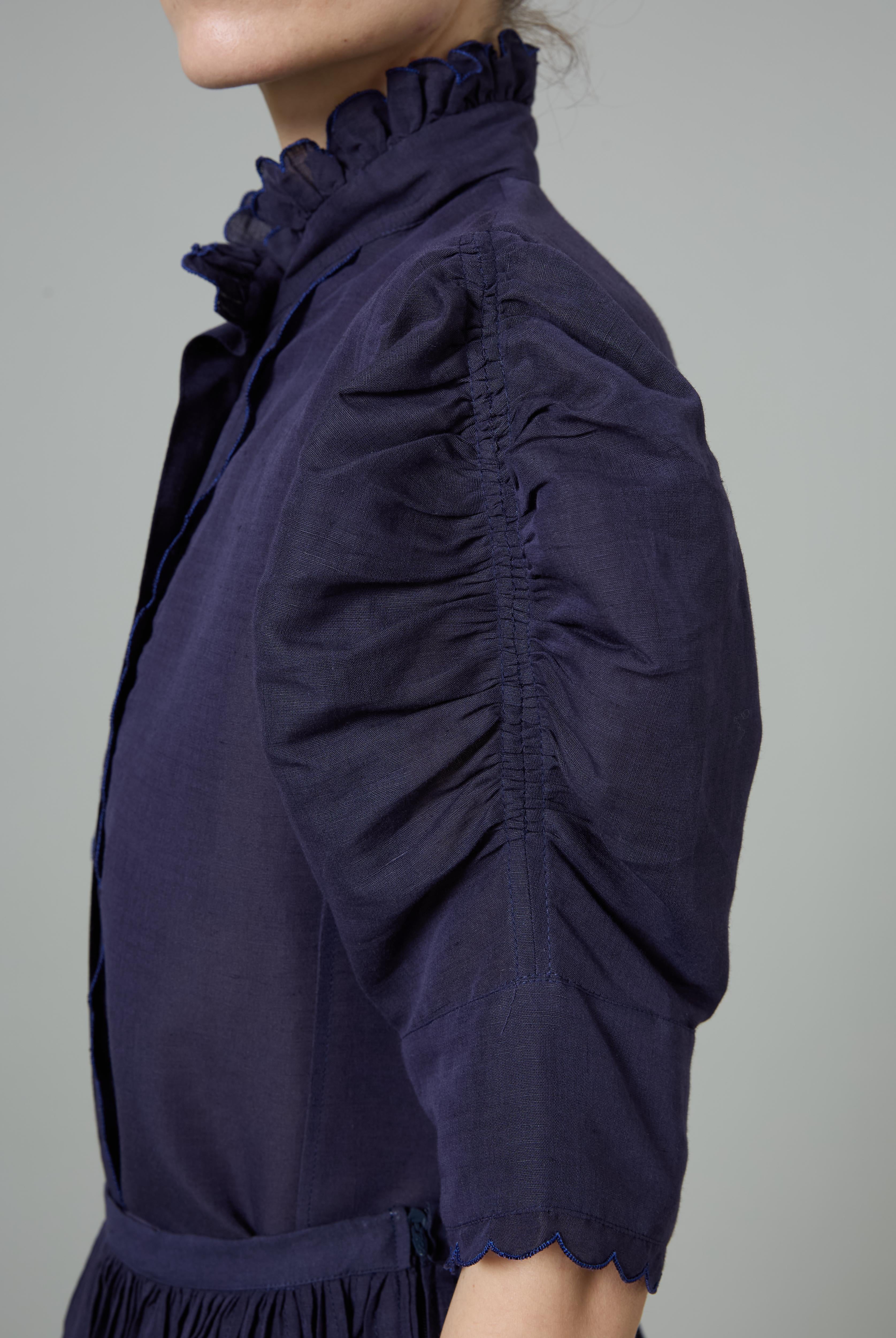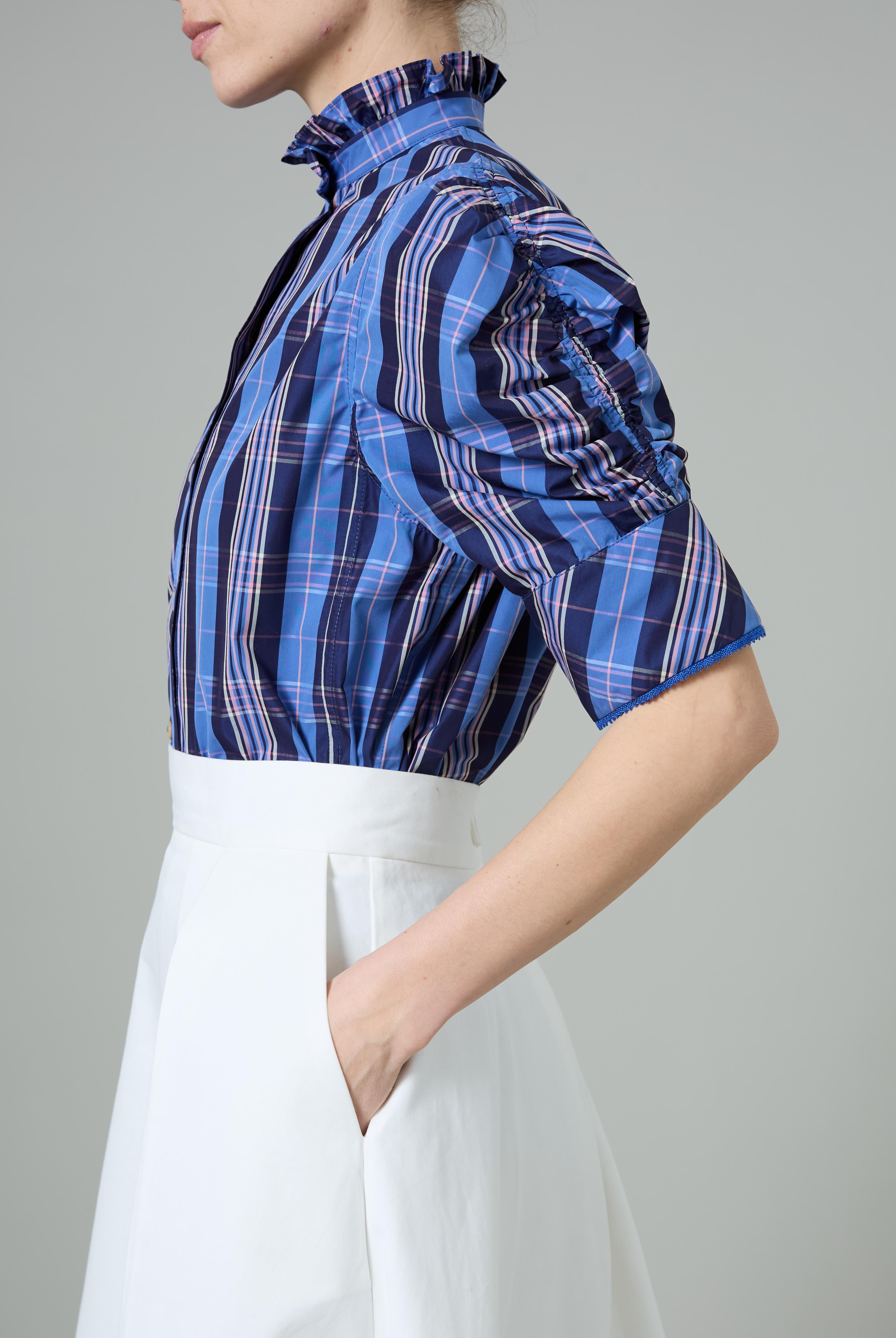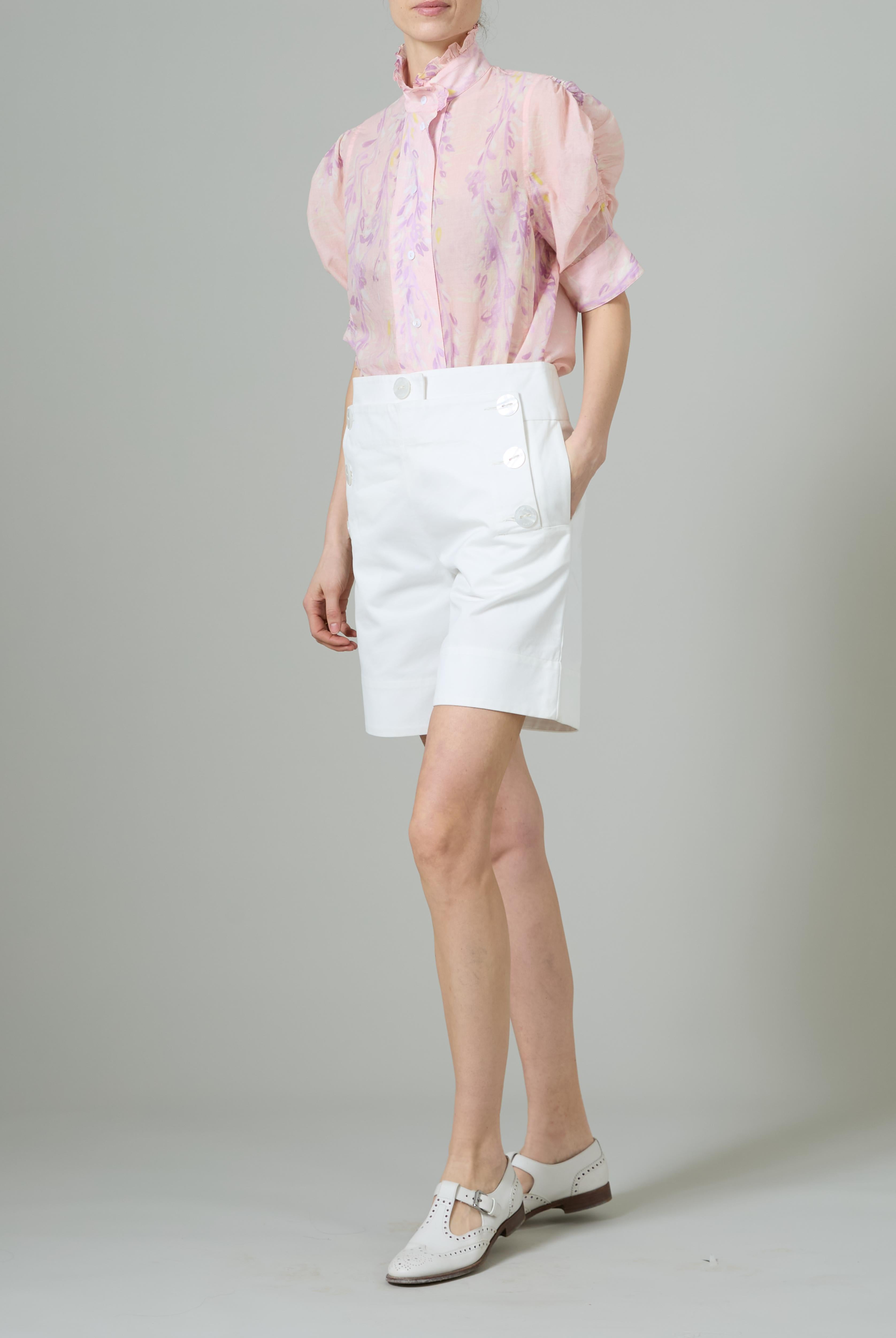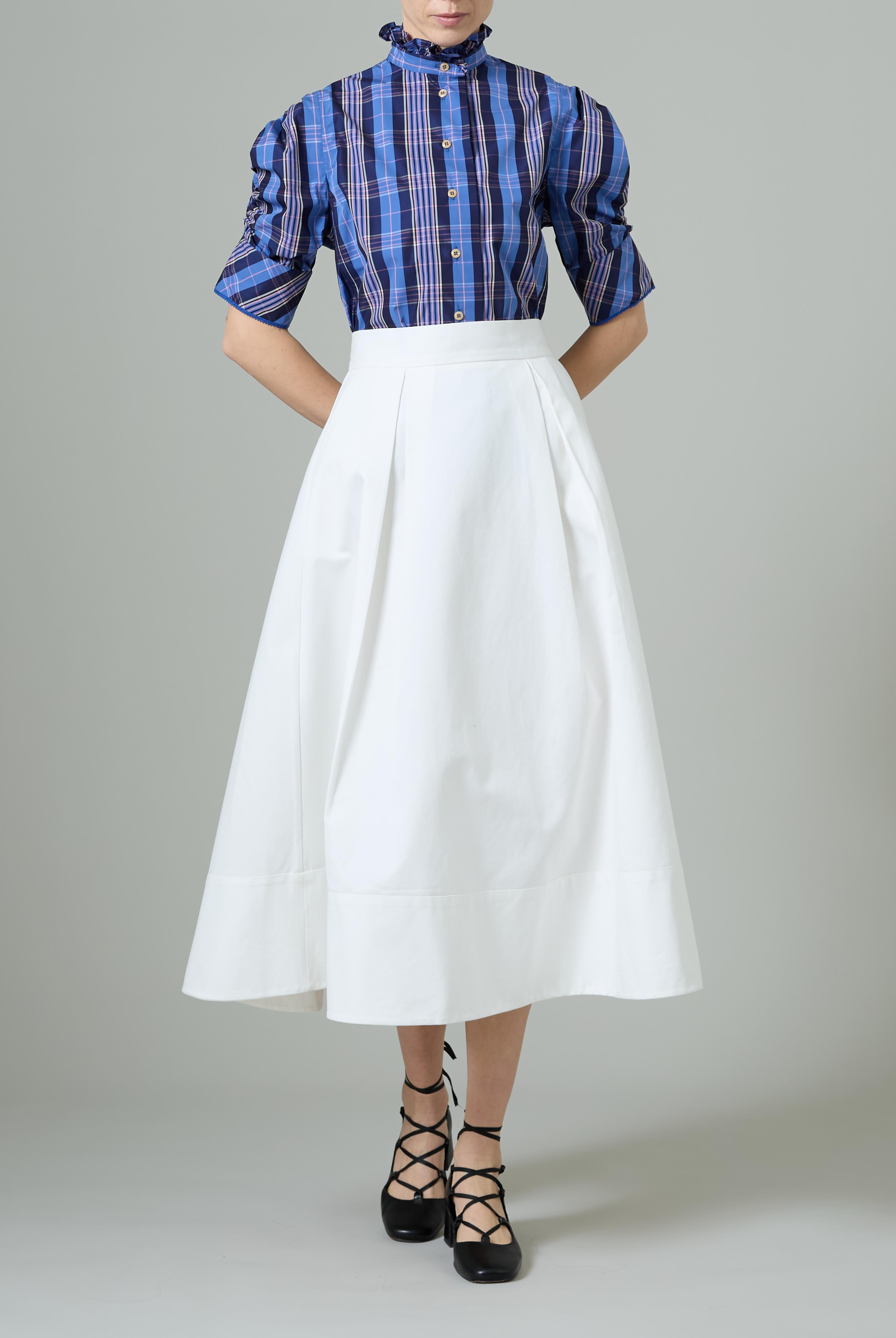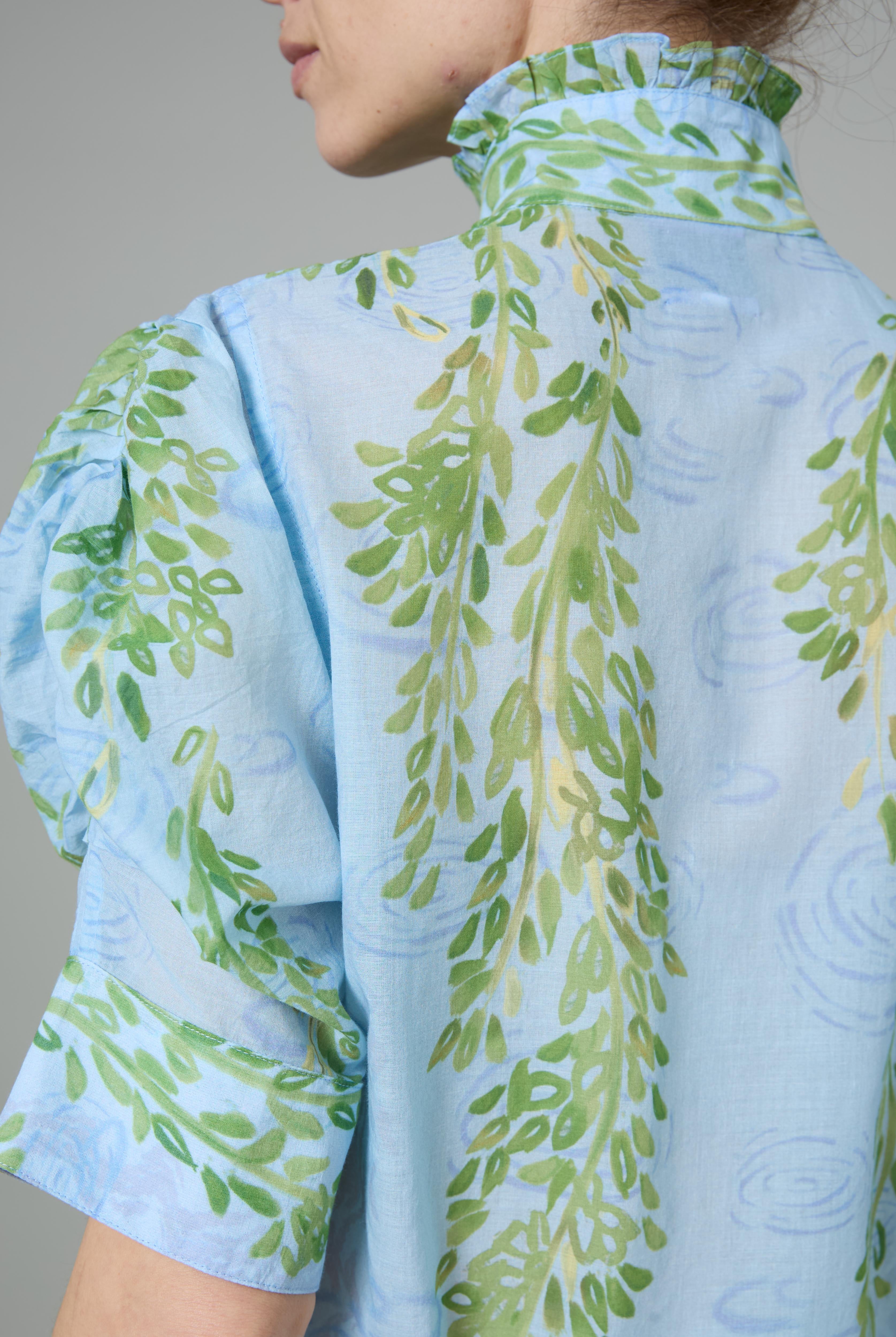 This sophisticated VITA blouse channels Edwardian elegance with its dramatic Gigot sleeves and delicate ruffle collar. Crafted in lightweight cotton voile, it features an intricate floral eyelet pattern that catches the light beautifully. The soft, tender yellow hue brings warmth and joy to any wardrobe. Style it with our Pamela full circle skirt for a complete, romantic look.