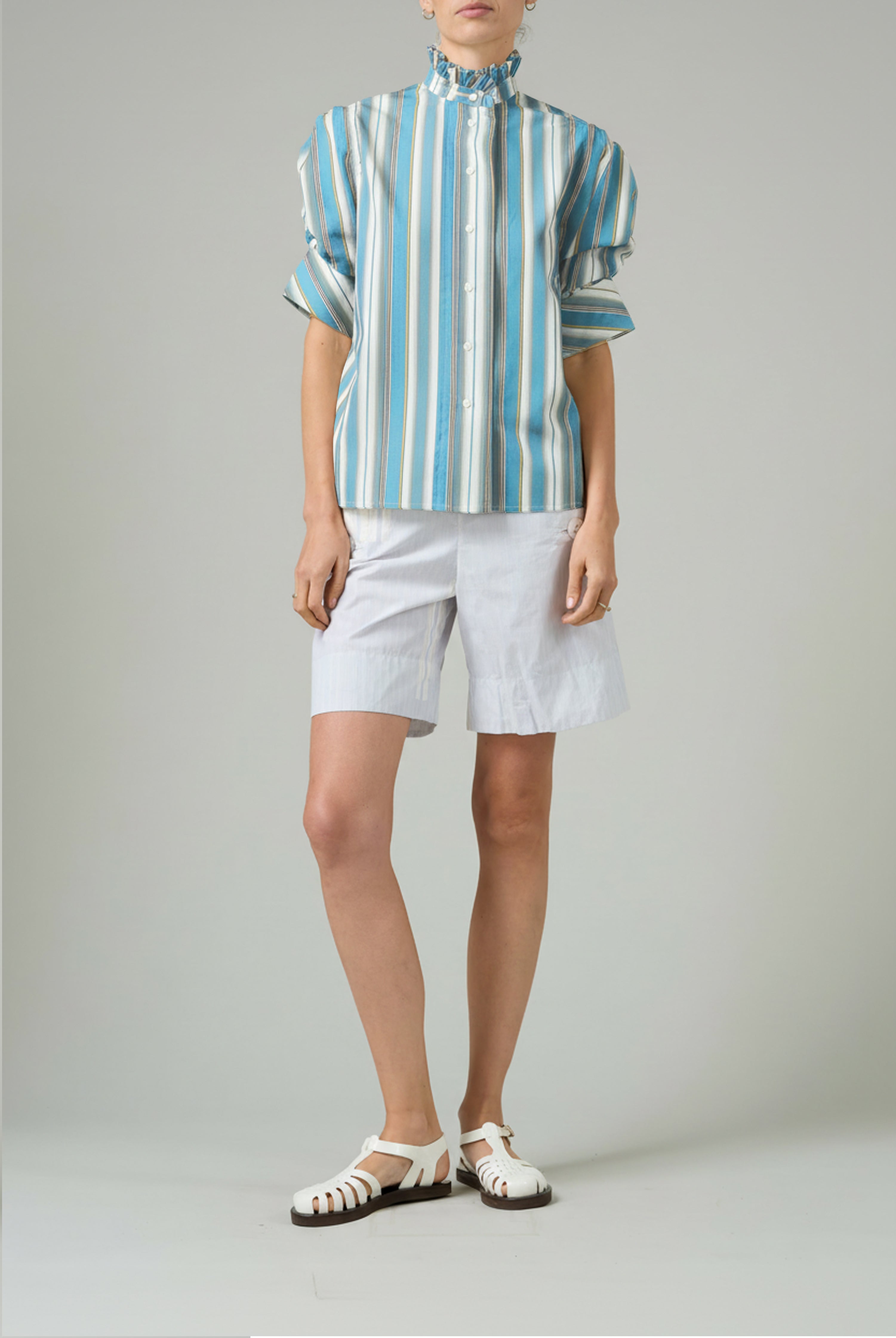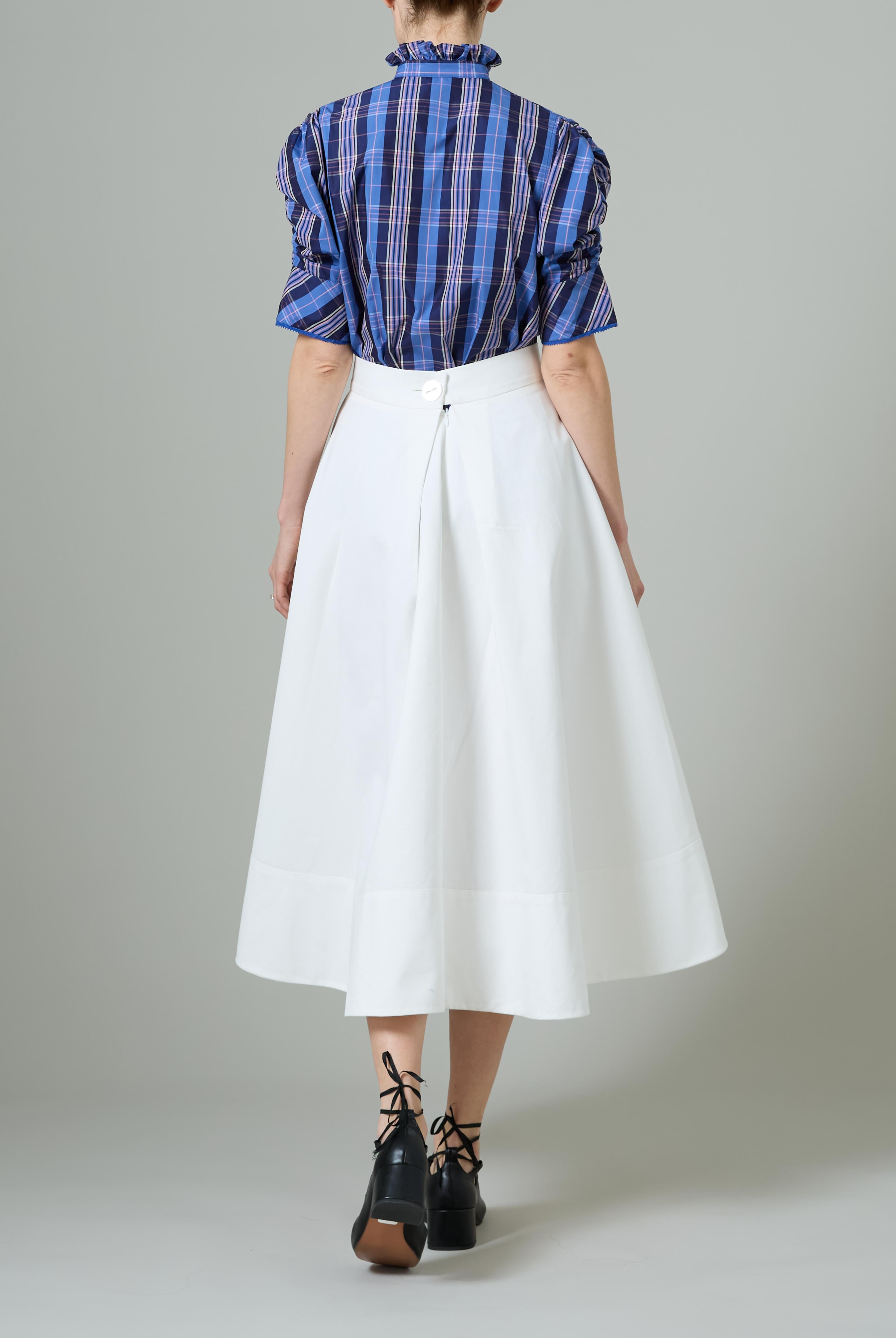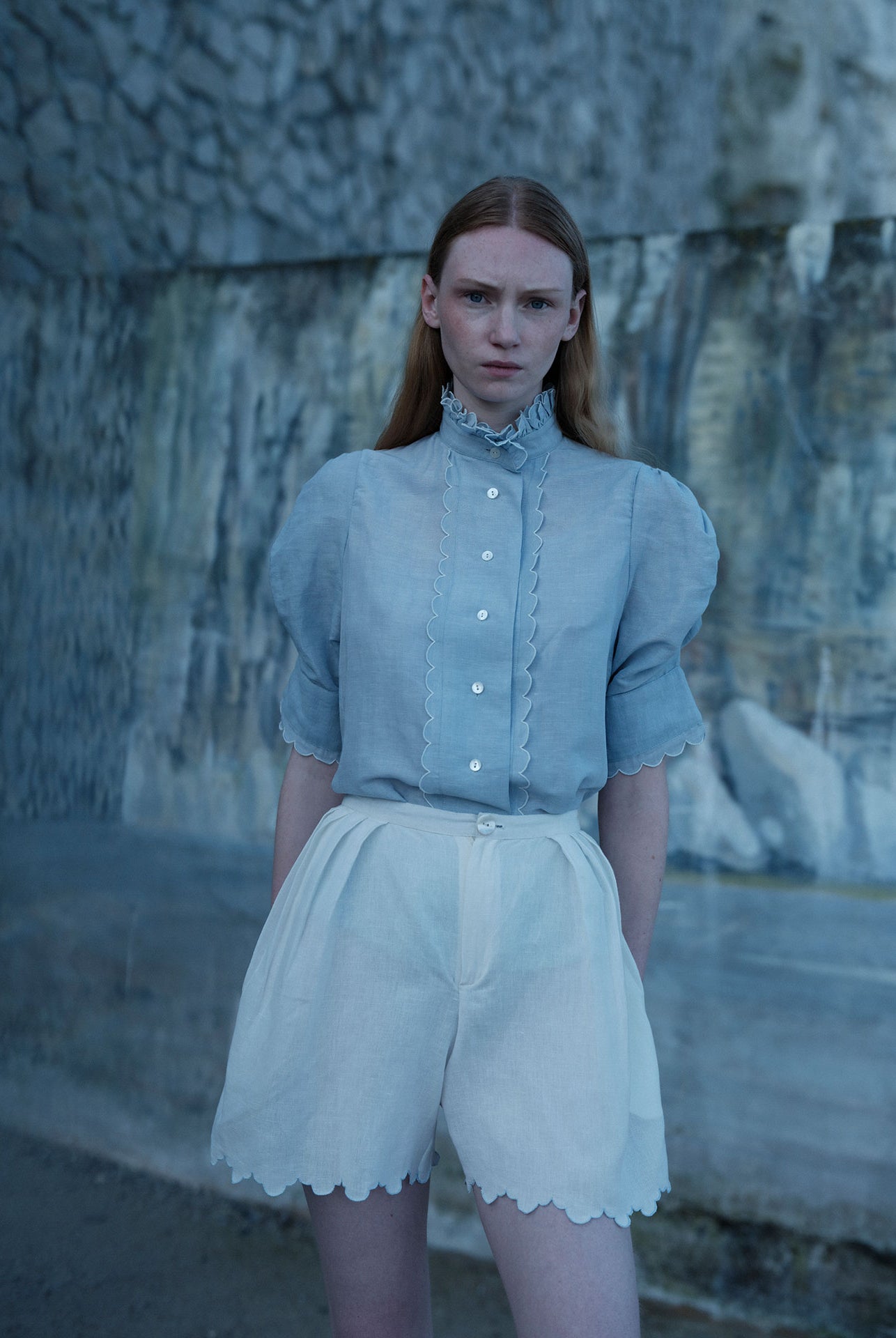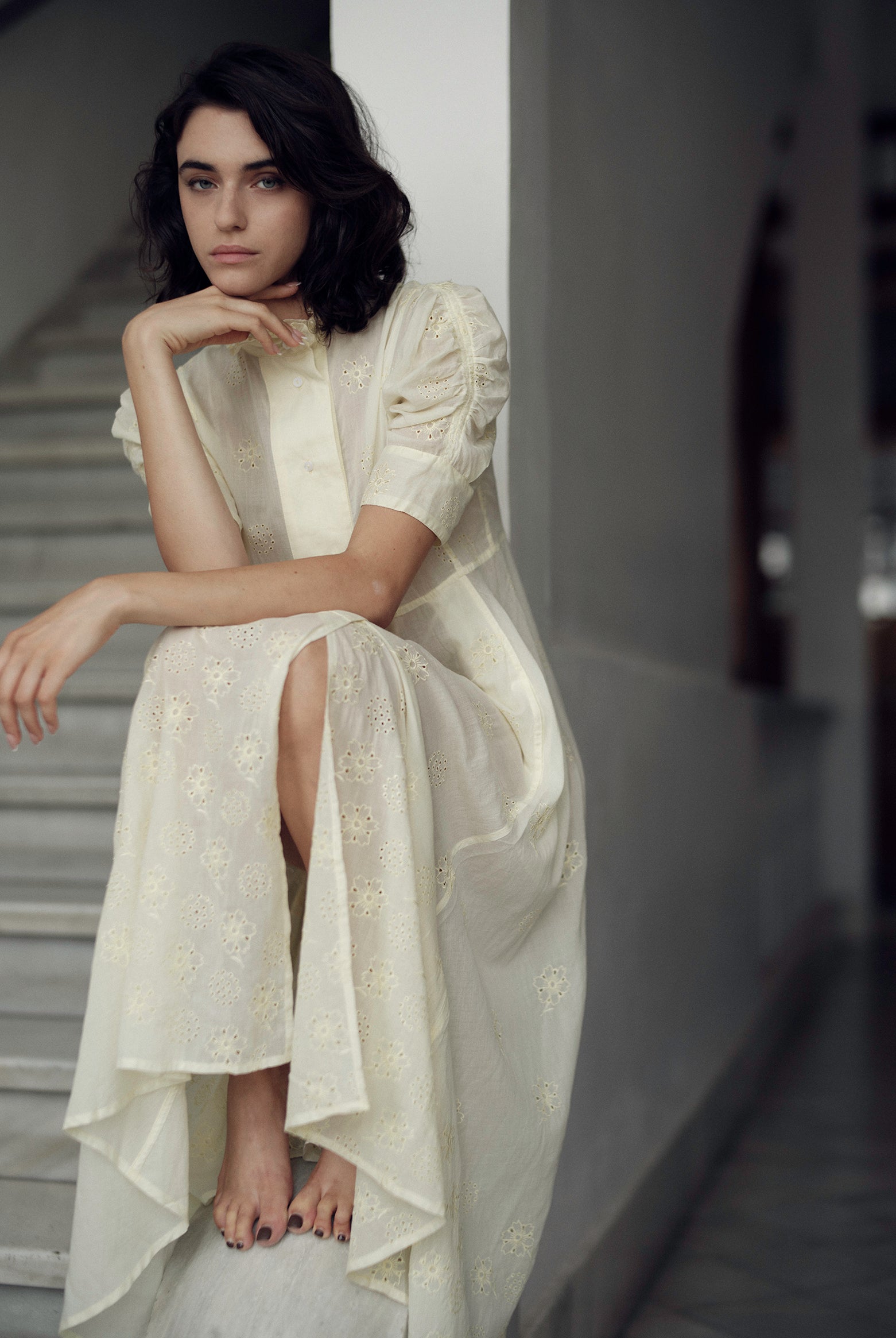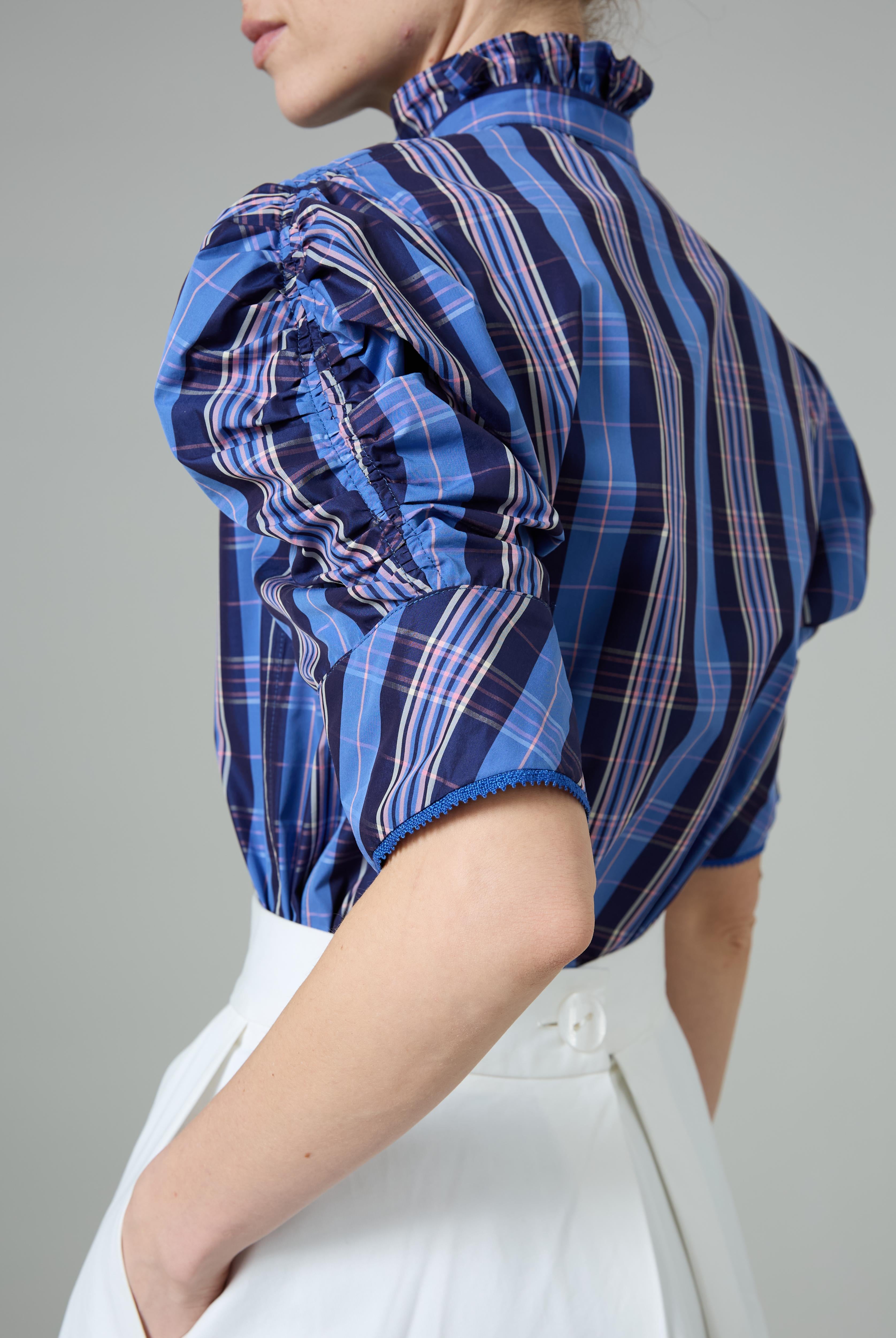 This sophisticated VITA blouse channels Edwardian elegance with its dramatic Gigot sleeves and delicate ruffle collar. Crafted in lightweight cotton voile, it features an intricate floral eyelet pattern that catches the light beautifully. The soft, tender yellow hue brings warmth and joy to any wardrobe. Style it with our Pamela full circle skirt for a complete, romantic look.