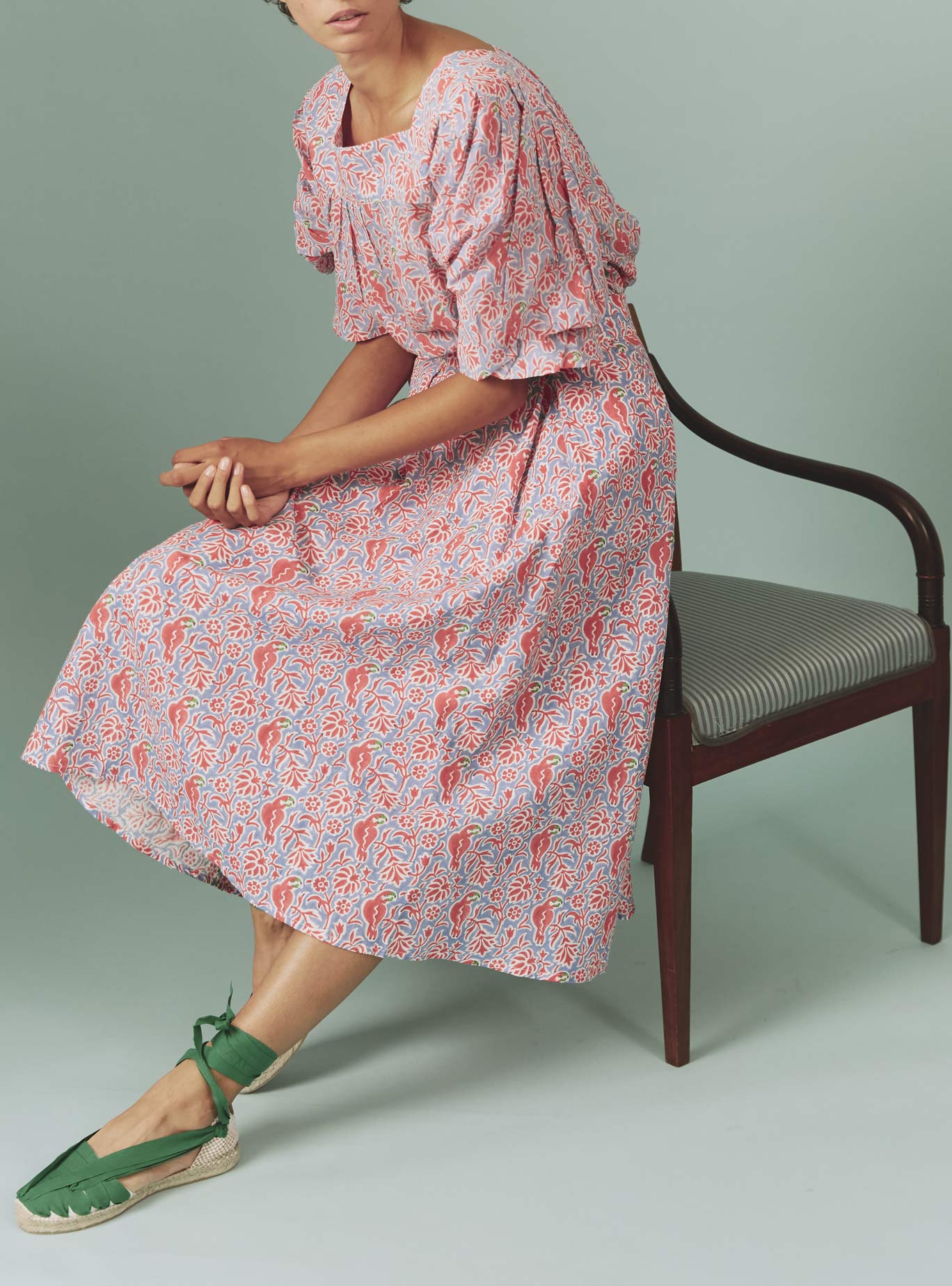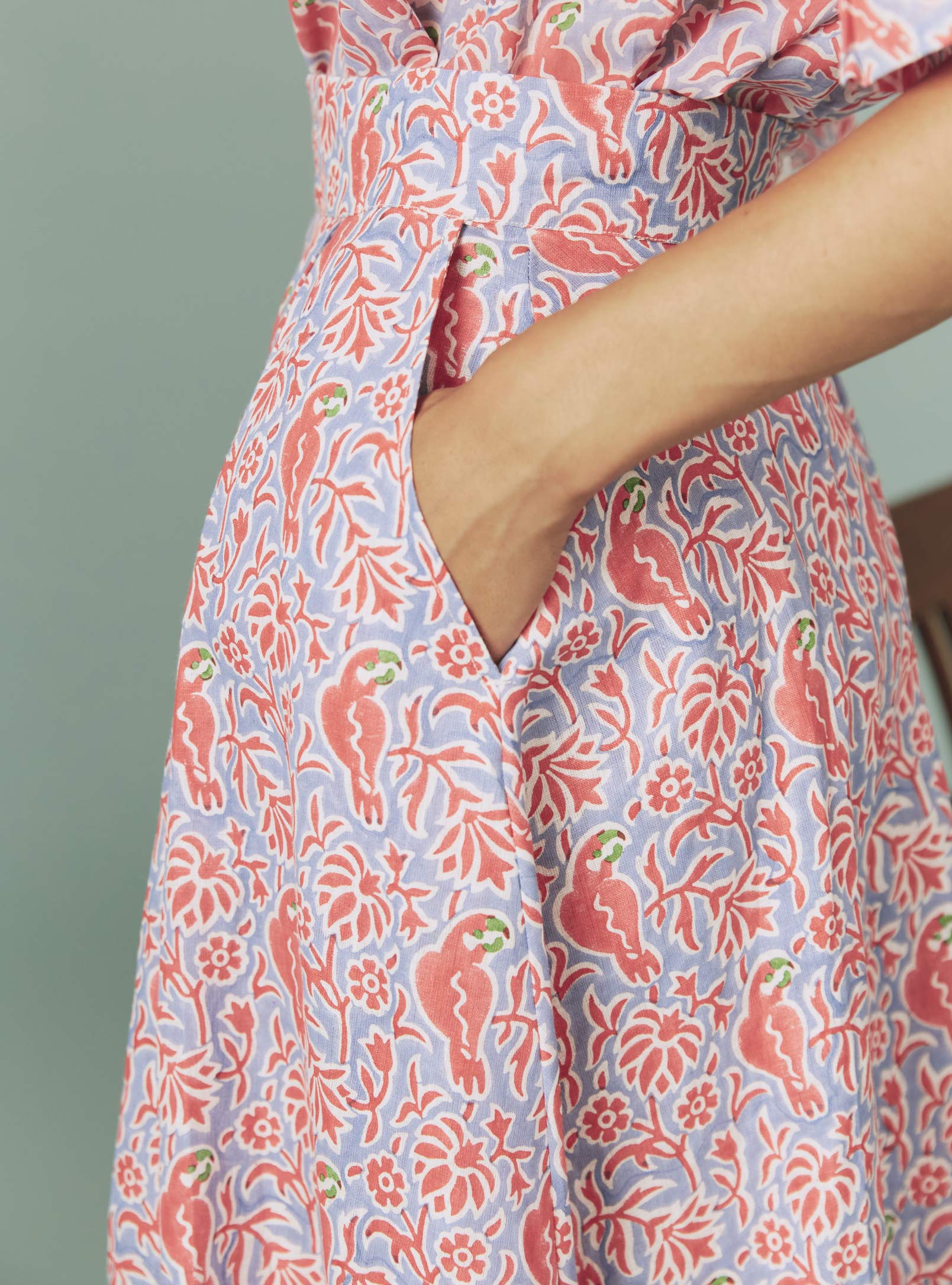 Crafted in a pure linen with hand-block printed parrot pattern for summer 2024.