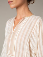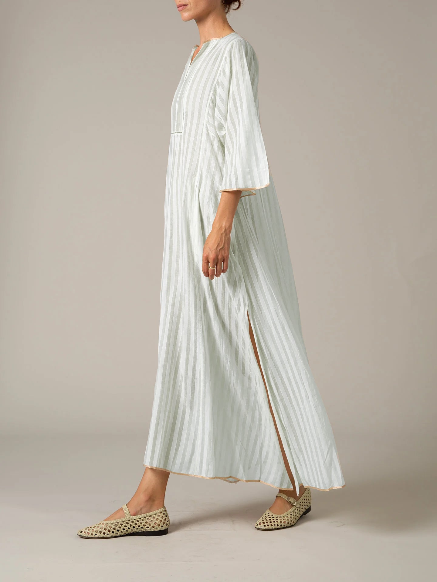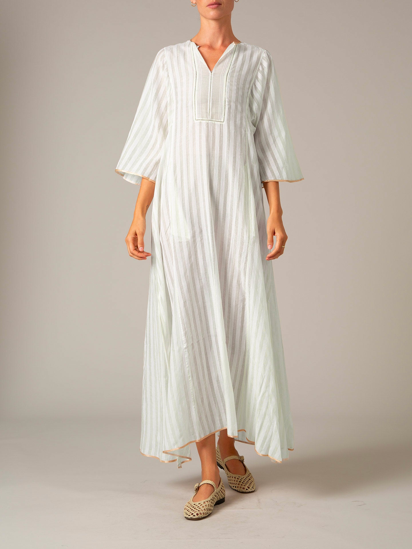A tribute to the Middle East Kaftan heritage, the Summer 2025 version of RACHEL plays graphically with two different scales of stripes. Woven exclusively in Chanderi, made from a gracious cotton voile with a blend of silk.