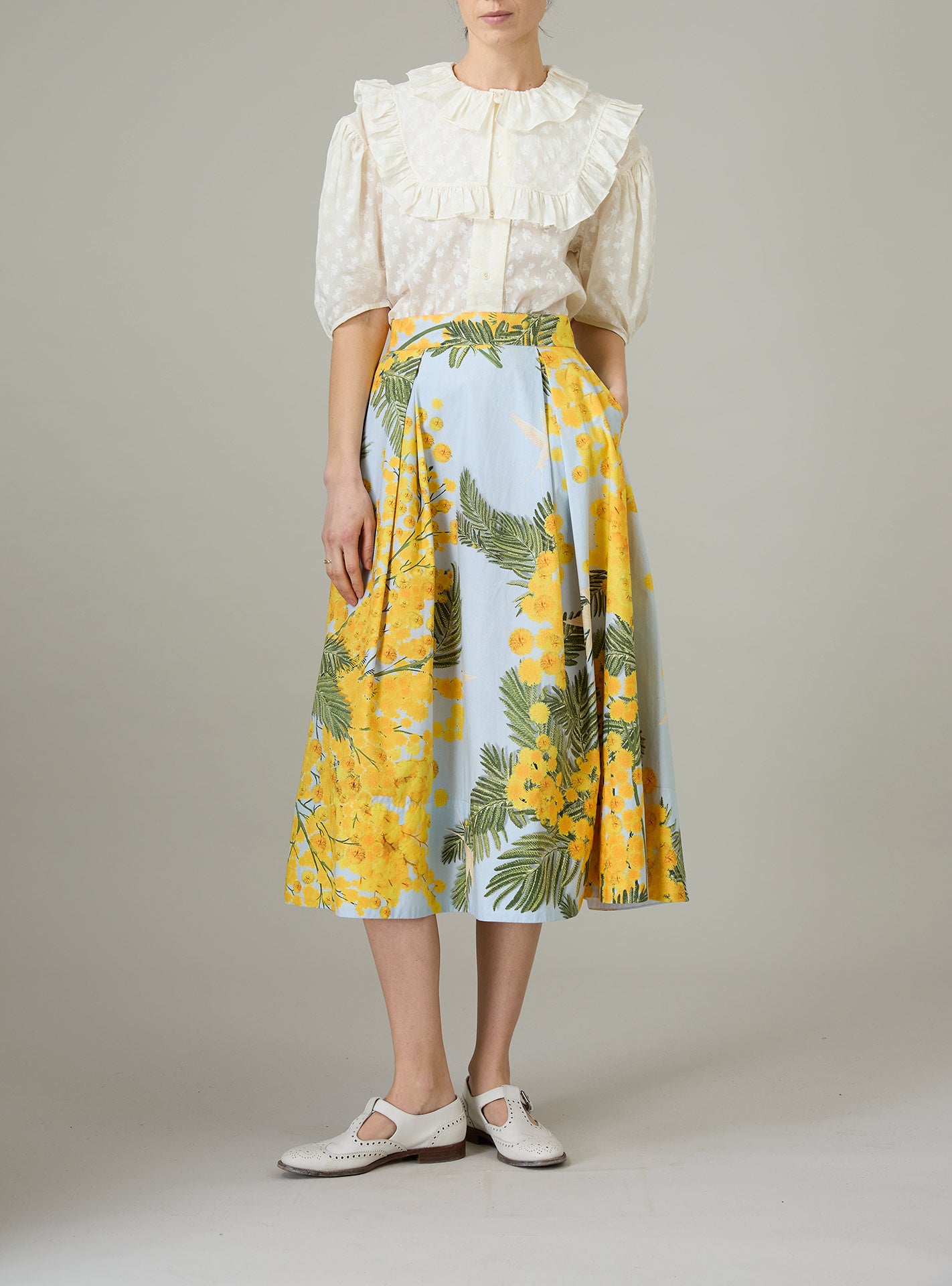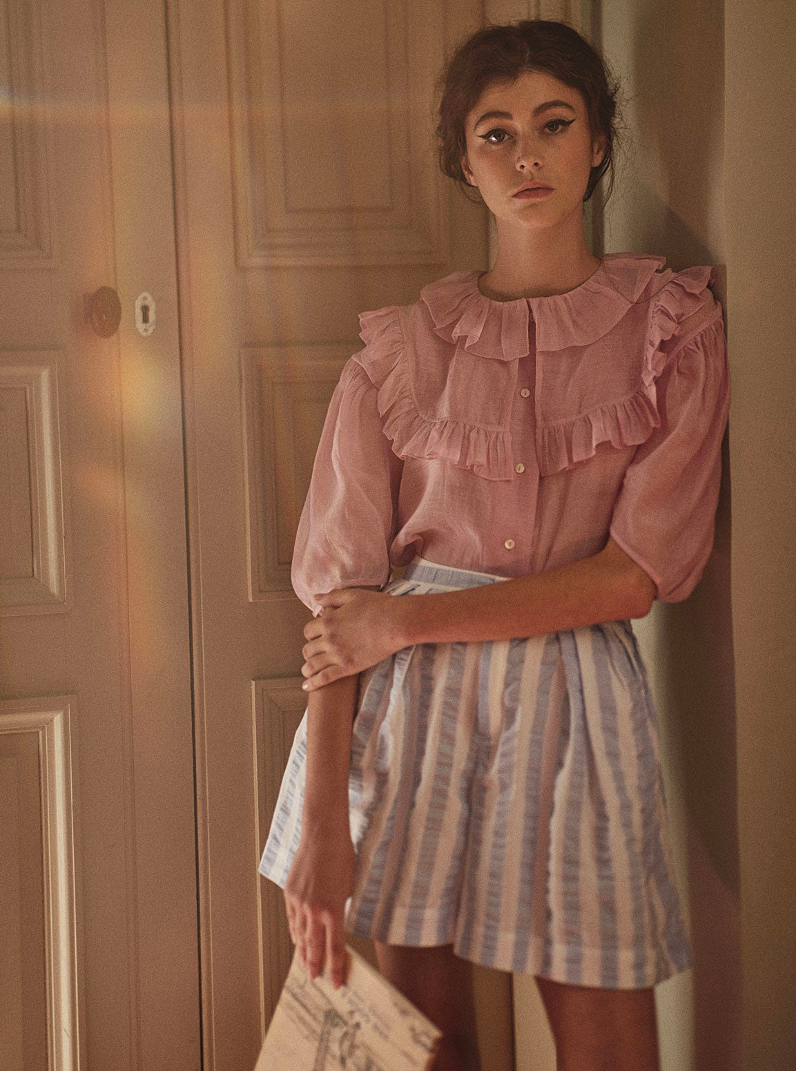 For our Pre-Spring 25 the Vanina blouse has been hand block-printed in a tiny pattern with flying birds and Flowers.