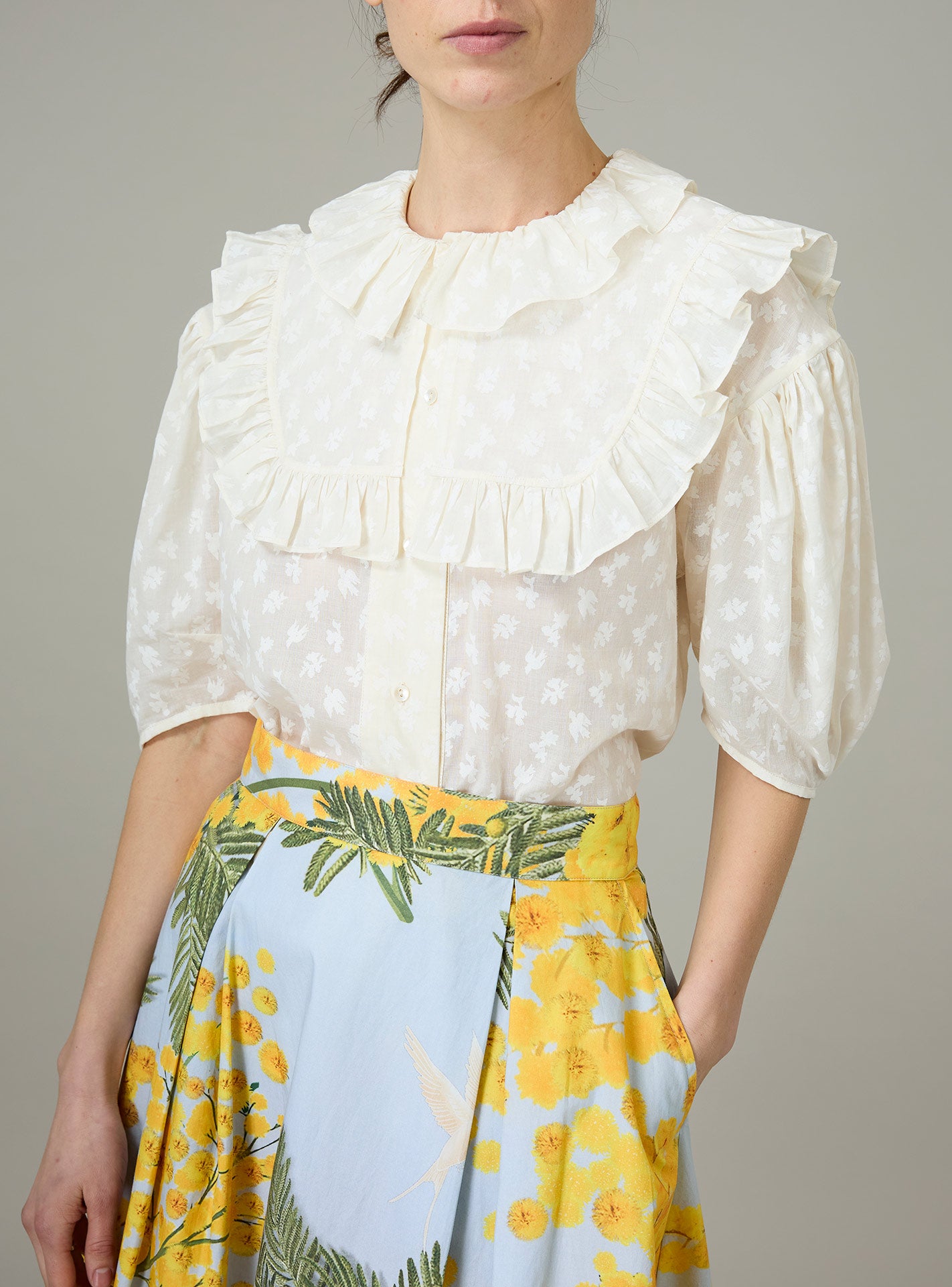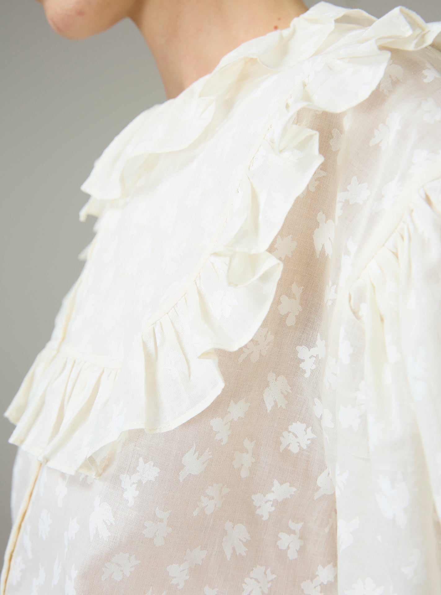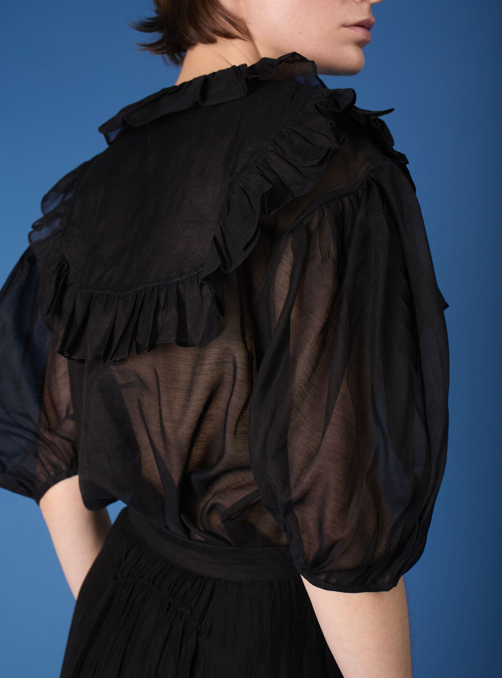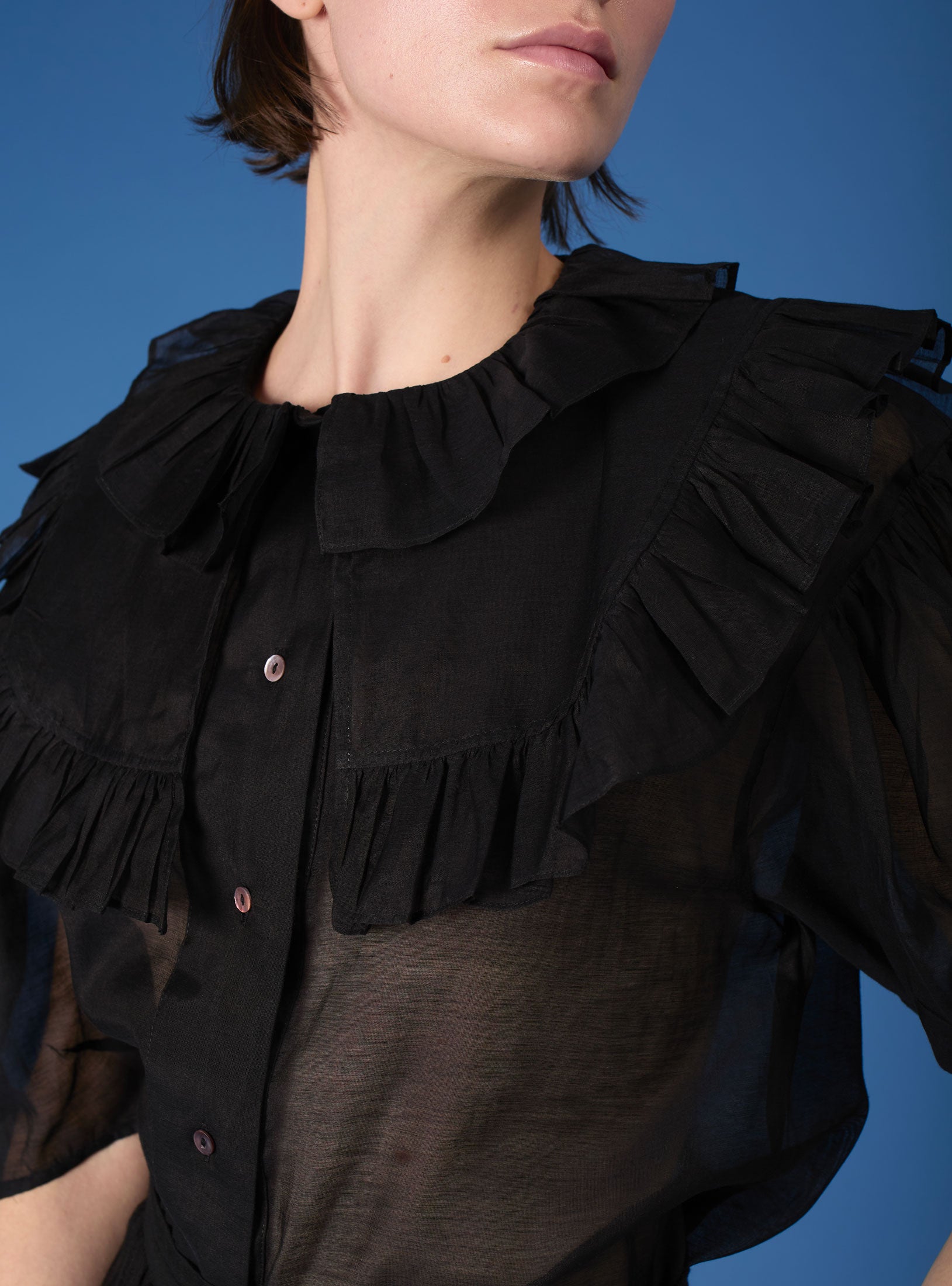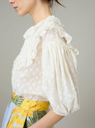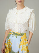 The Vanina Romantic blouse, with its ruffled collar and embellished yoke is easy to wear for many different occasions.