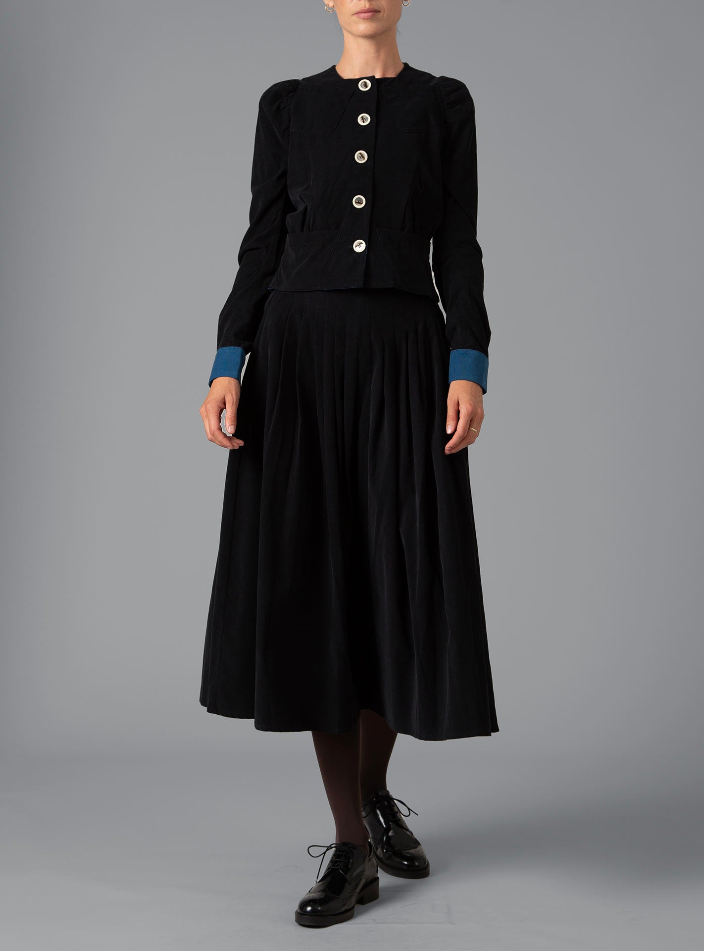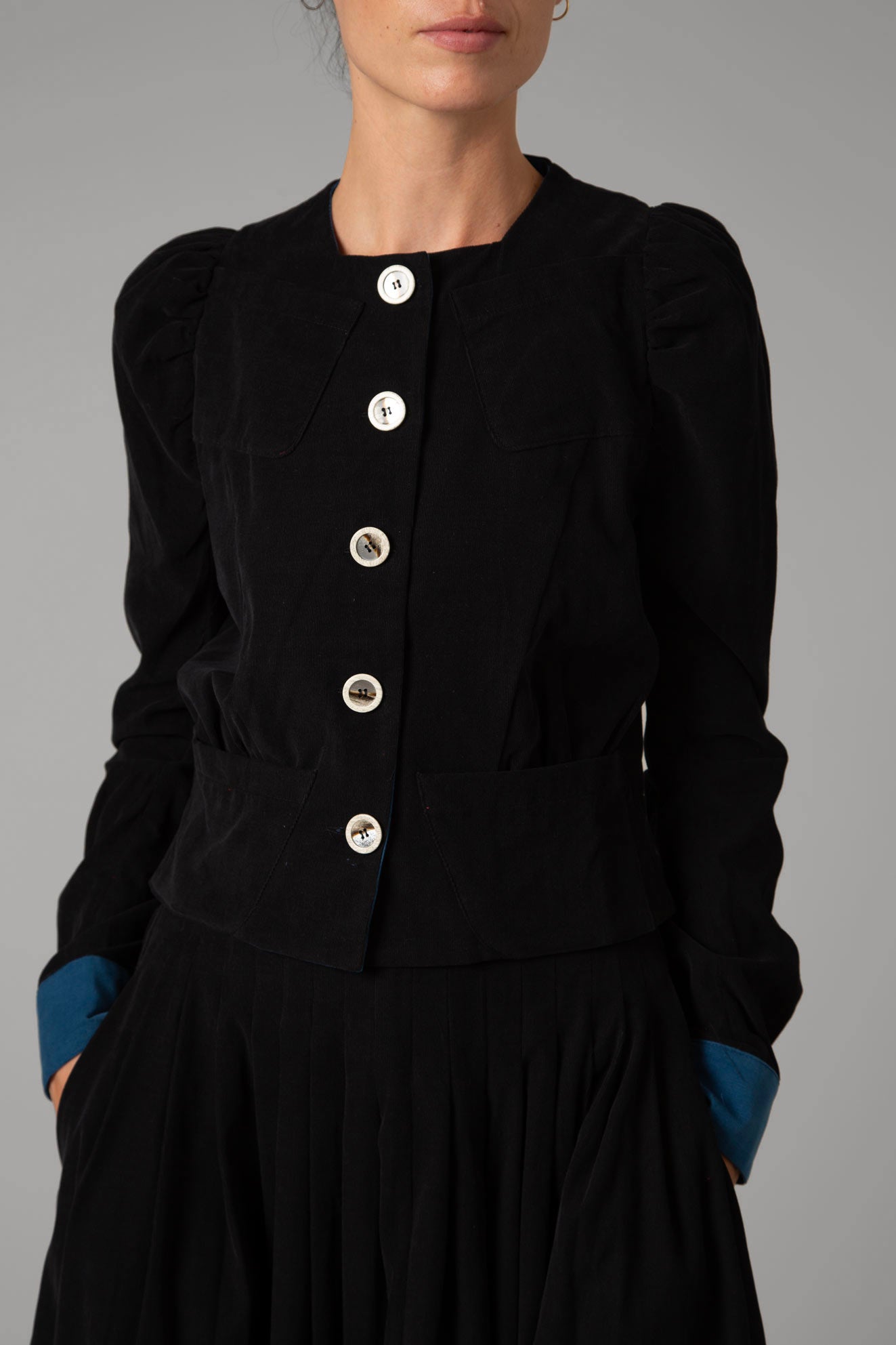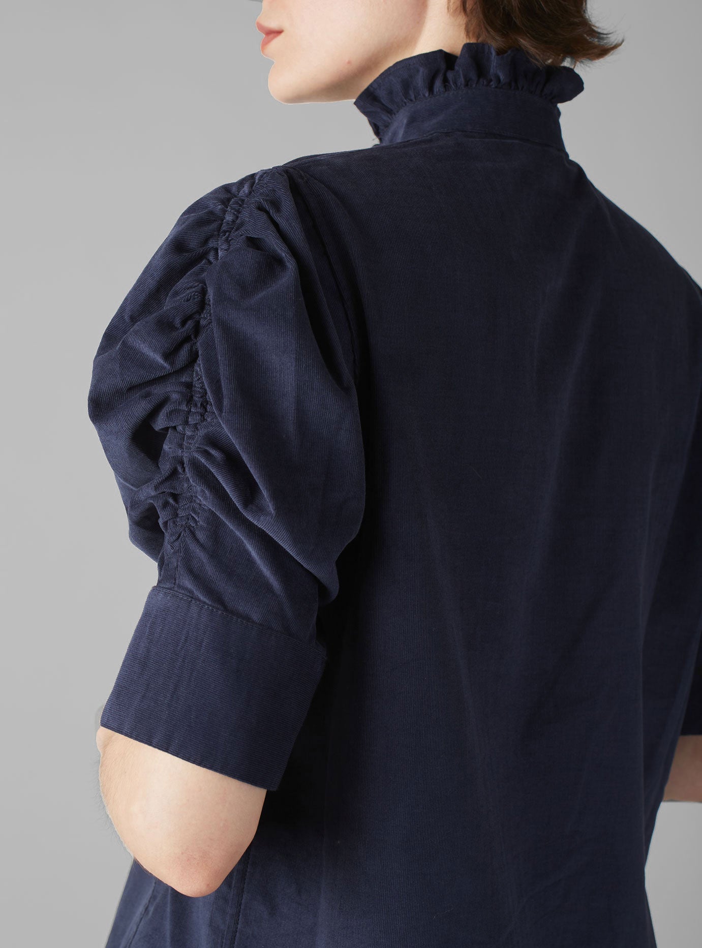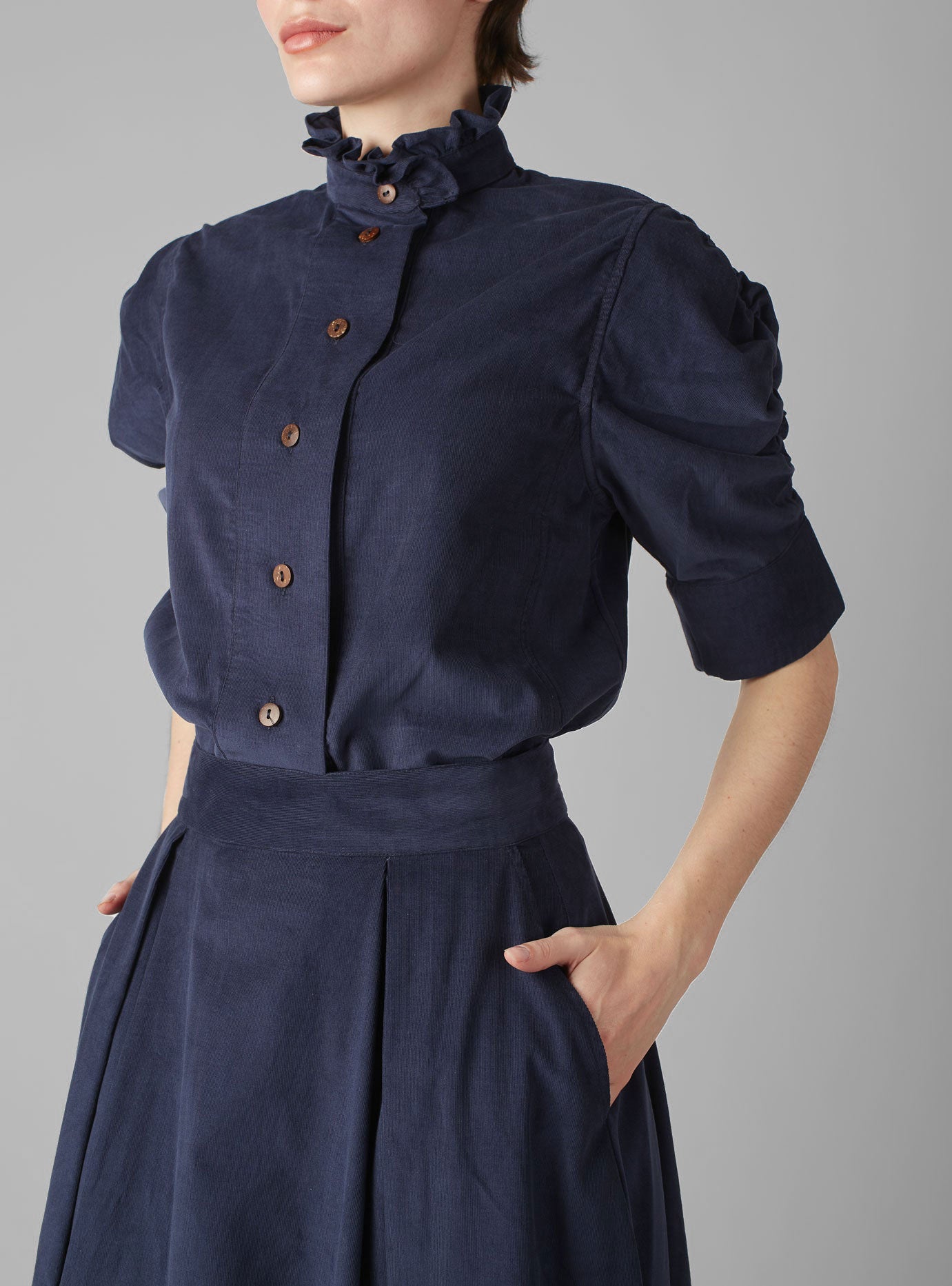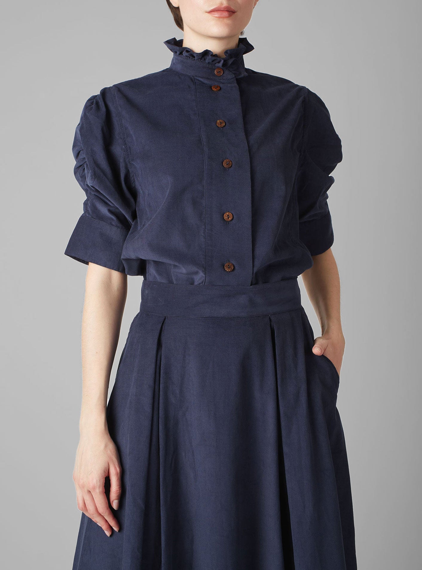 The sophisticated Vita shirt with its Gigot sleeves and ruffle collar is a wink to the Edwardian era.