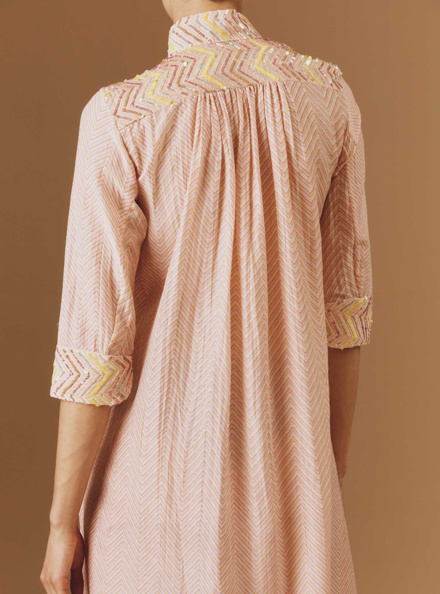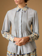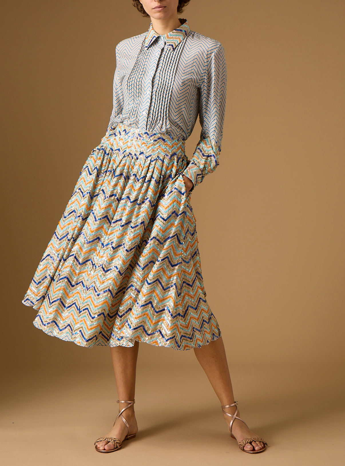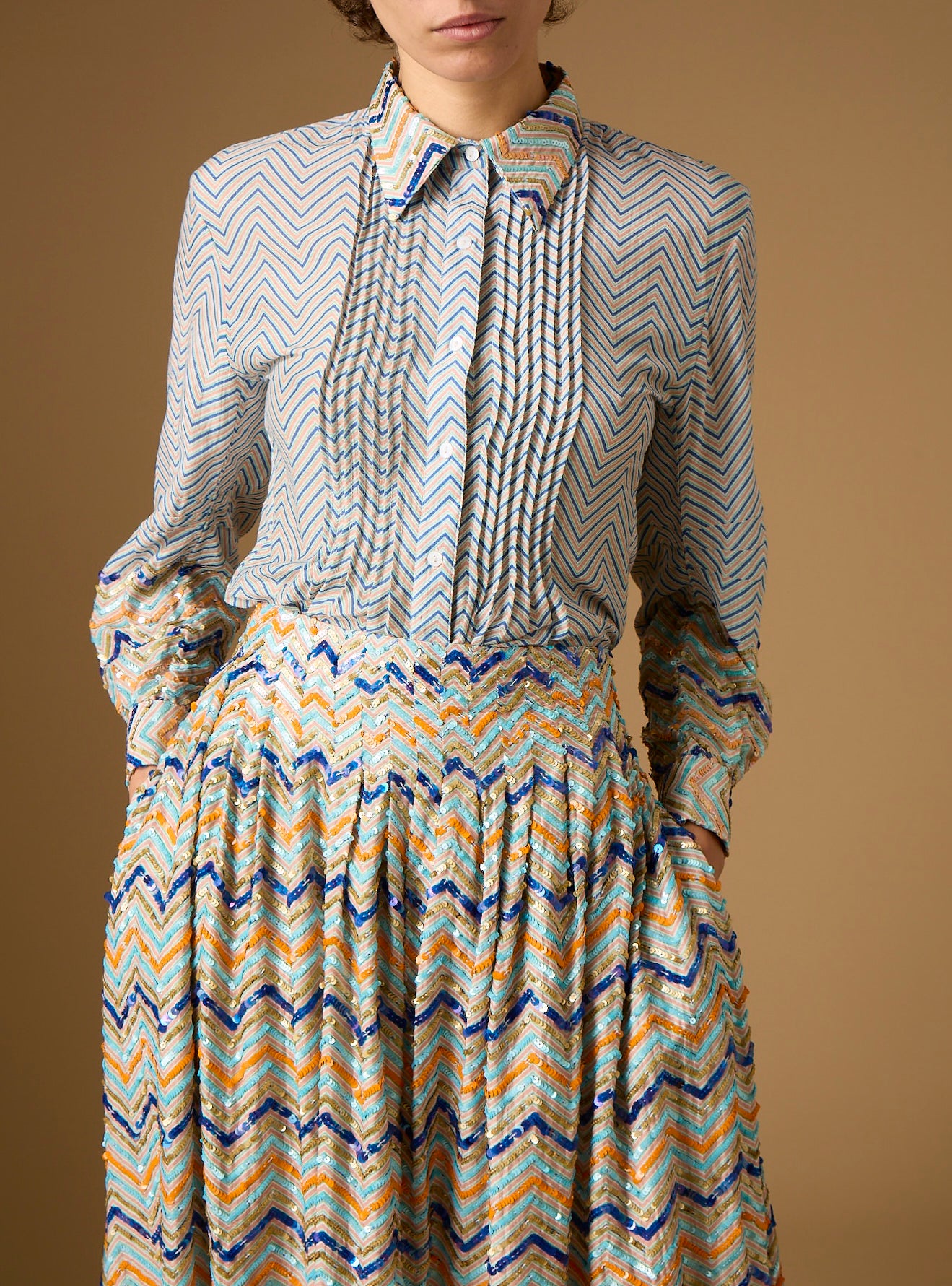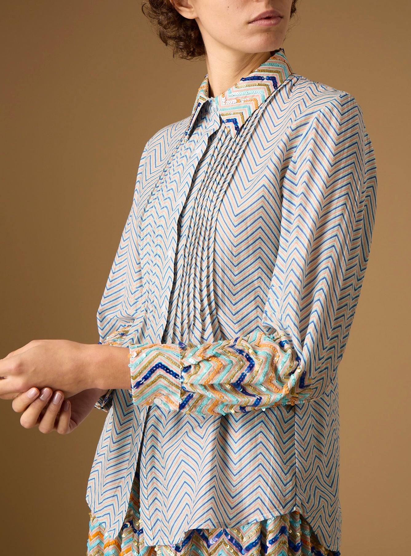 This kind of mens shirt revisited in a new embroidered version for summer 2023: yoke and cuffs are all hand-embroidered with sequins on cotton and silk, with a screen-printed zigzag pattern, evoking the cultures of the Silk Road.