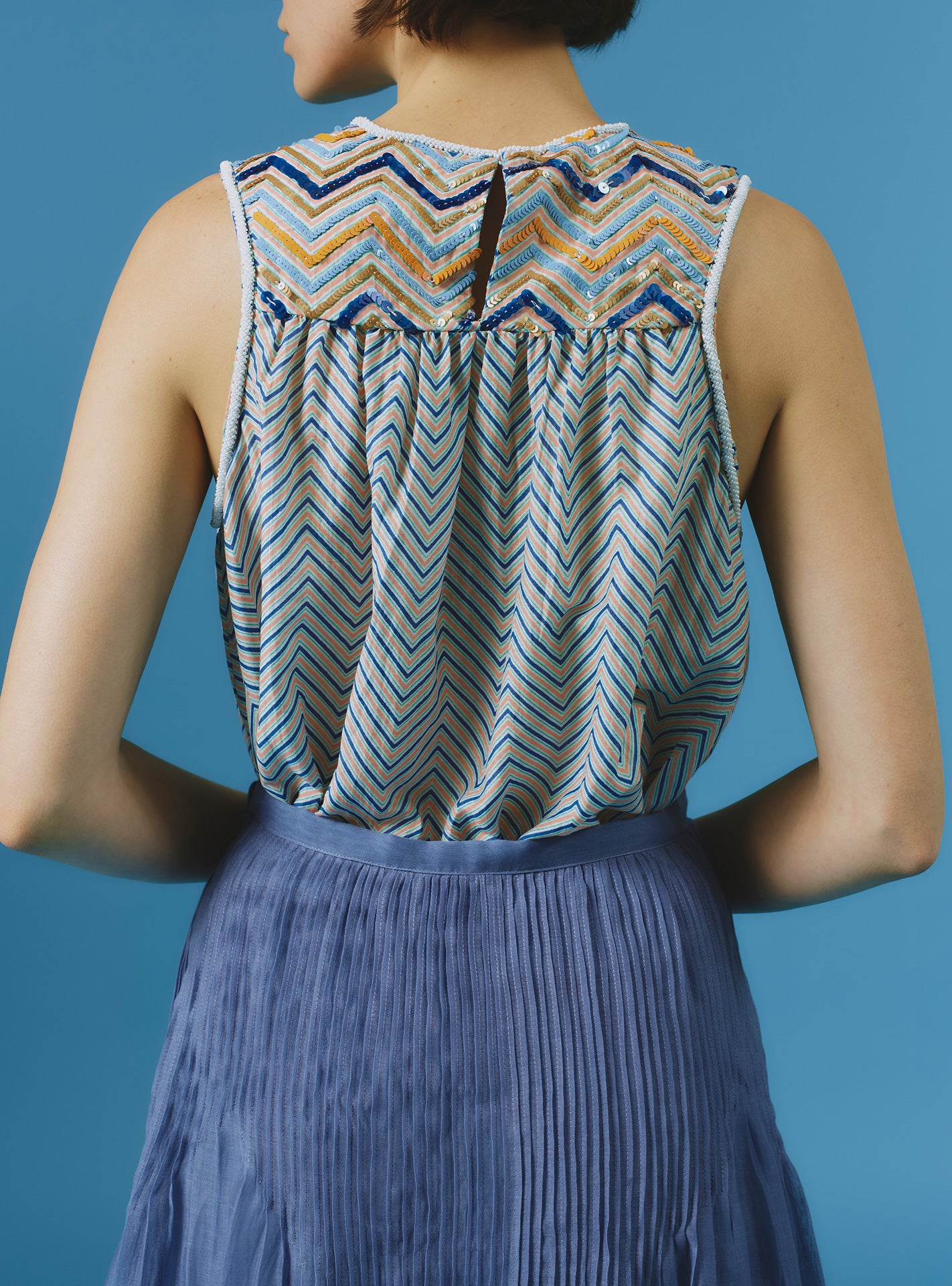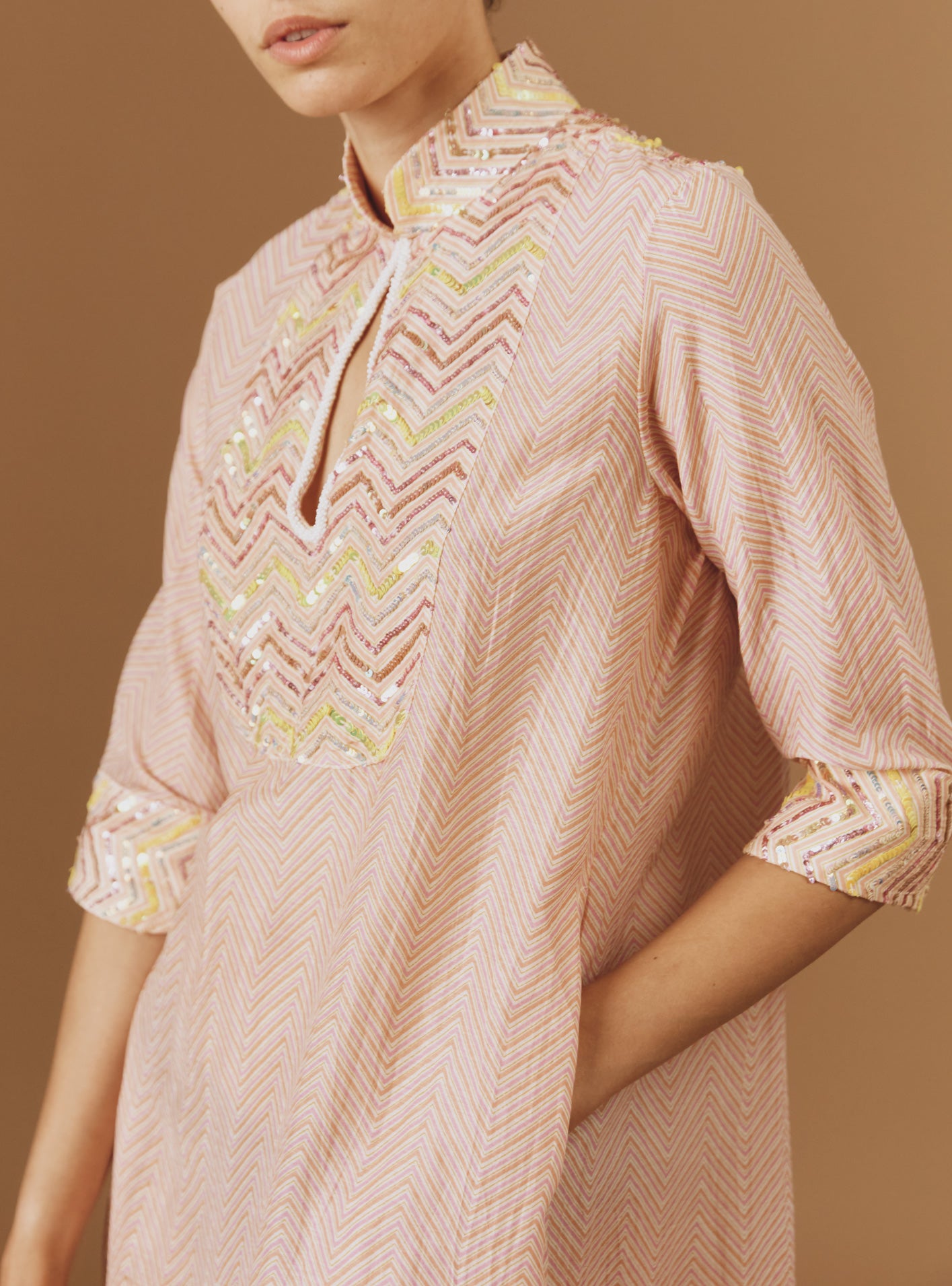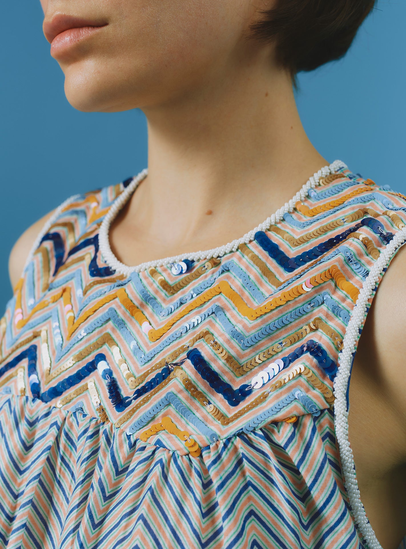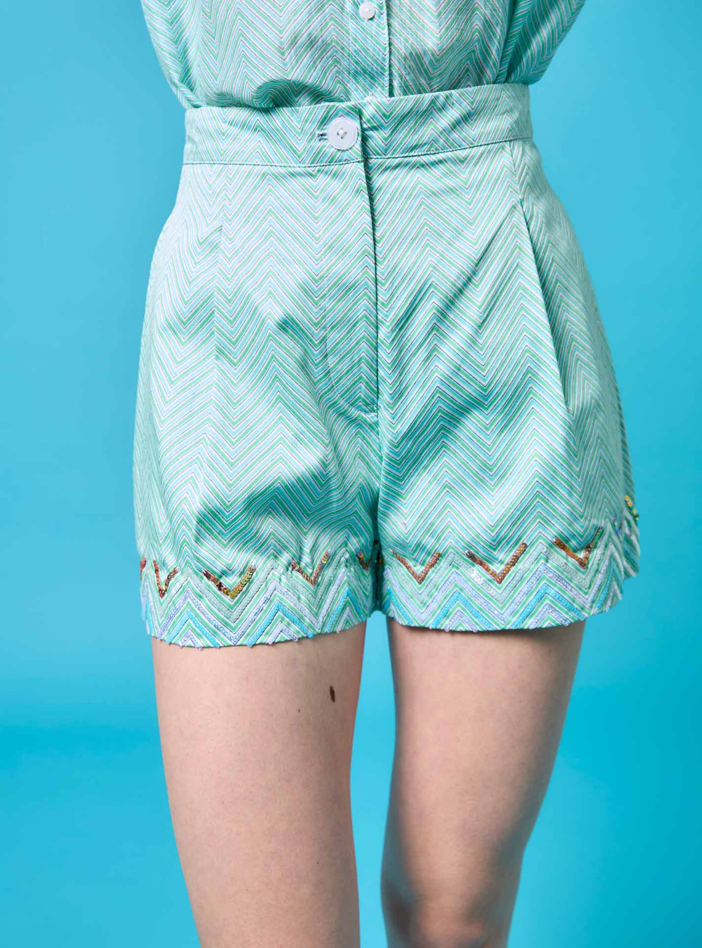 This kind of mens shirt revisited in a new embroidered version for summer 2023: yoke and cuffs are all hand-embroidered with sequins on cotton and silk, with a screen-printed zigzag pattern, evoking the cultures of the Silk Road.