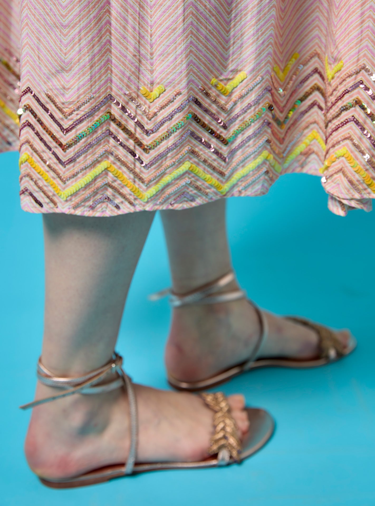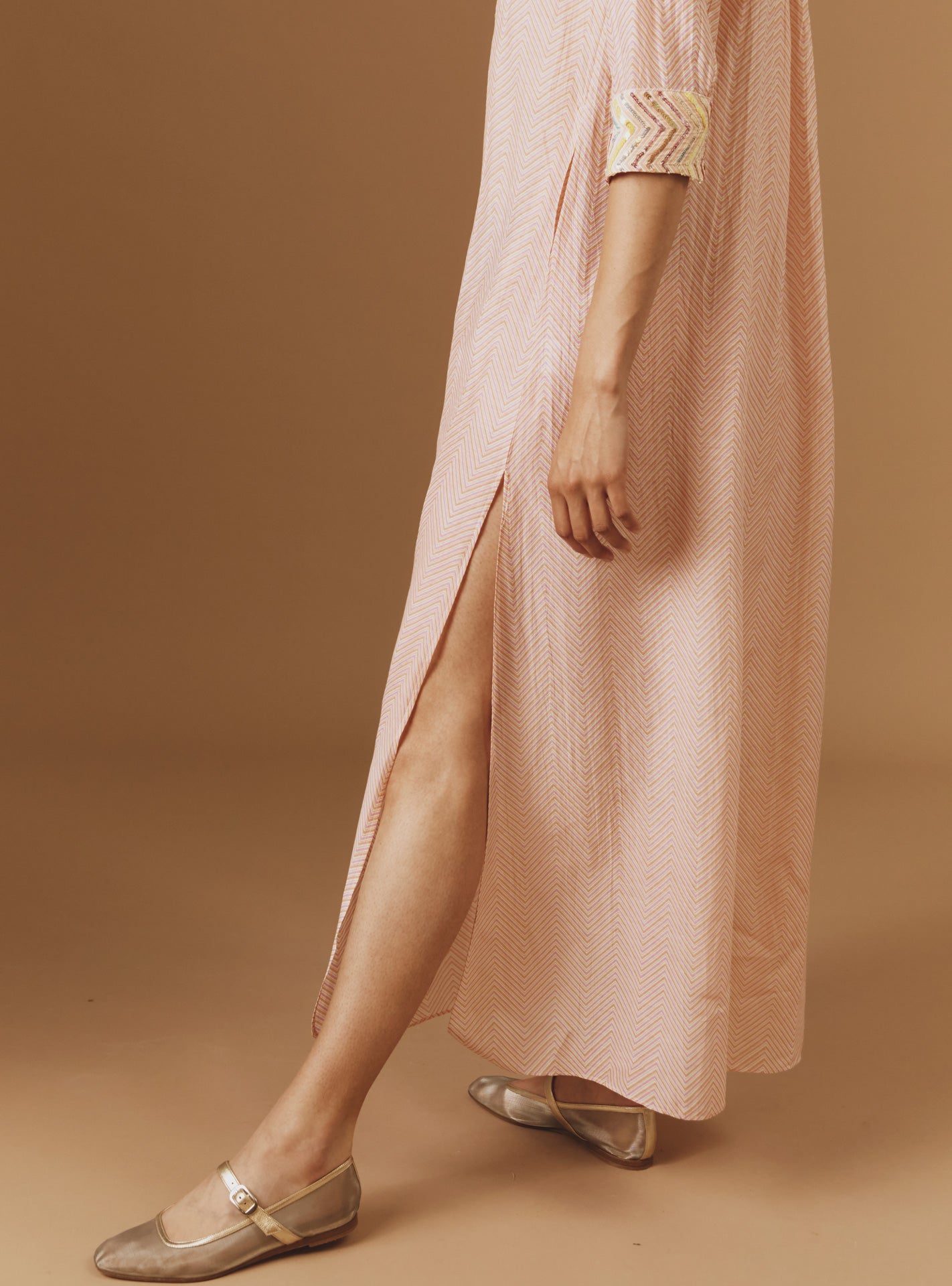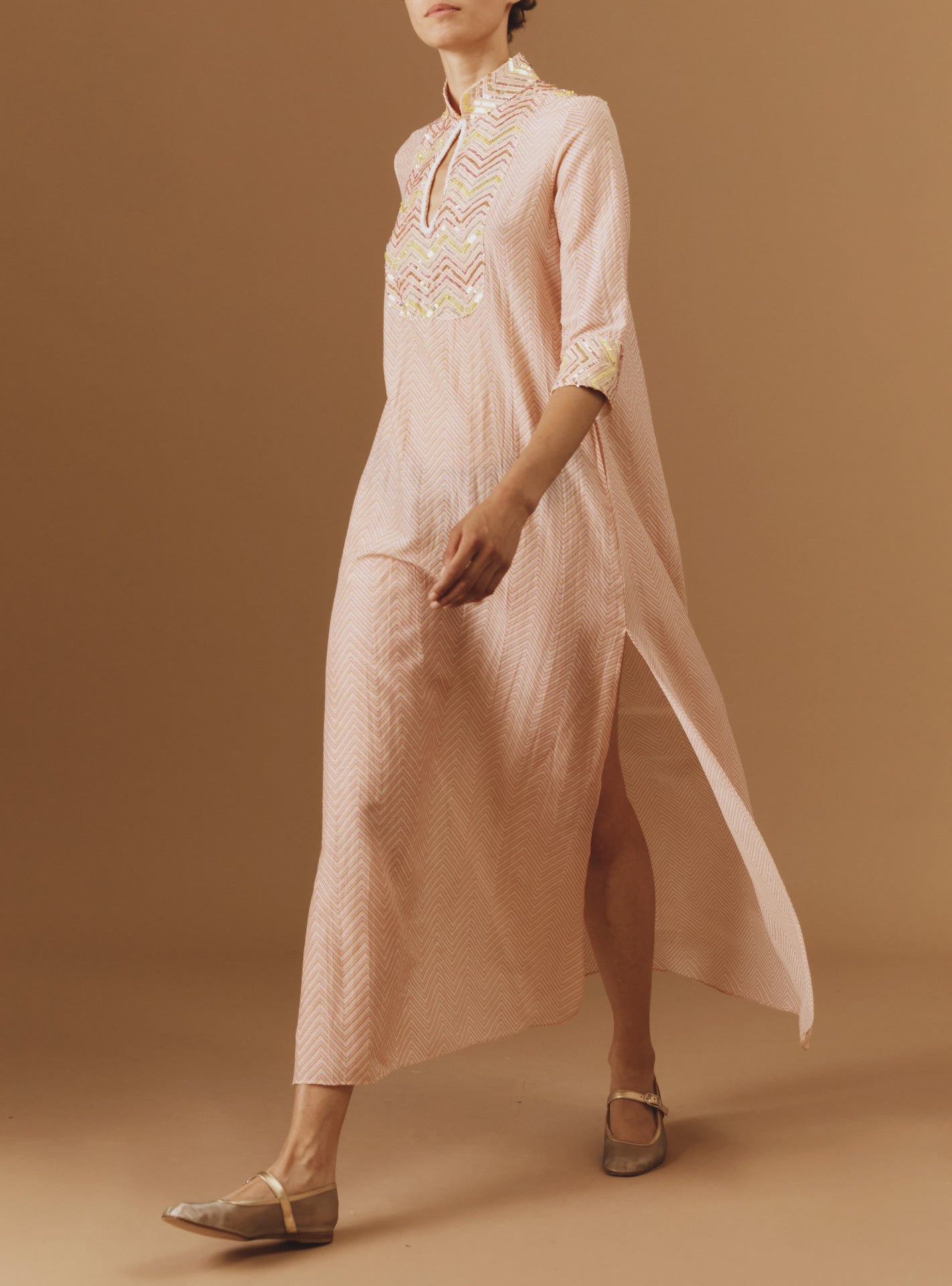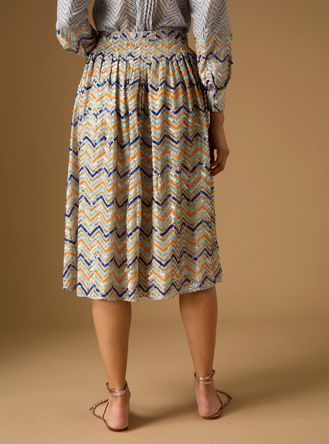 This kind of mens shirt revisited in a new embroidered version for summer 2023: yoke and cuffs are all hand-embroidered with sequins on cotton and silk, with a screen-printed zigzag pattern, evoking the cultures of the Silk Road.