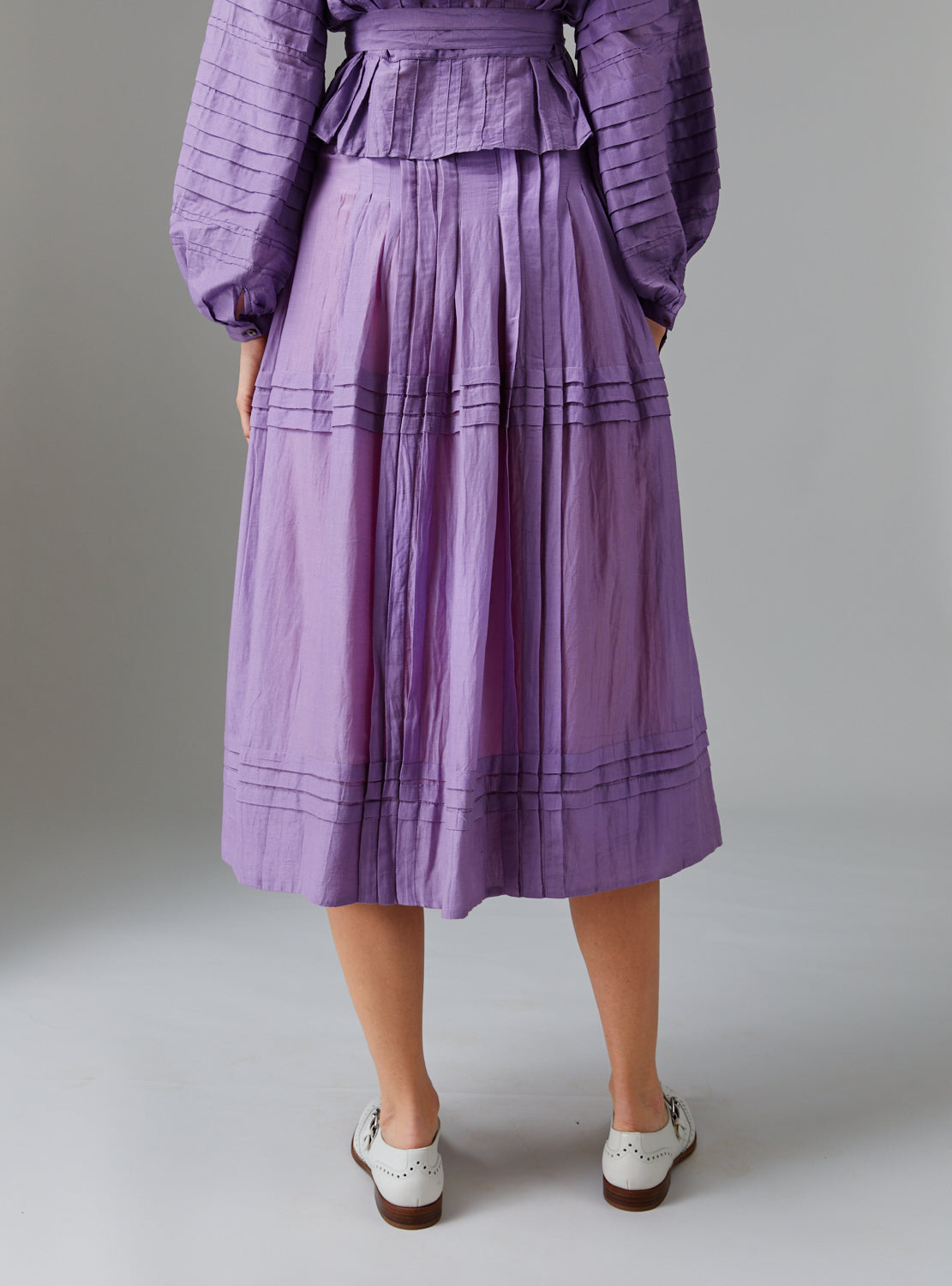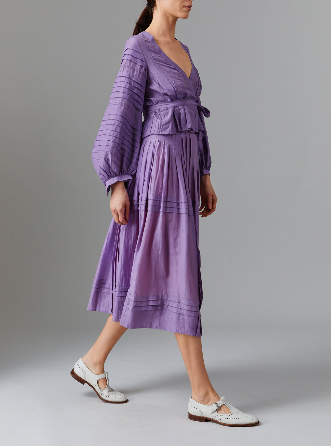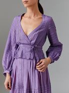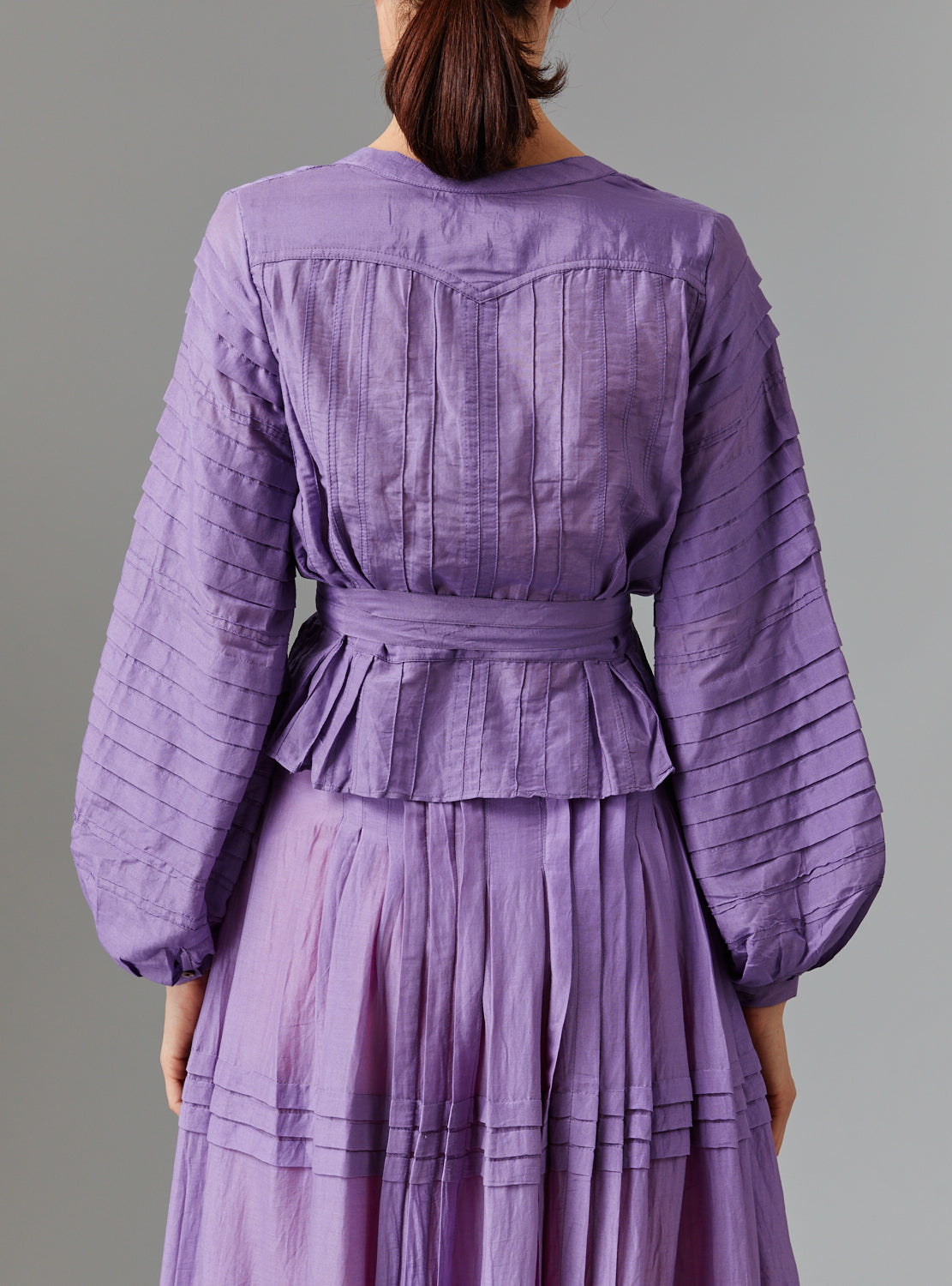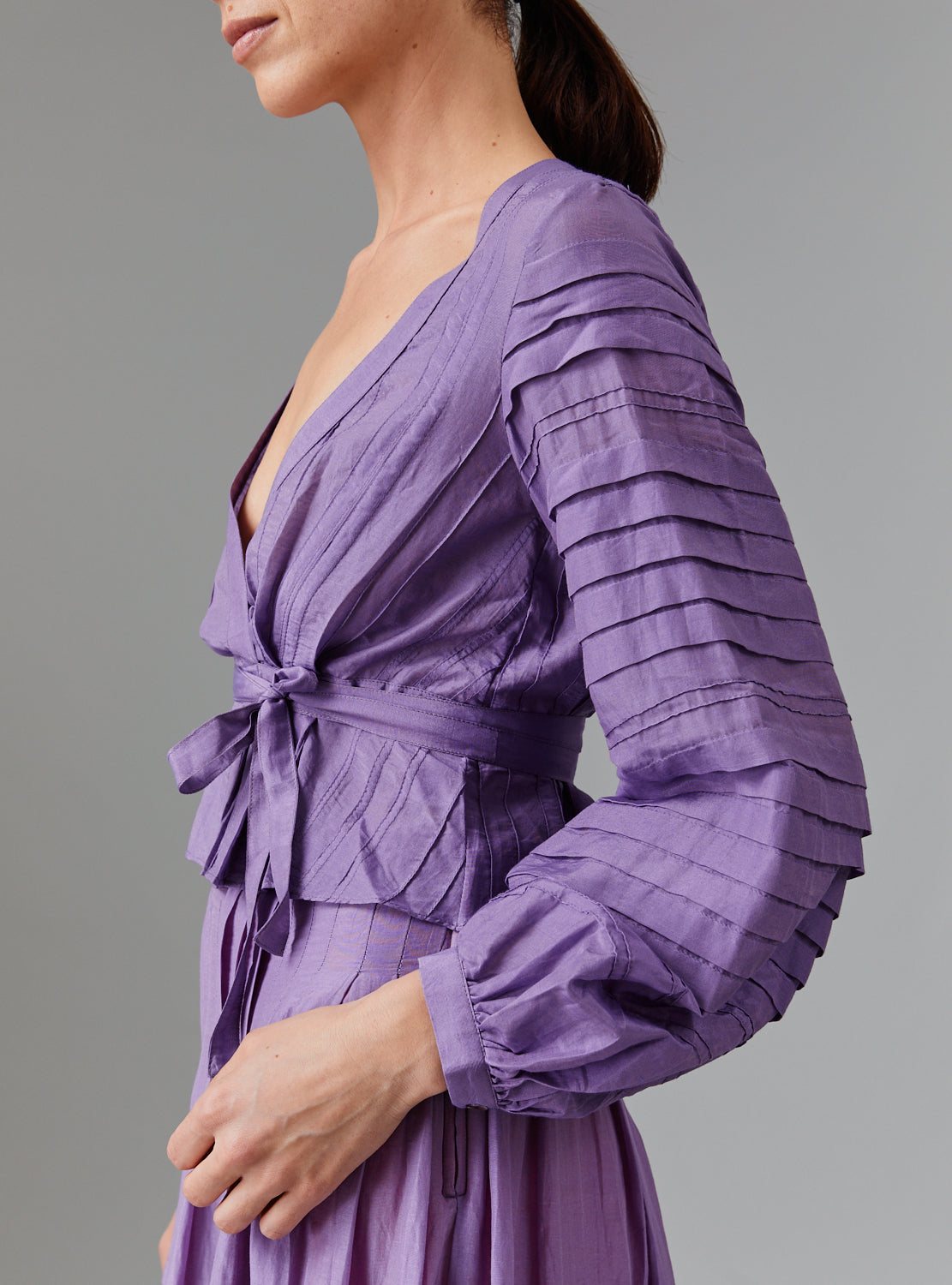 ZORAN wrap-over top is a very romantic masterpiece to wear in or out. Crafted in a soft cotton silk fabric embellished by engineered “religious folds” on its bell sleeves and fine pintucks on its bodice part.