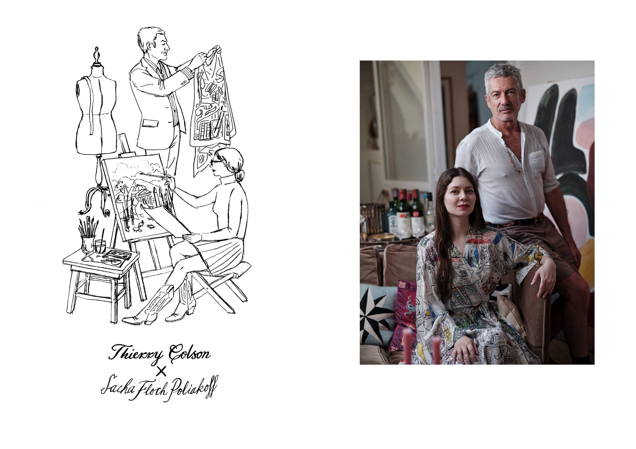 A l’origine de la rencontre entre le créateur de mode Thierry Colson et l’artiste Sacha Floch Poliakoff, une aquarelle. Dans des couleurs pastels savamment ordonnées, Sacha représente un paysage sans âge, où se côtoient un temple antique, un obélisque et une statue de femme, au milieu des cyprès et des pins parasols. Cette création interpelle Thierry Colson, qui perçoit immédiatement une résonance entre ses inspirations et celles de Sacha. C’est le point de départ d’une histoire d’amitié, qui consacre la rencontre entre l’élégance intemporelle de la rive gauche et la sophistication délicate de la rive droite.