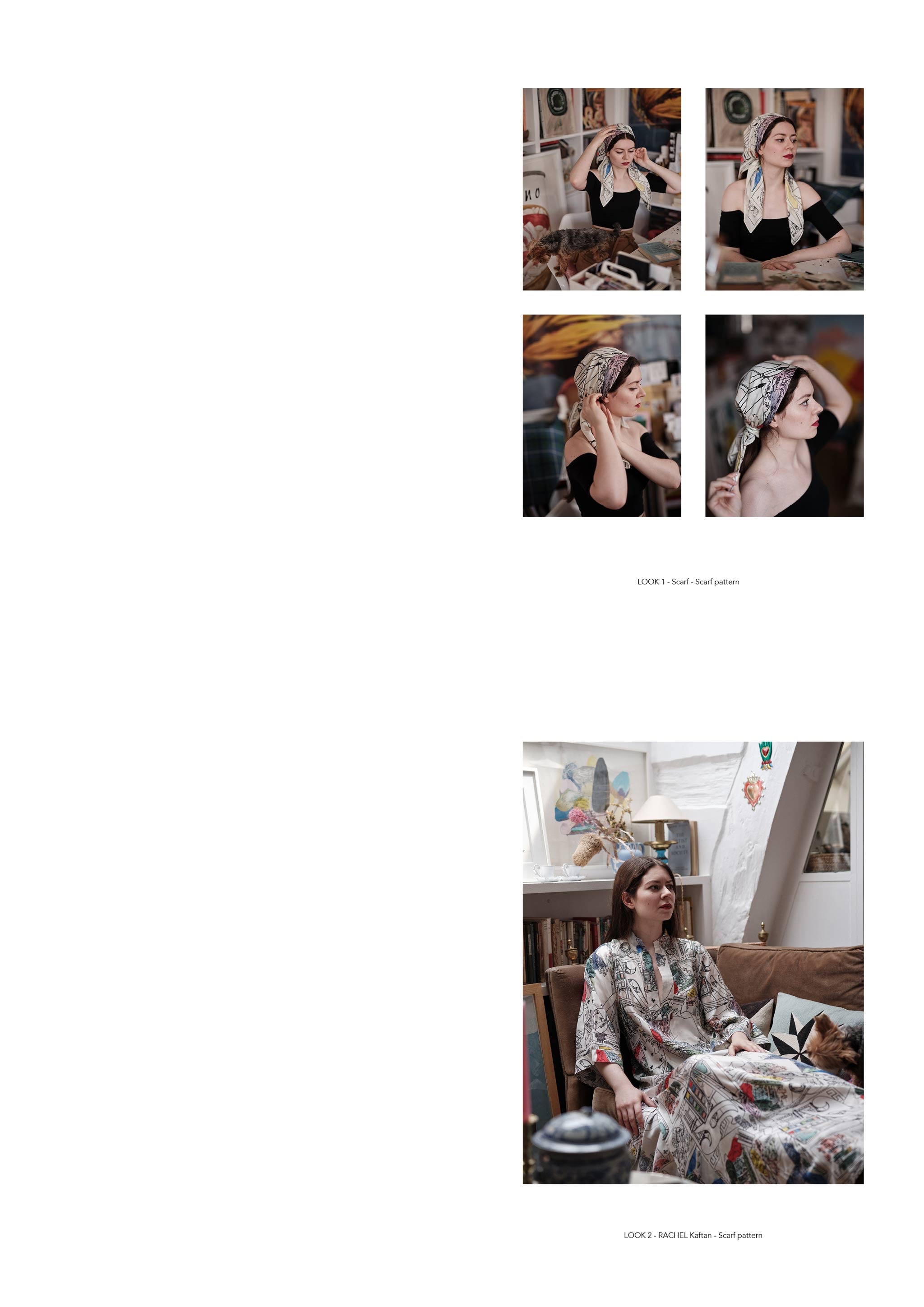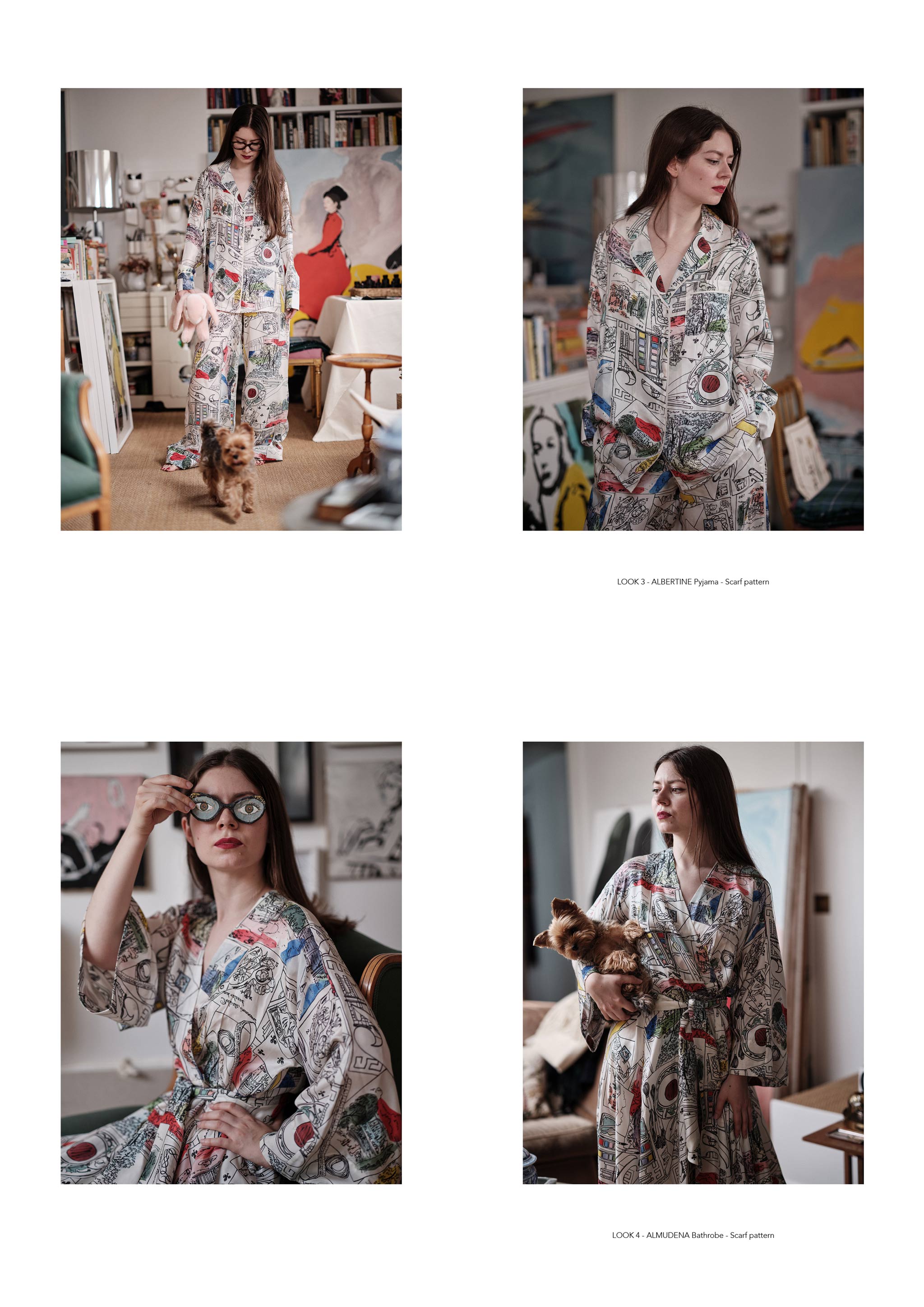 On a silk scarf, using a skilful juxtaposition of objects, colours and patterns, a palette rubs shoulders with a pair of scissors, a porcelain saucer rests delicately on a playing card. On the pink and white toile de Jouy, also known as Indian canvas, a multitude of dreamy landscapes are pictured, reminiscent not only of Scotland, but also Denmark, Greece and Italy.