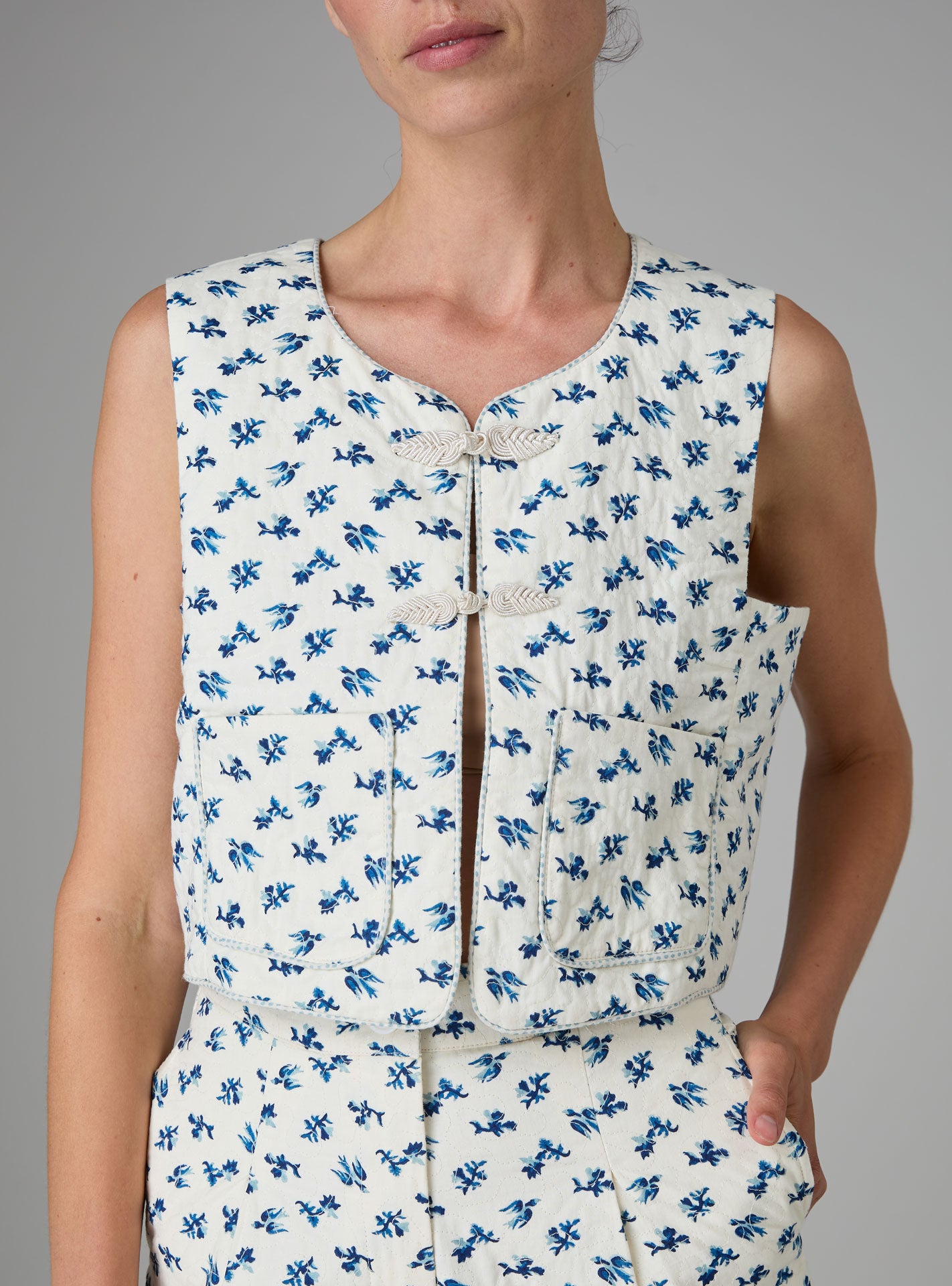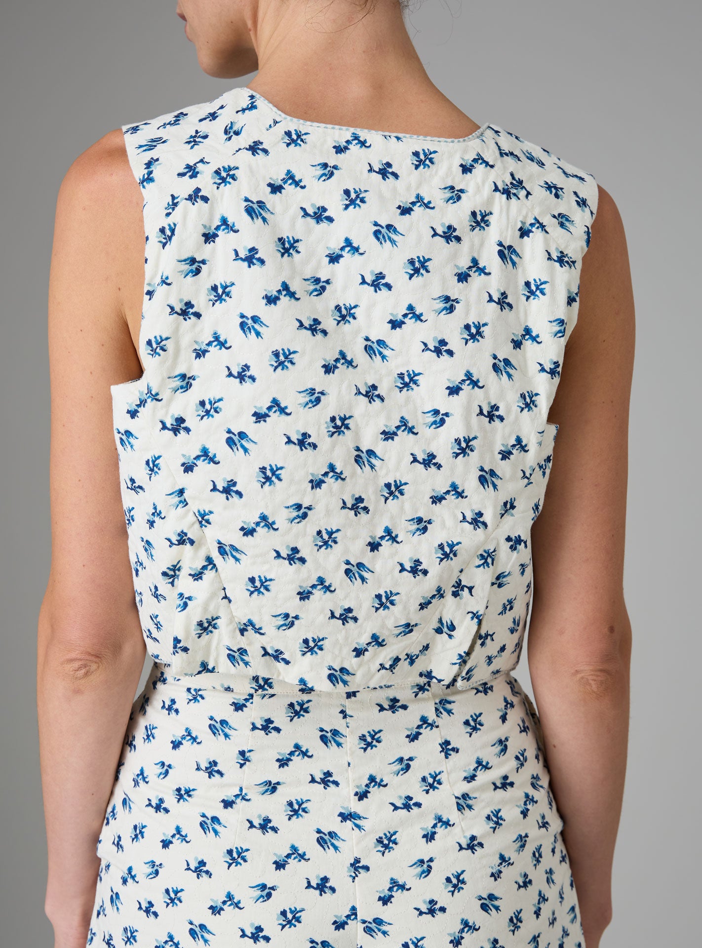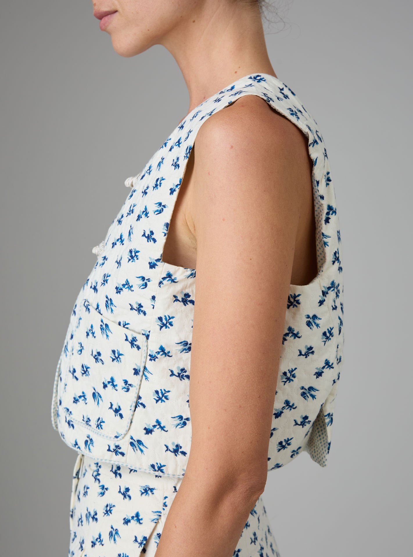 The charming cropped vest Bianca plays beautifully with two scales of stripes: larger at the front and thinner at the back, embellished with “bias” piping on the shoulder seams and around its kimono sleeves.