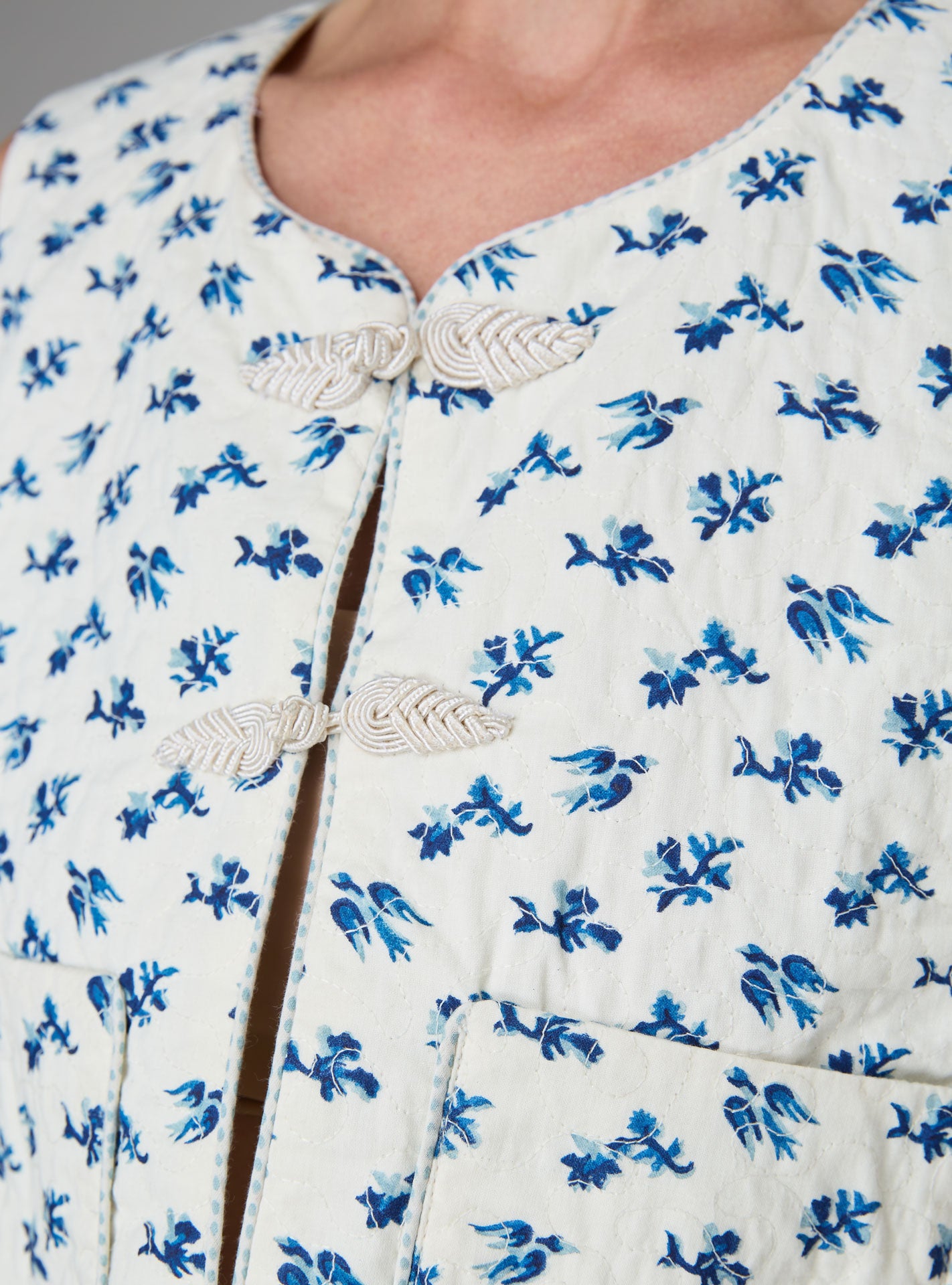 - Kimono sleeves with bias piping detail.