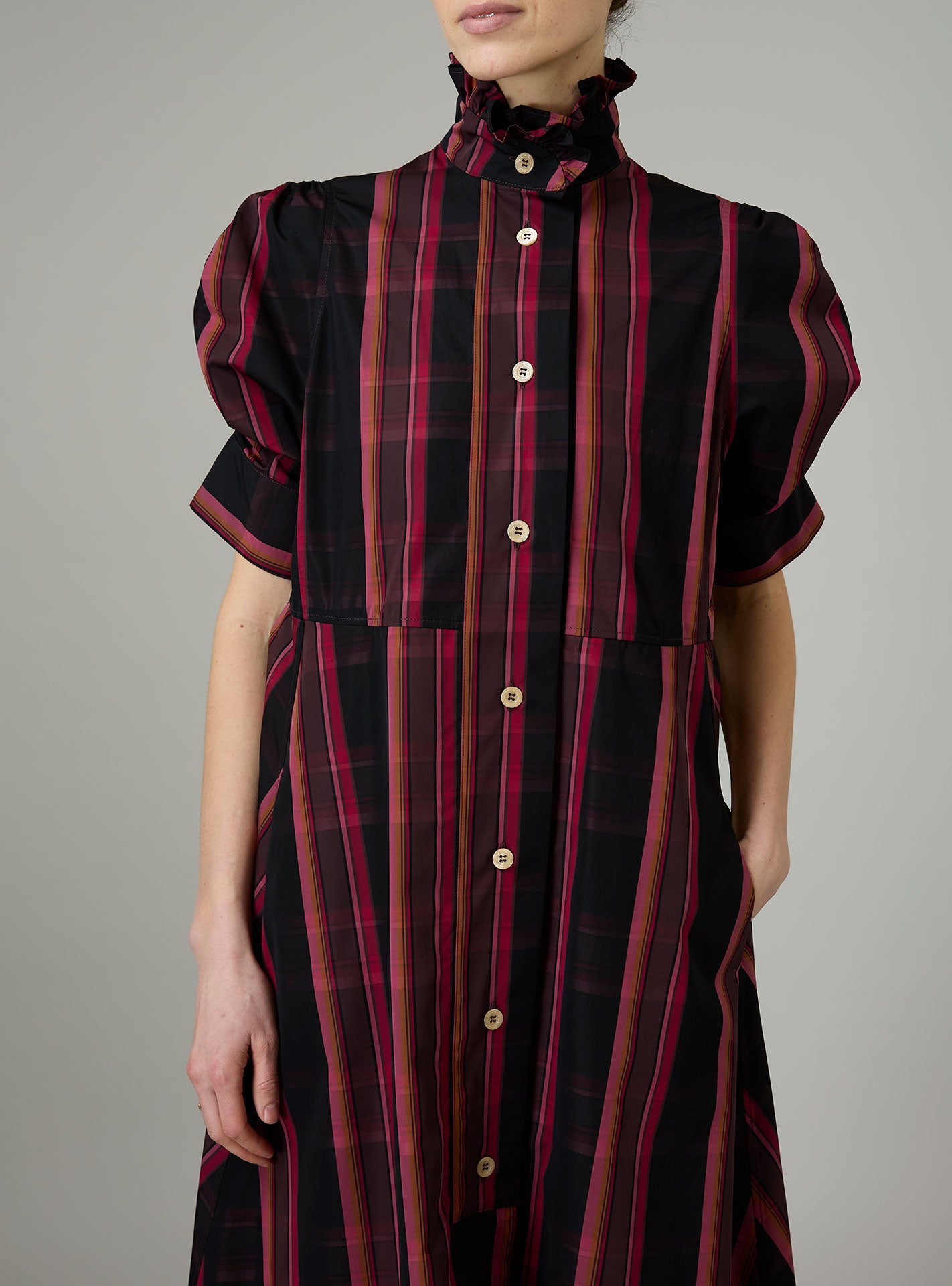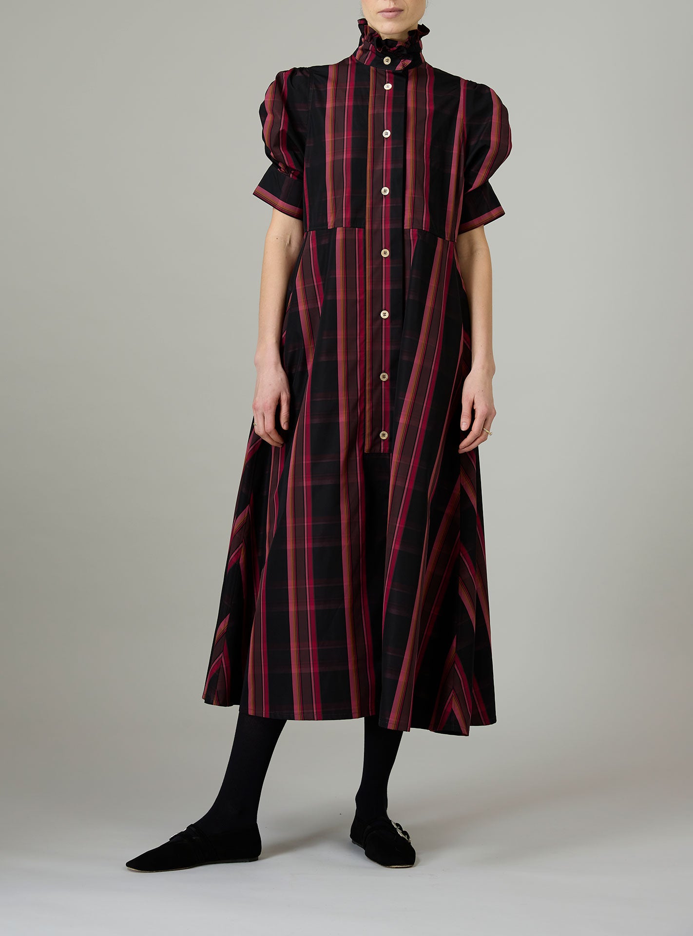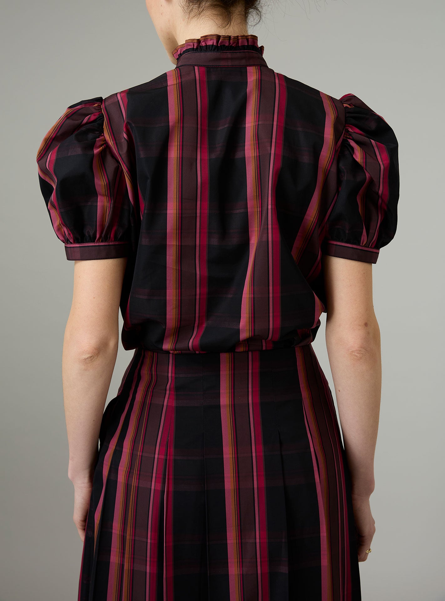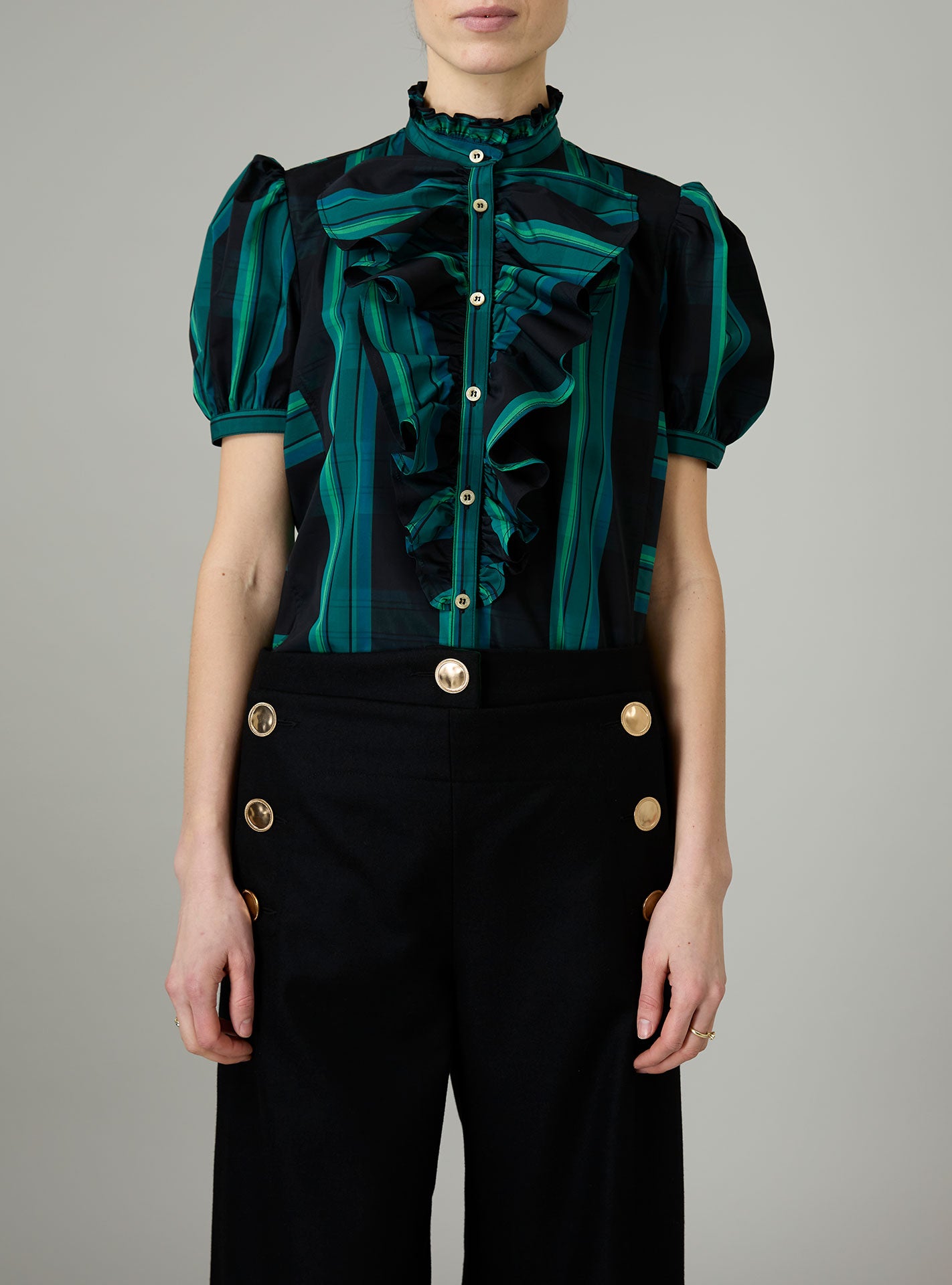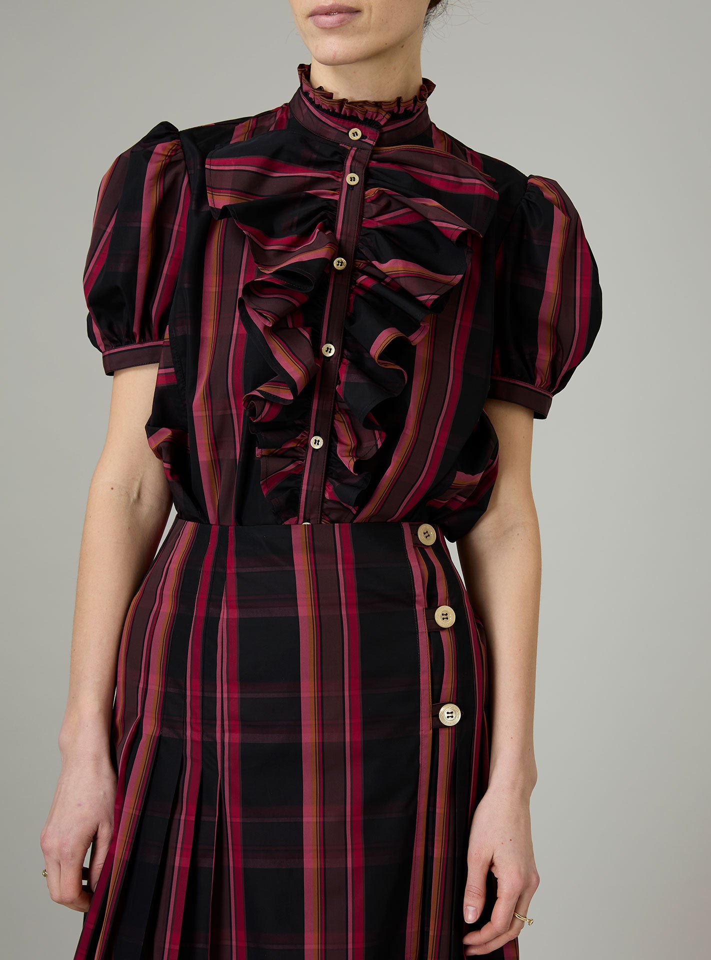 With its charming, puffed sleeves and its ruffled jabot, the Bibiana blouse is crafted in a pristine crispy tartan poplin.