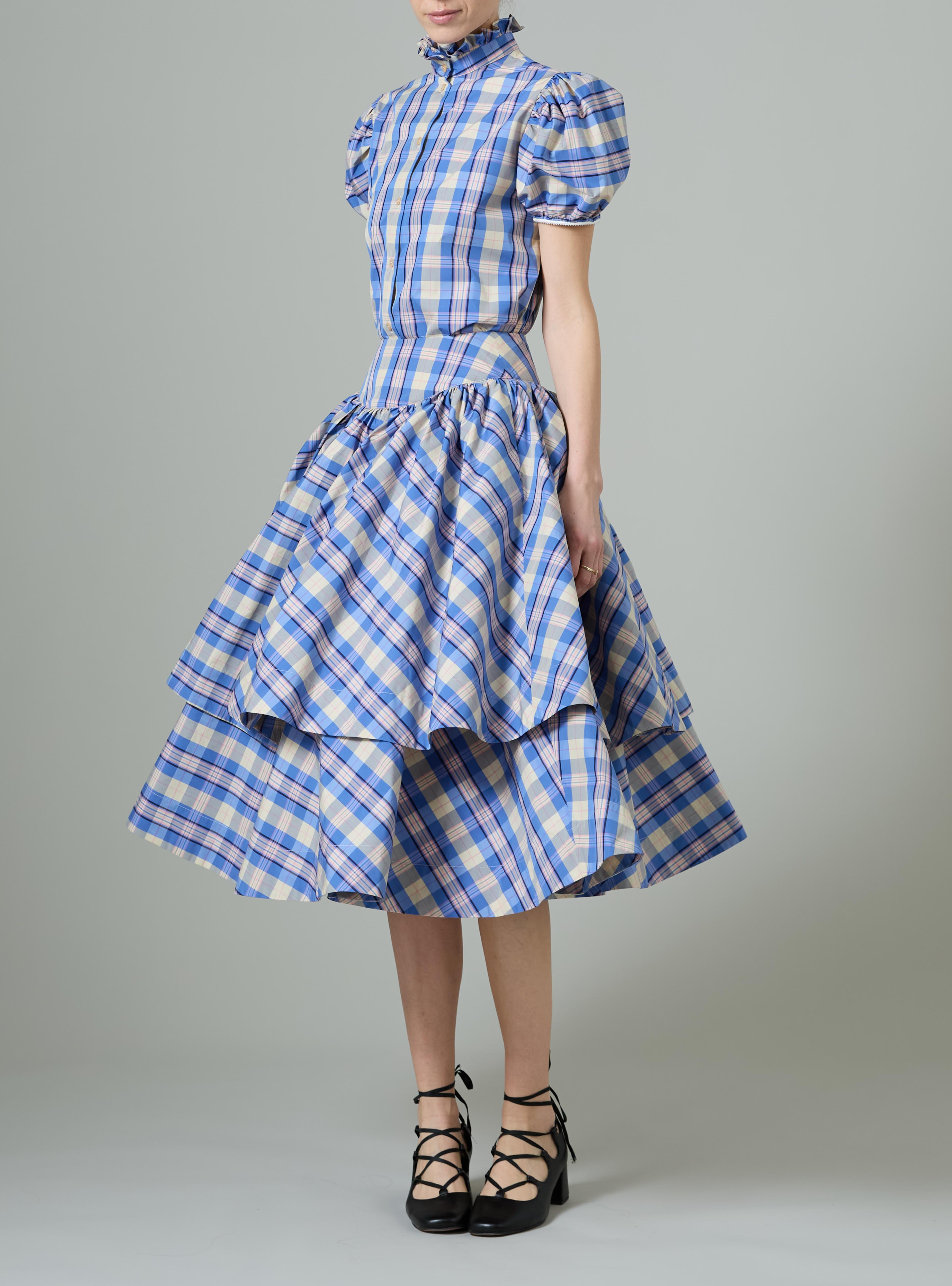 Inspired by the voluminous silhouettes of mid-Victorian crinolines, the Constance petticoat skirt commands attention with its architectural presence. Rendered in a crisp check pattern poplin, this new Spring 2026 piece elevates formal occasions—from garden gatherings to sophisticated celebrations. The structured volume creates an elegant statement, while the refined textile ensures comfort and movement. Pair with our nice VIKE shirt !