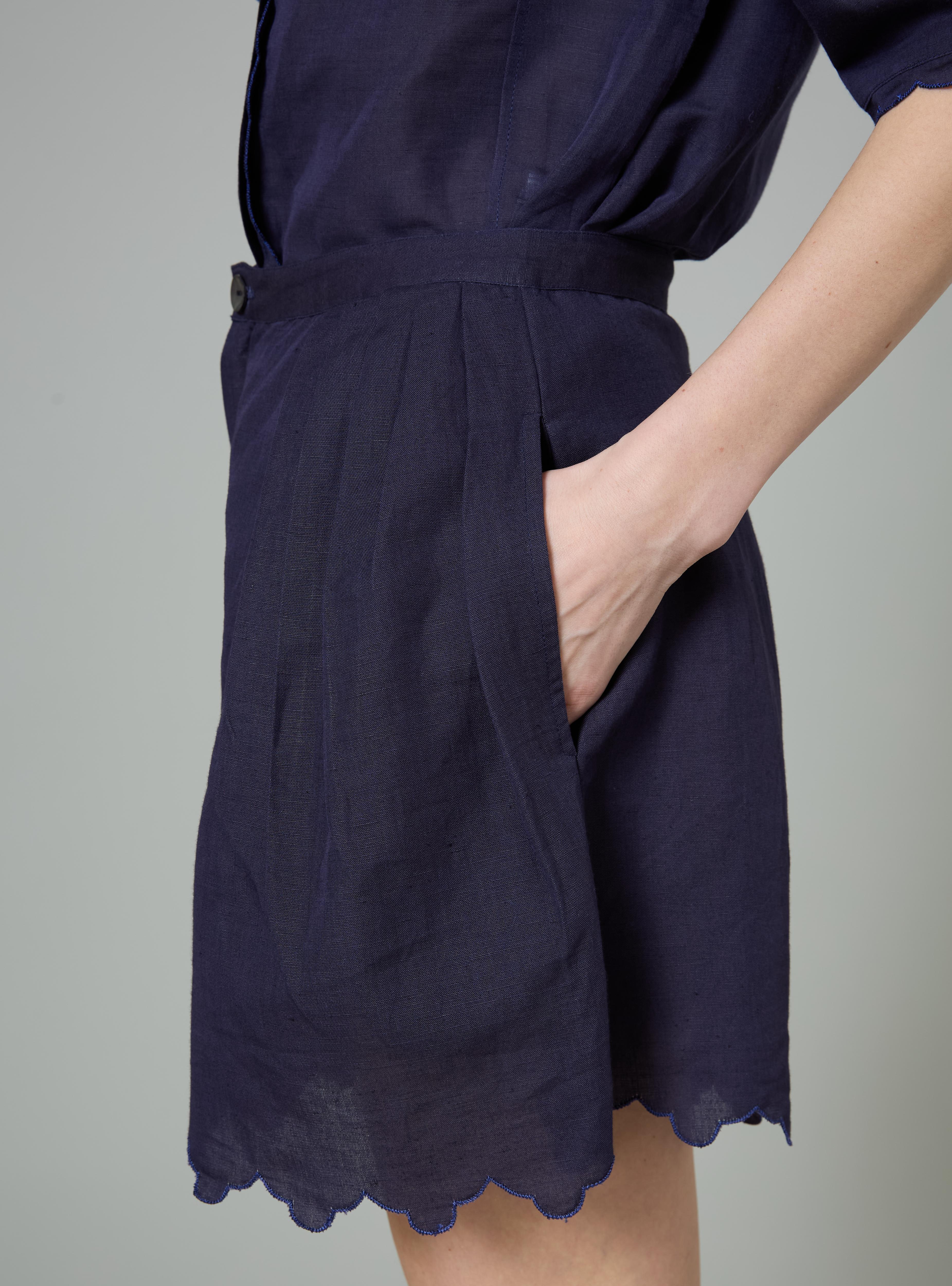This reimagined piece from our African collection features a distinctive silhouette crafted through precision front darts that create an elegant balloon effect while preserving a refined aesthetic. Rendered in a breathable cotton-linen blend with the tactile quality of vintage linens, the shorts showcase a striking cobalt blue trim that punctuates the navy base with sophisticated contrast. The carefully engineered volume and proportions deliver both visual interest and practical comfort.