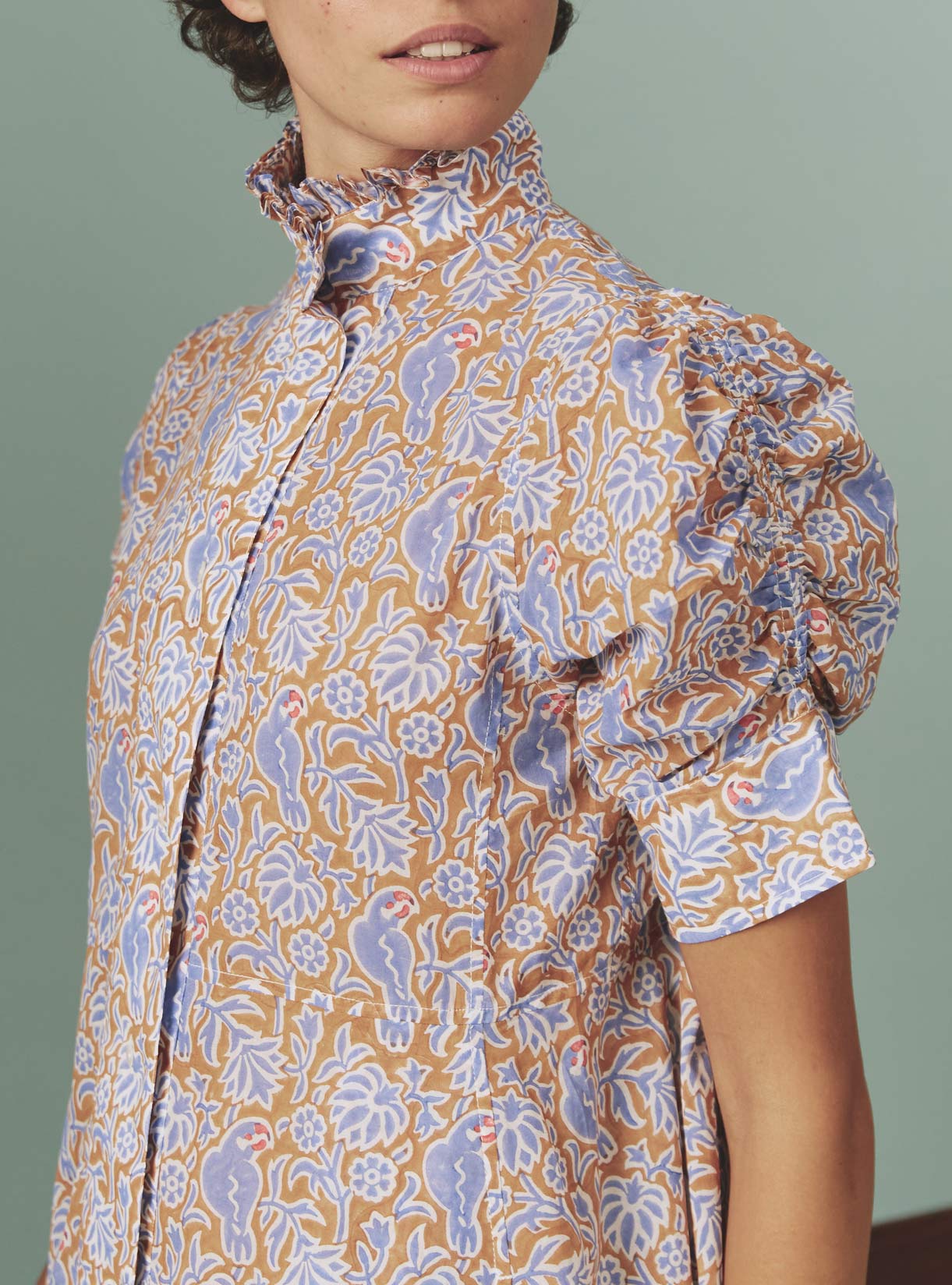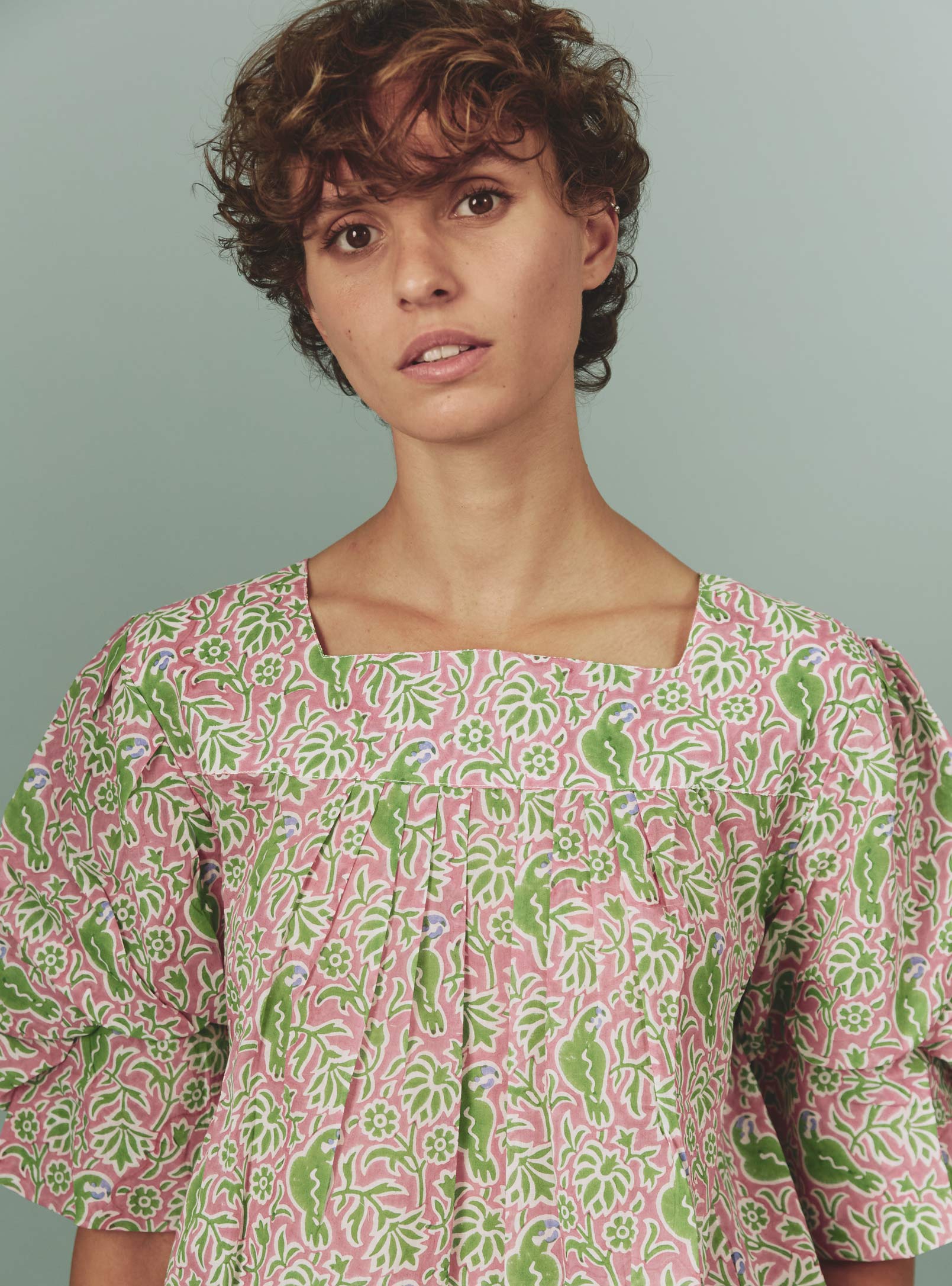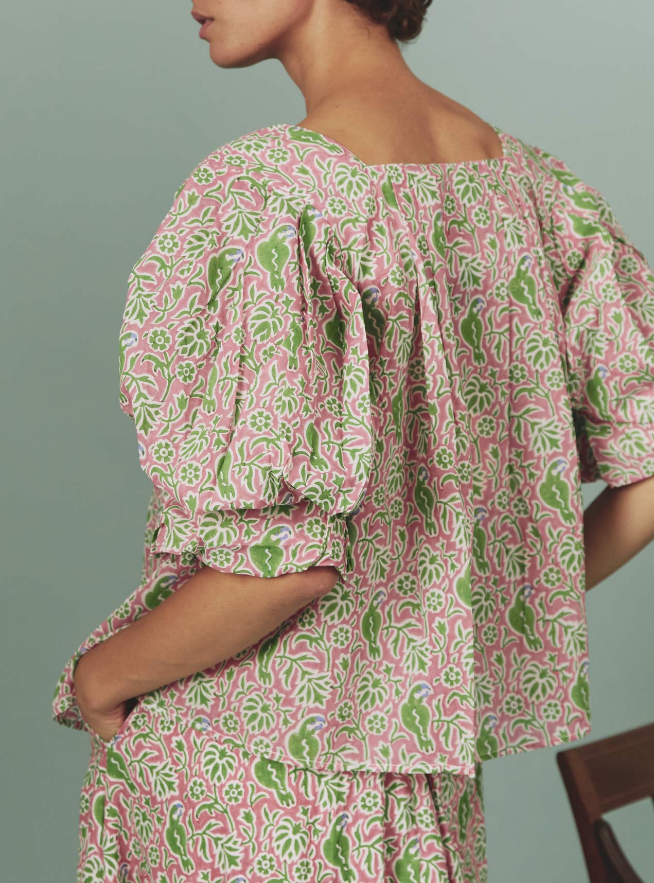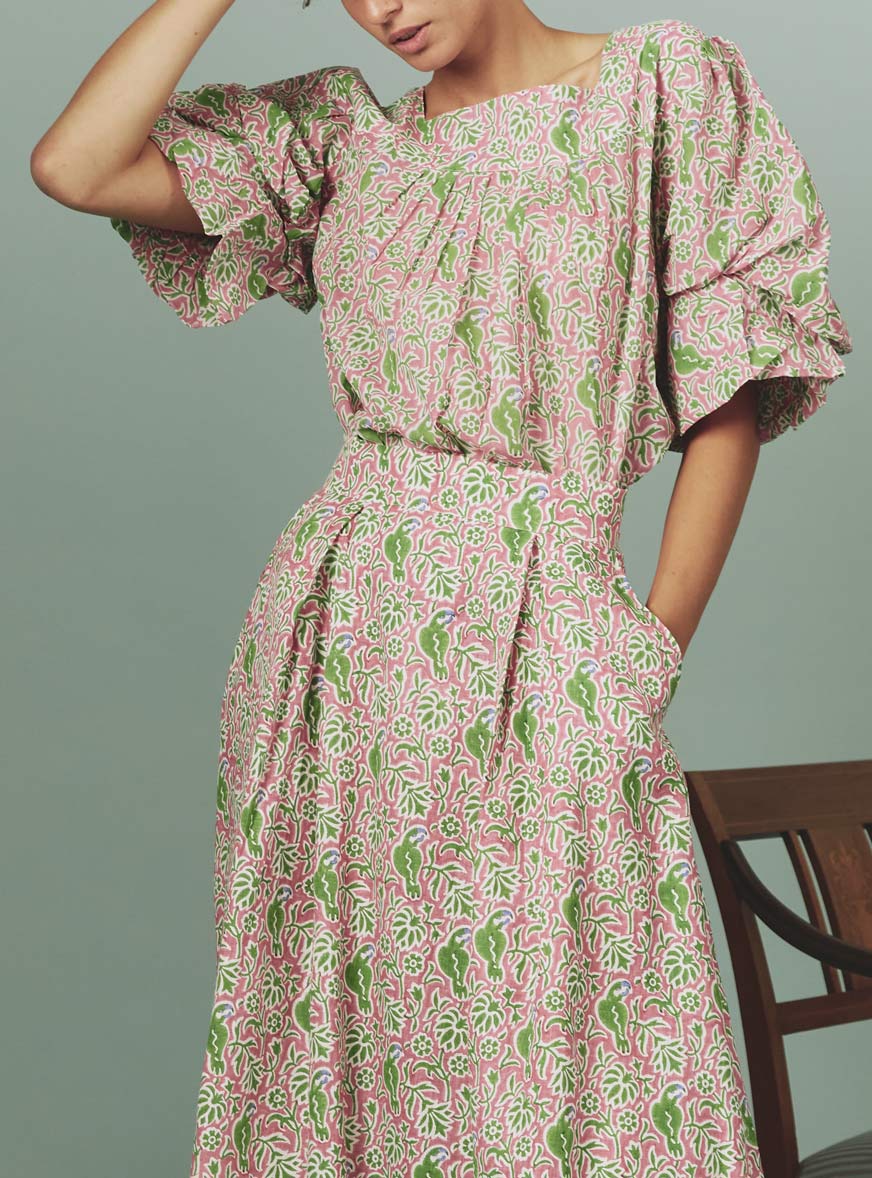 Crafted in a soft cotton voile hand-block printed parrot pattern for summer 2024 with a wink to Matisse paintings.