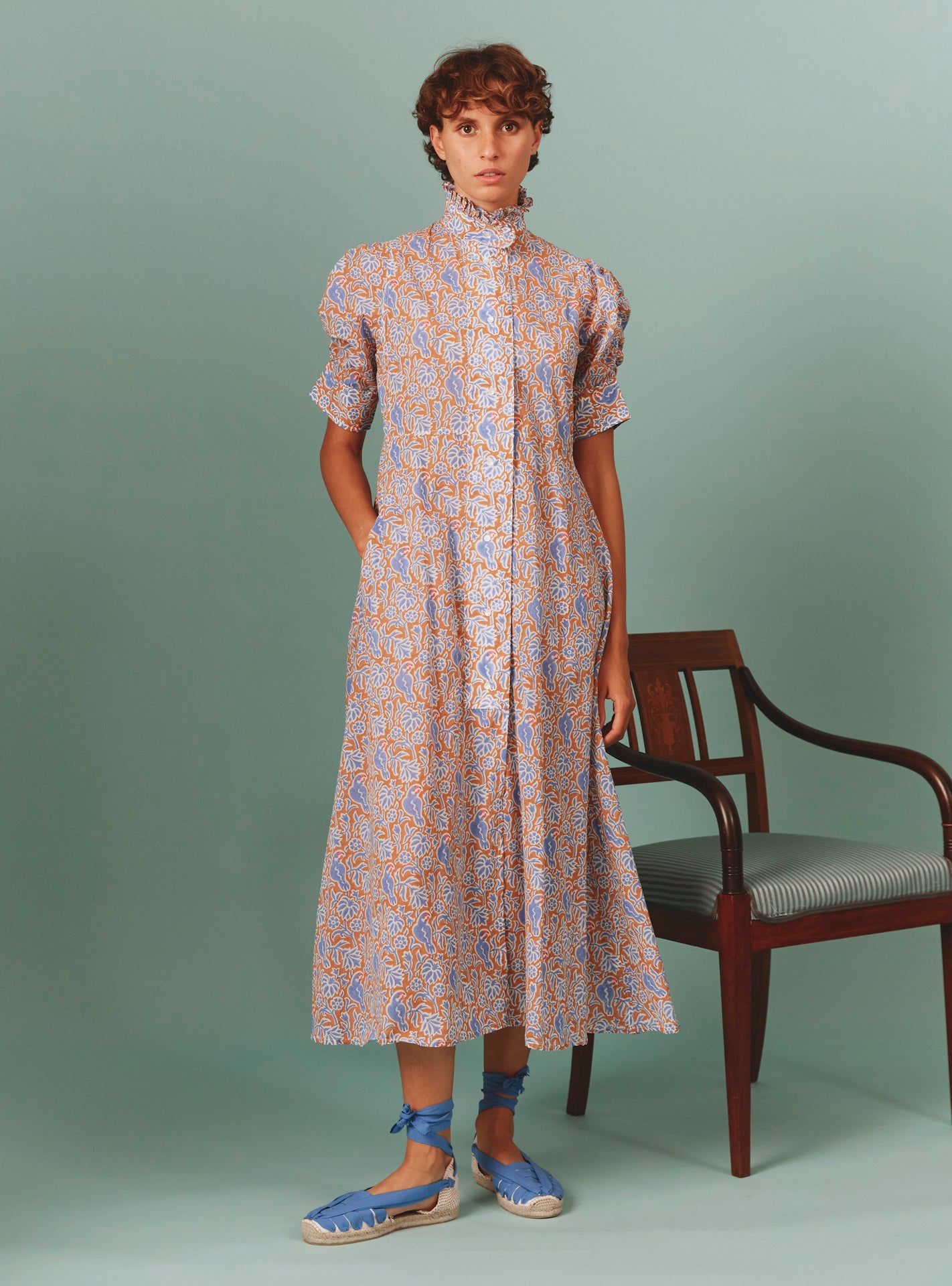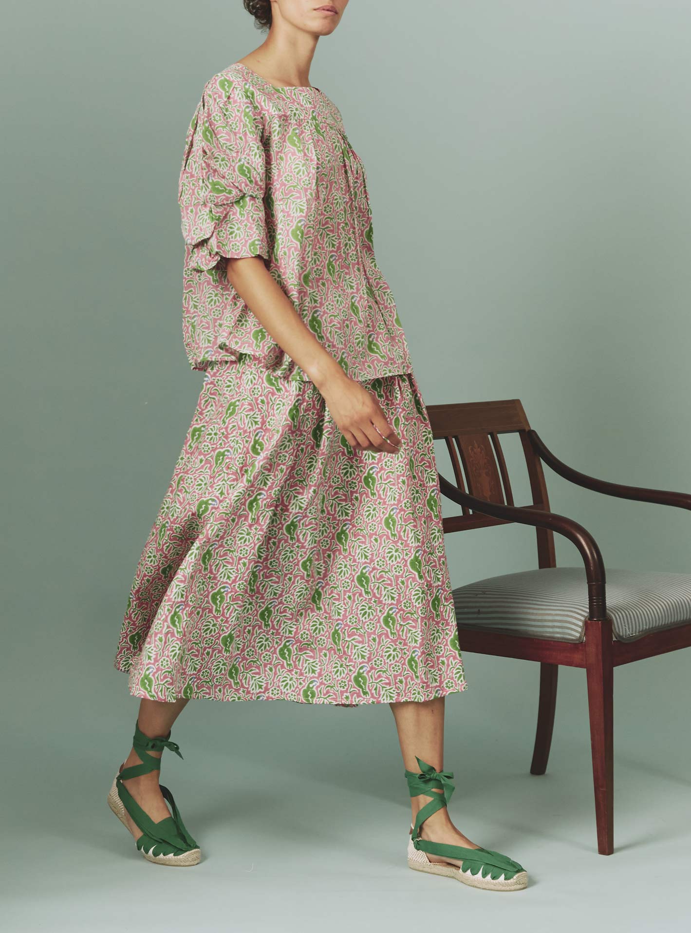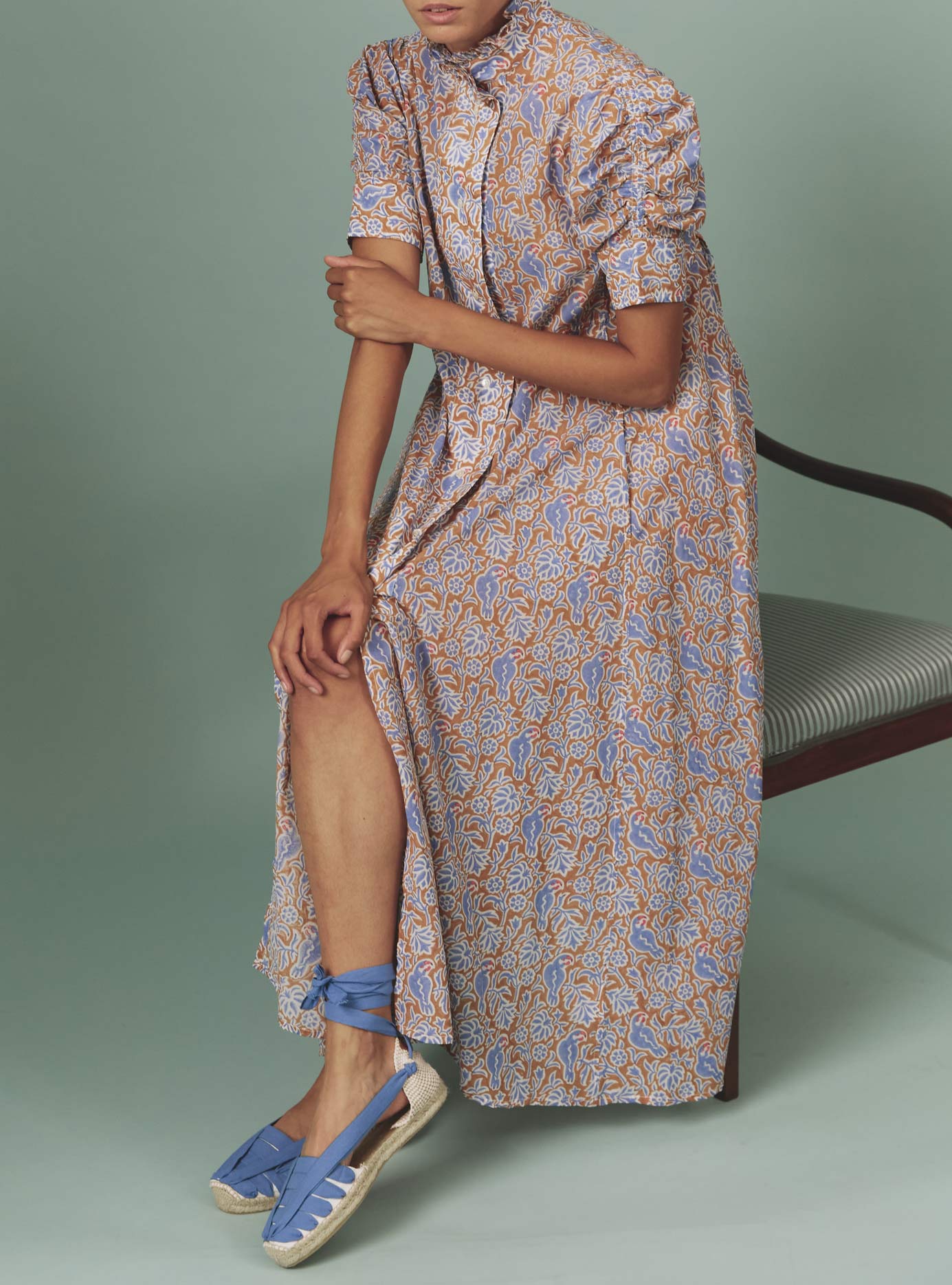 Crafted in a soft cotton voile hand-block printed parrot pattern for summer 2024 with a wink to Matisse paintings.