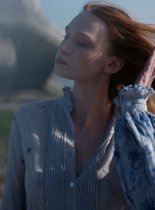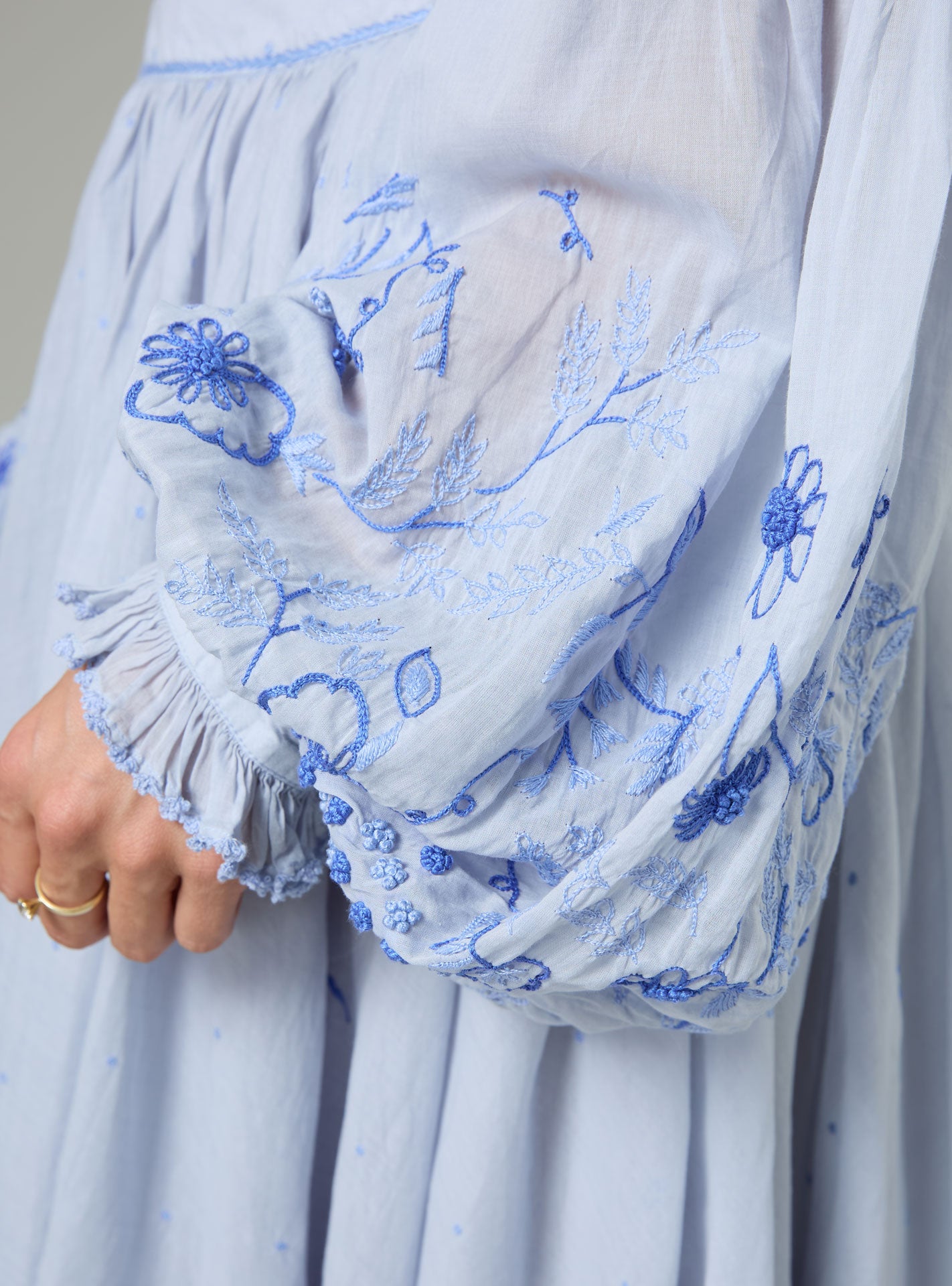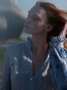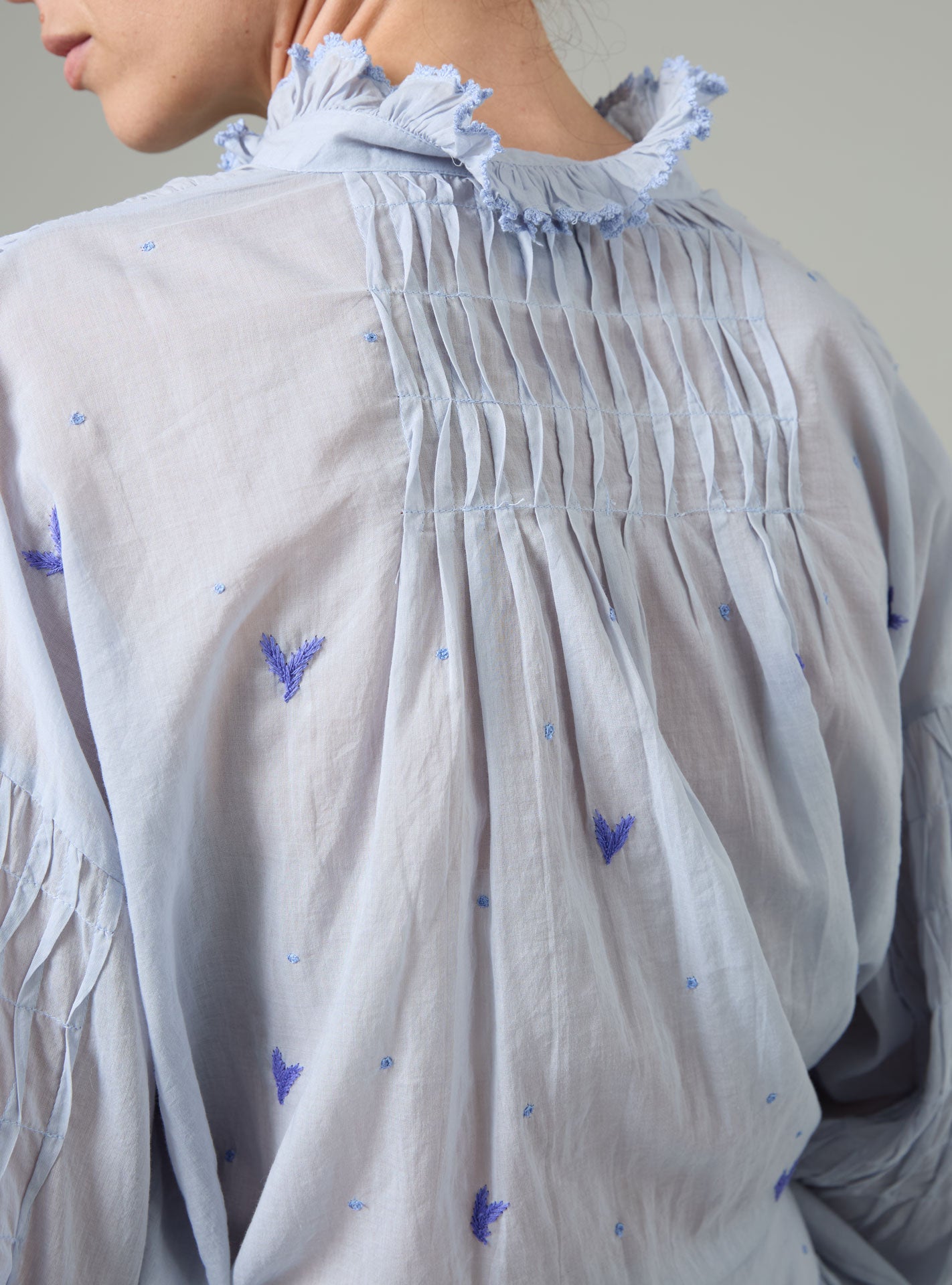 Inspired by Eastern European folk traditions and Victorian romanticism, the SLAVA blouse reimagines classic silhouettes with contemporary refinement. Distinctive bell sleeves frame delicate gentleman smoking pleats at the front, while intricate crochet-trimmed ruffles grace the cuffs. The embroidery narrative unfolds across the garment—concentrated florals and feathered motifs adorn the sleeve hems, while scattered French dots punctuate the body with understated elegance. The cobalt and lavender palette creates a sophisticated chromatic dialogue. This Spring 26 piece transitions effortlessly from the CONSTANCE double-layer skirt for dramatic impact to casual denim for refined everyday wear.