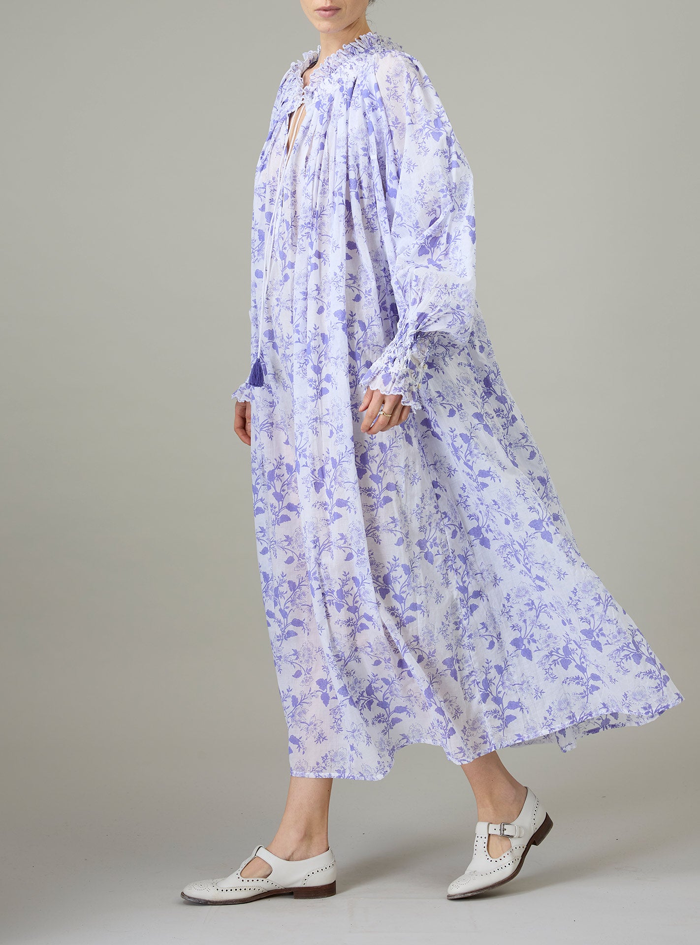 The VLADIA smocked dress is crafted in a soft cotton voile hand block-printed in a white on white chintz pattern.