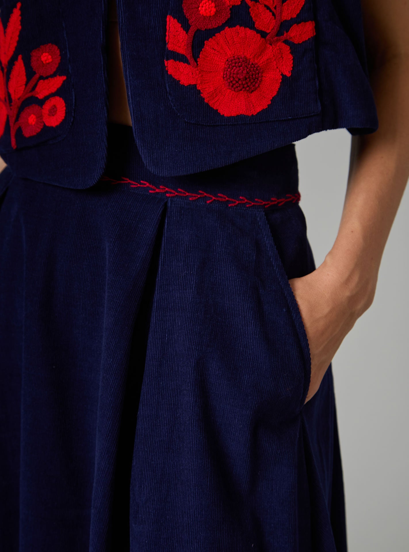 This Fall is crafted in a navy cotton corduroy embroidered with 2 different tones of red wool thread.