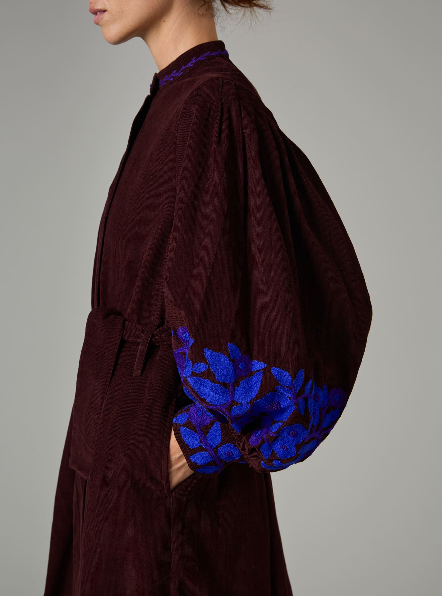 The choice of a warm chocolate, twisted with the cobalt and purple embroidery, appears visually like a floating mirage.