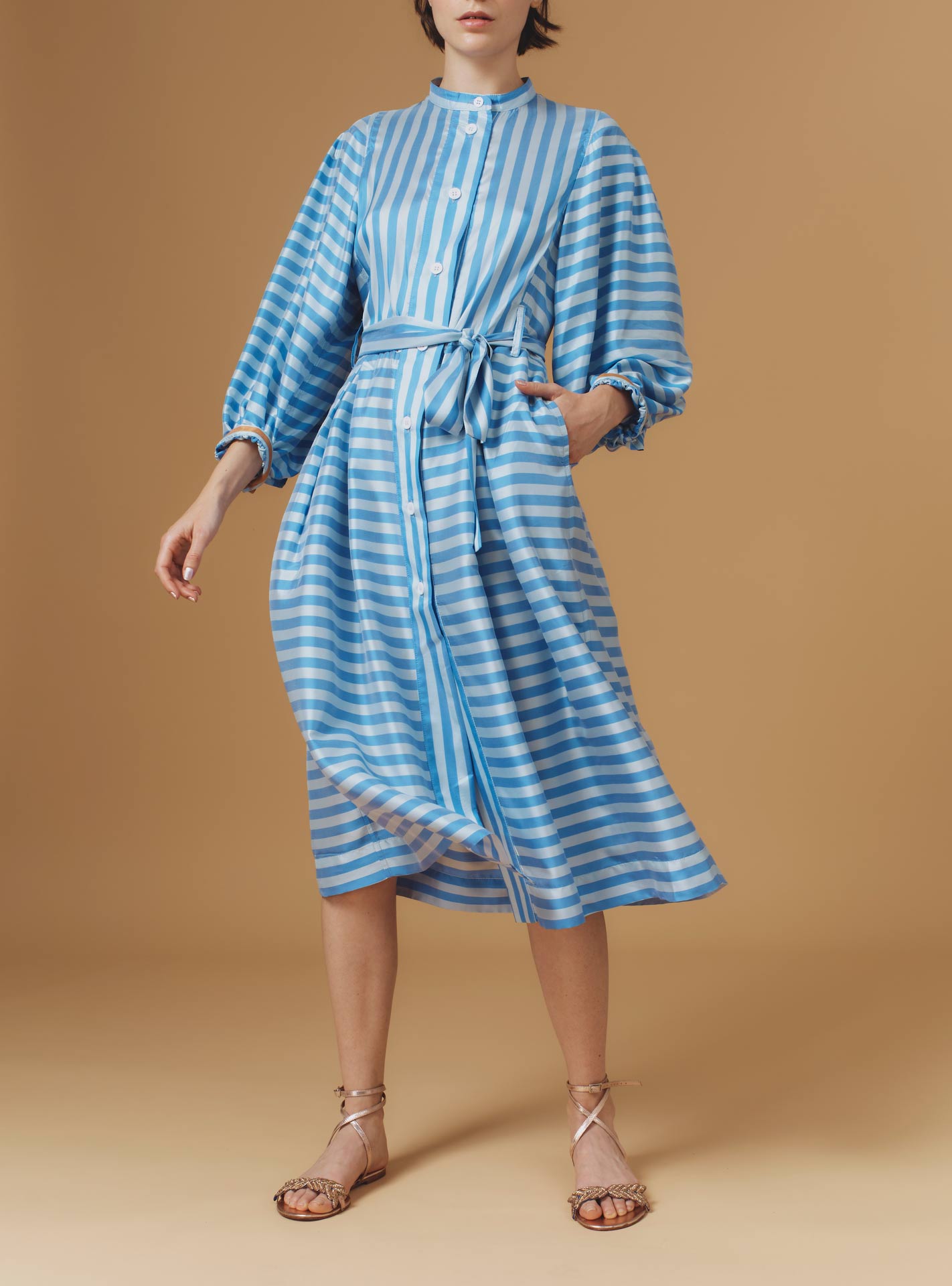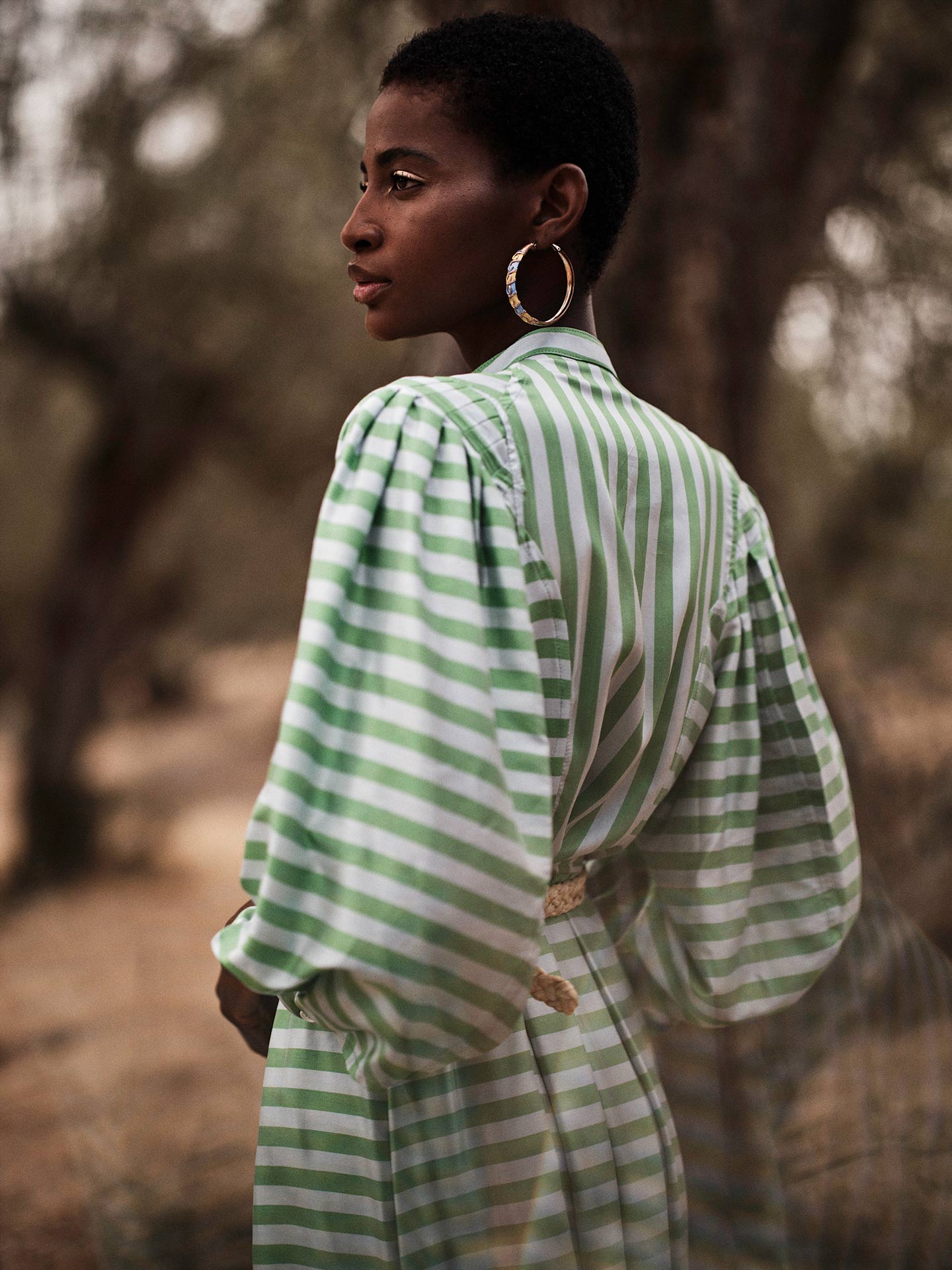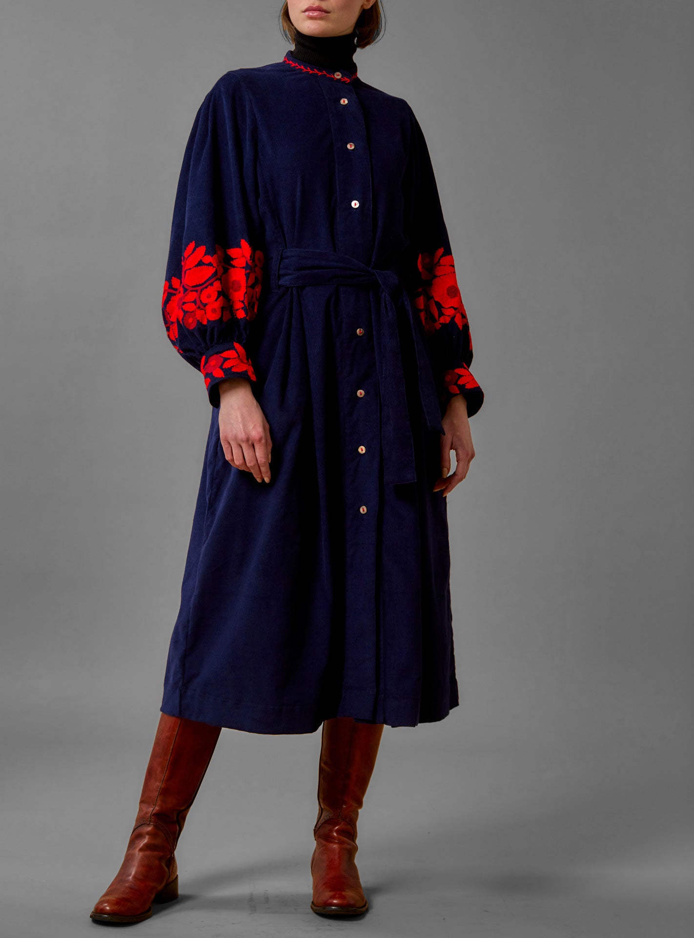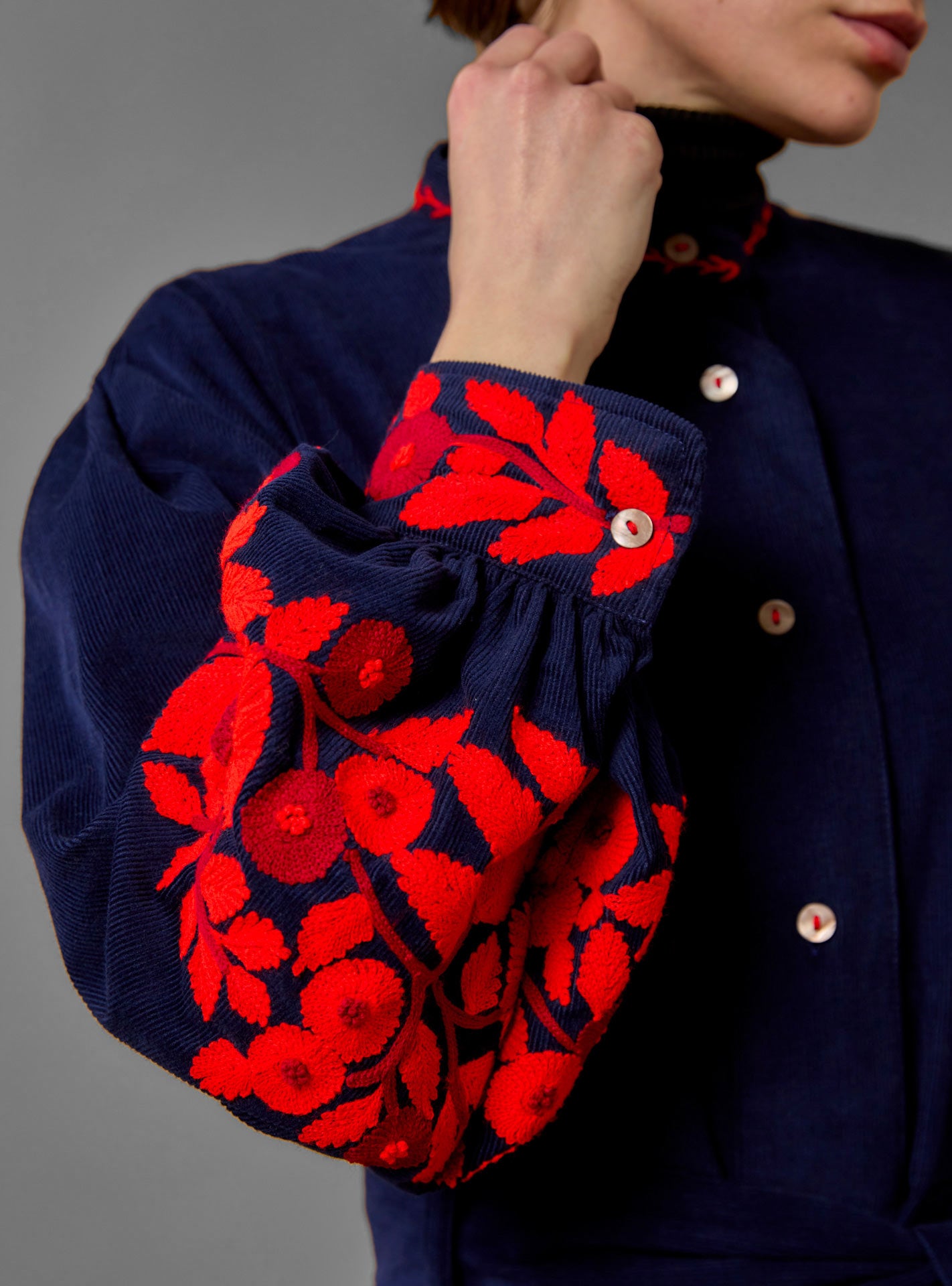 The Yvonne midi coat-dress, seeming so classic at first glance, is twisted with its dramatic sleeves inspired by the Stuart period: this is what makes it unique.