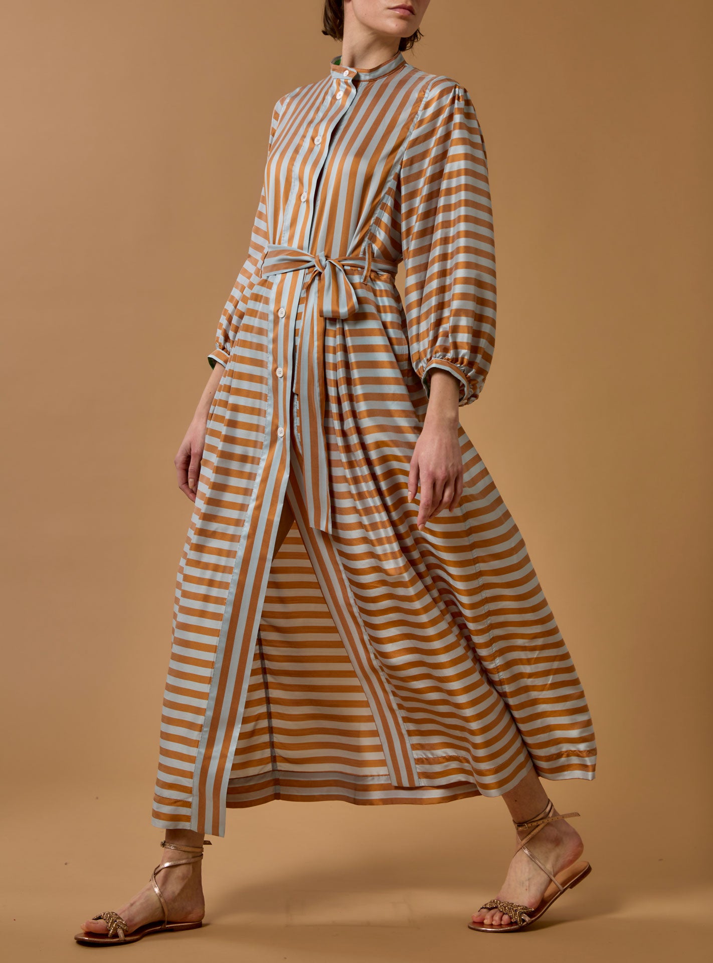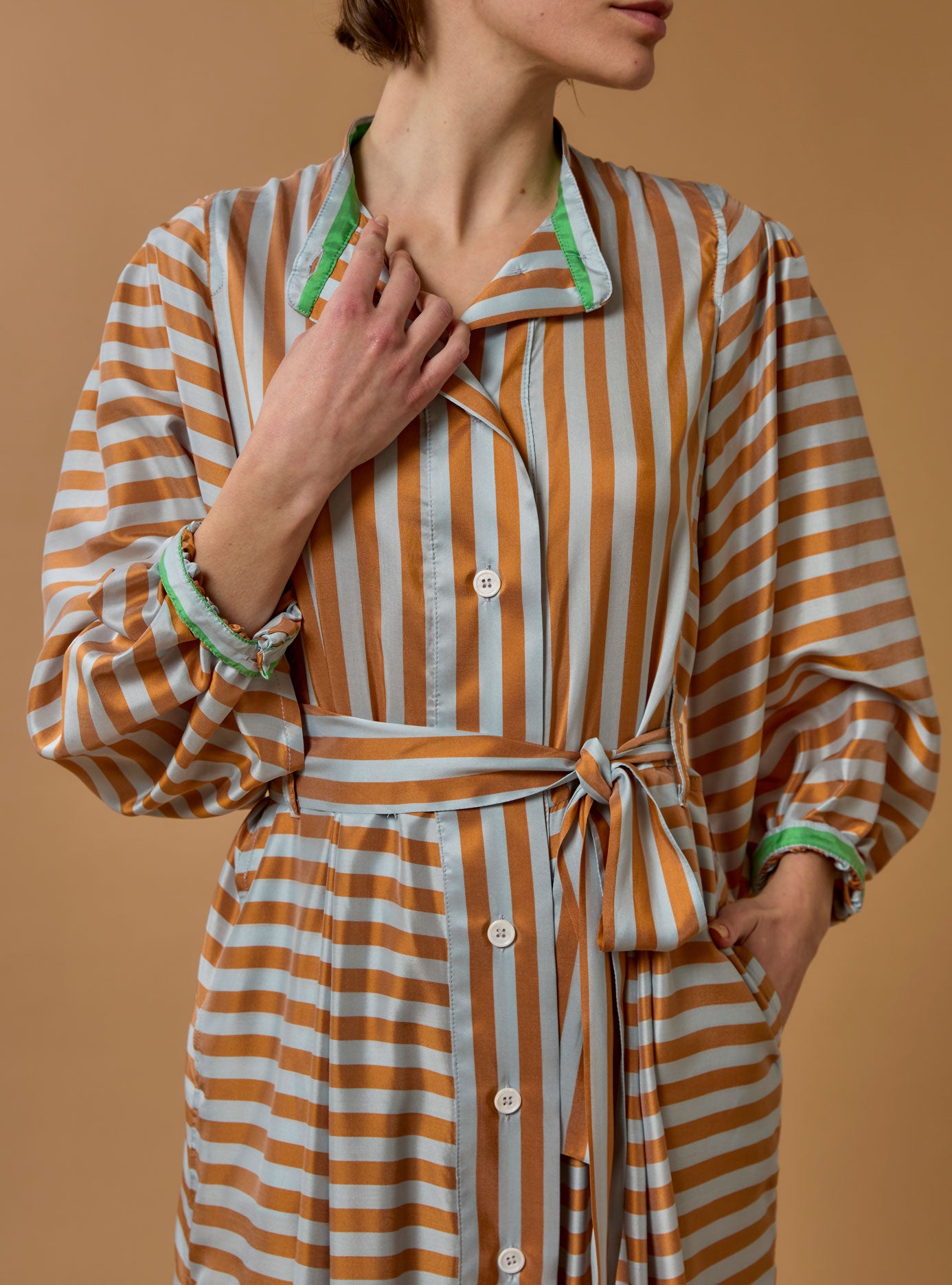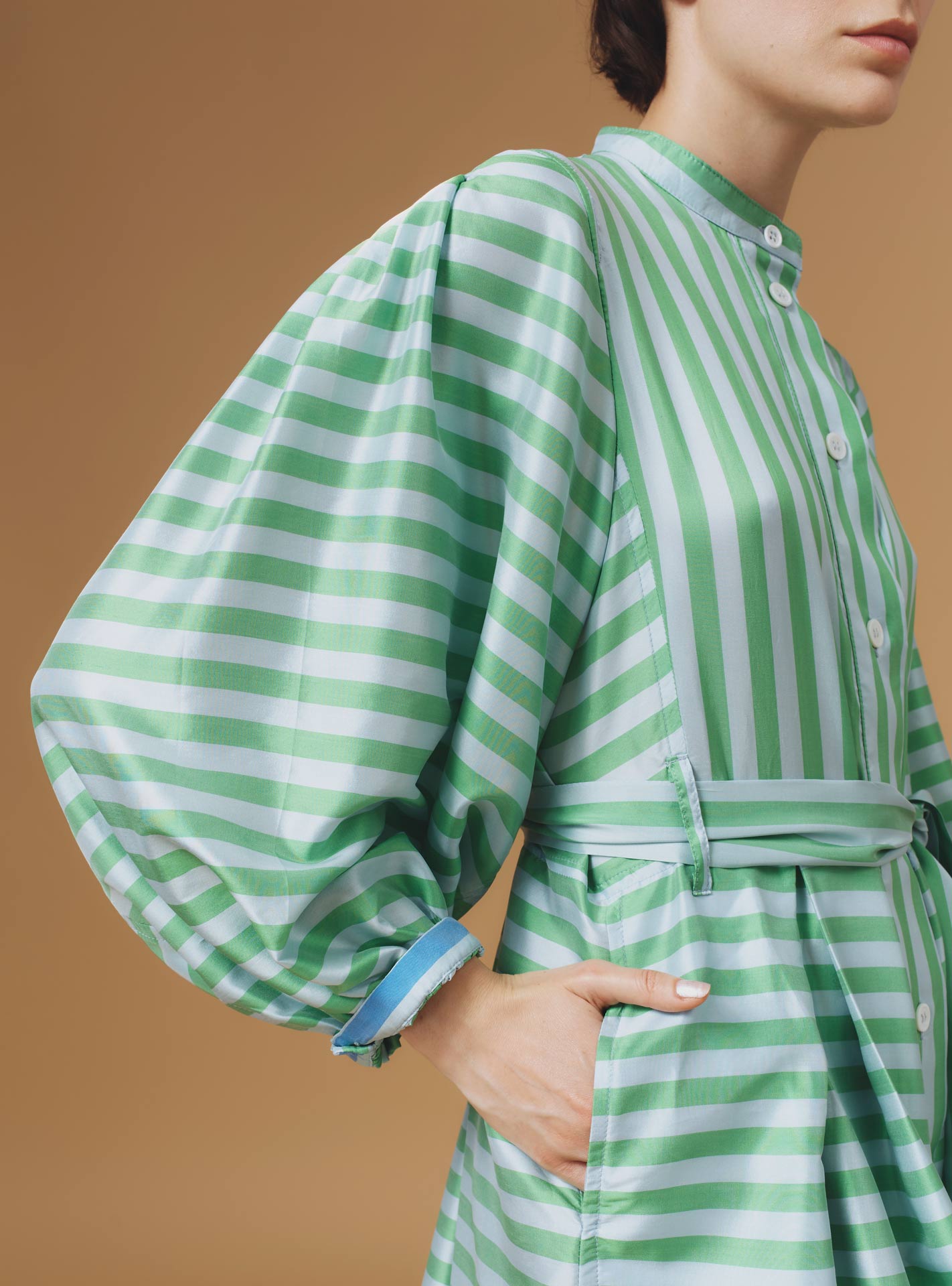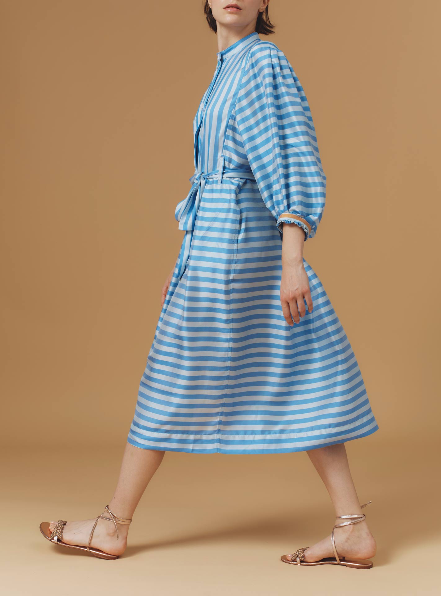 The Yvonne midi coat-dress, seeming so classic at first glance, is twisted with its dramatic sleeves inspired by the Stuart period: this is what makes it unique.
